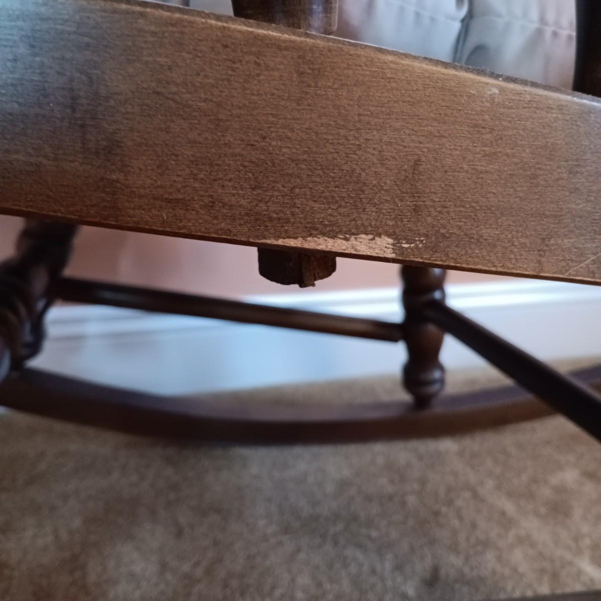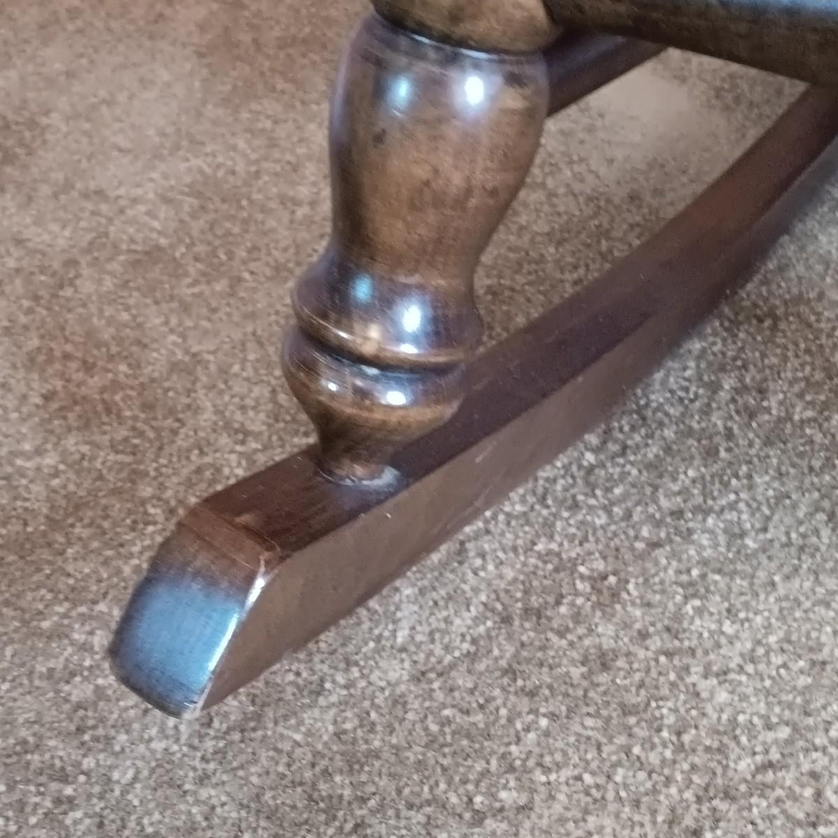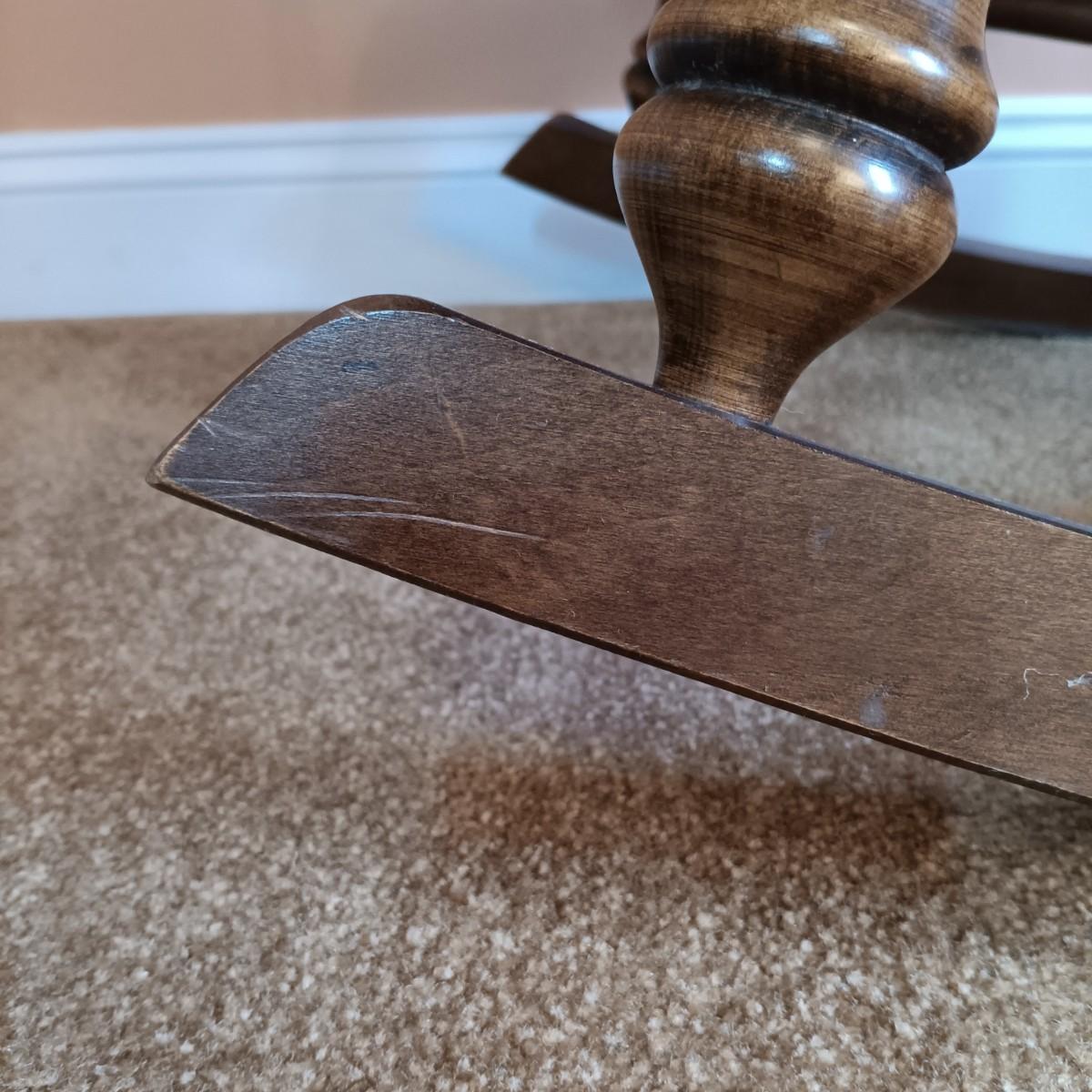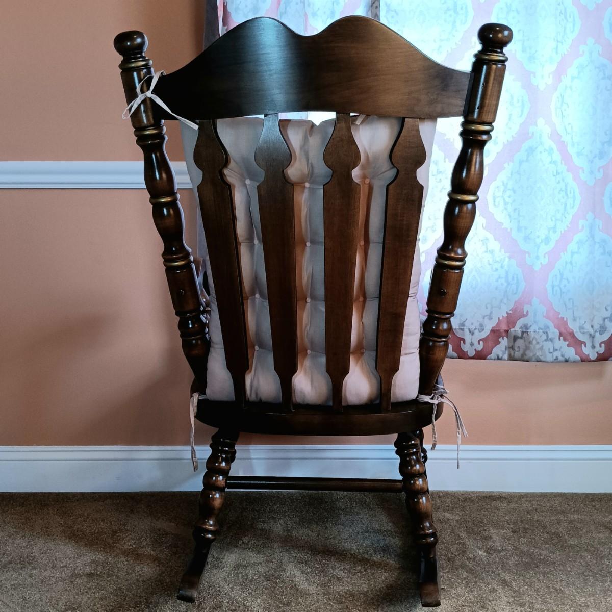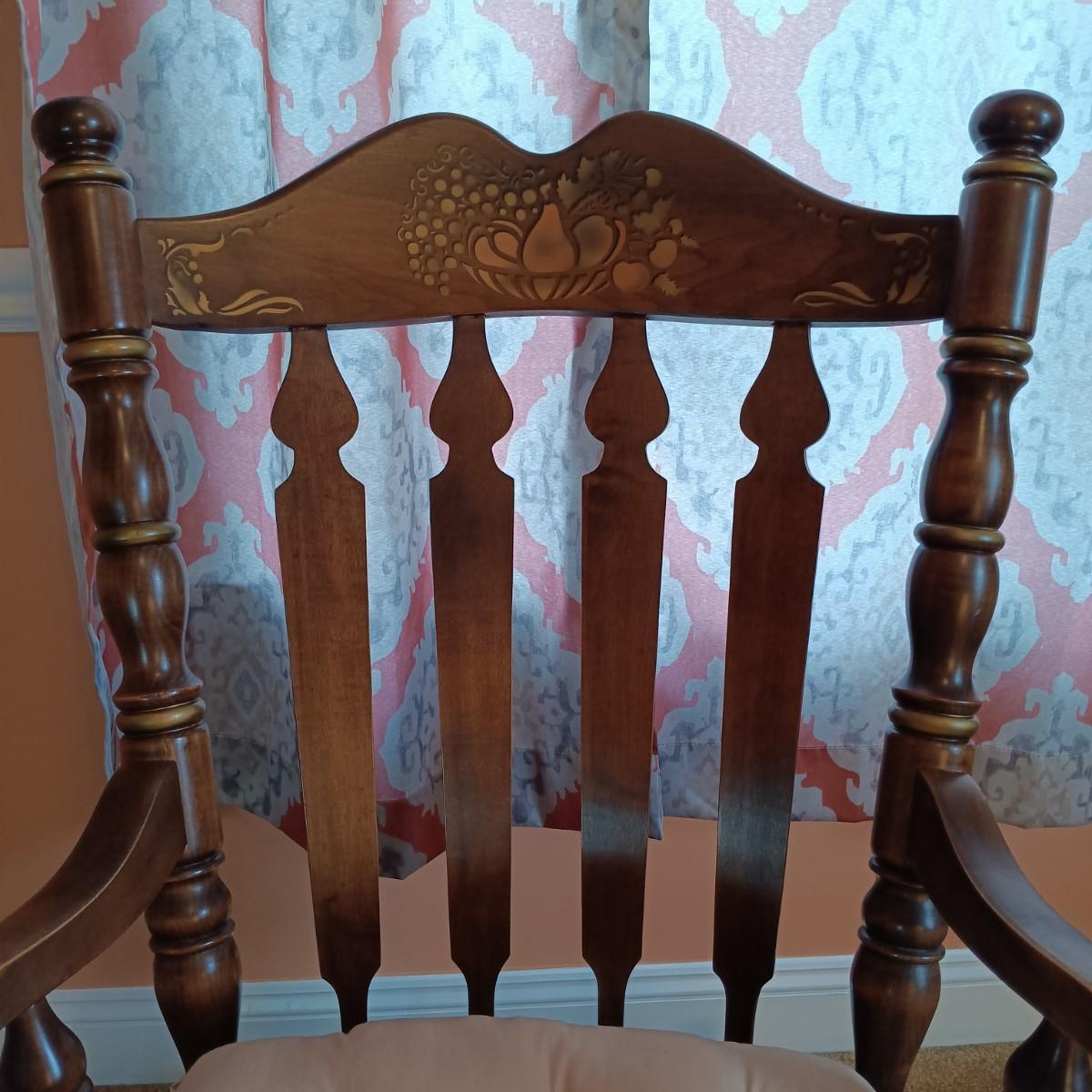 LOT5-O: Sturdy Wood Rocking Chair with Cushion; Pie Crust Table with Brass Style Lamp