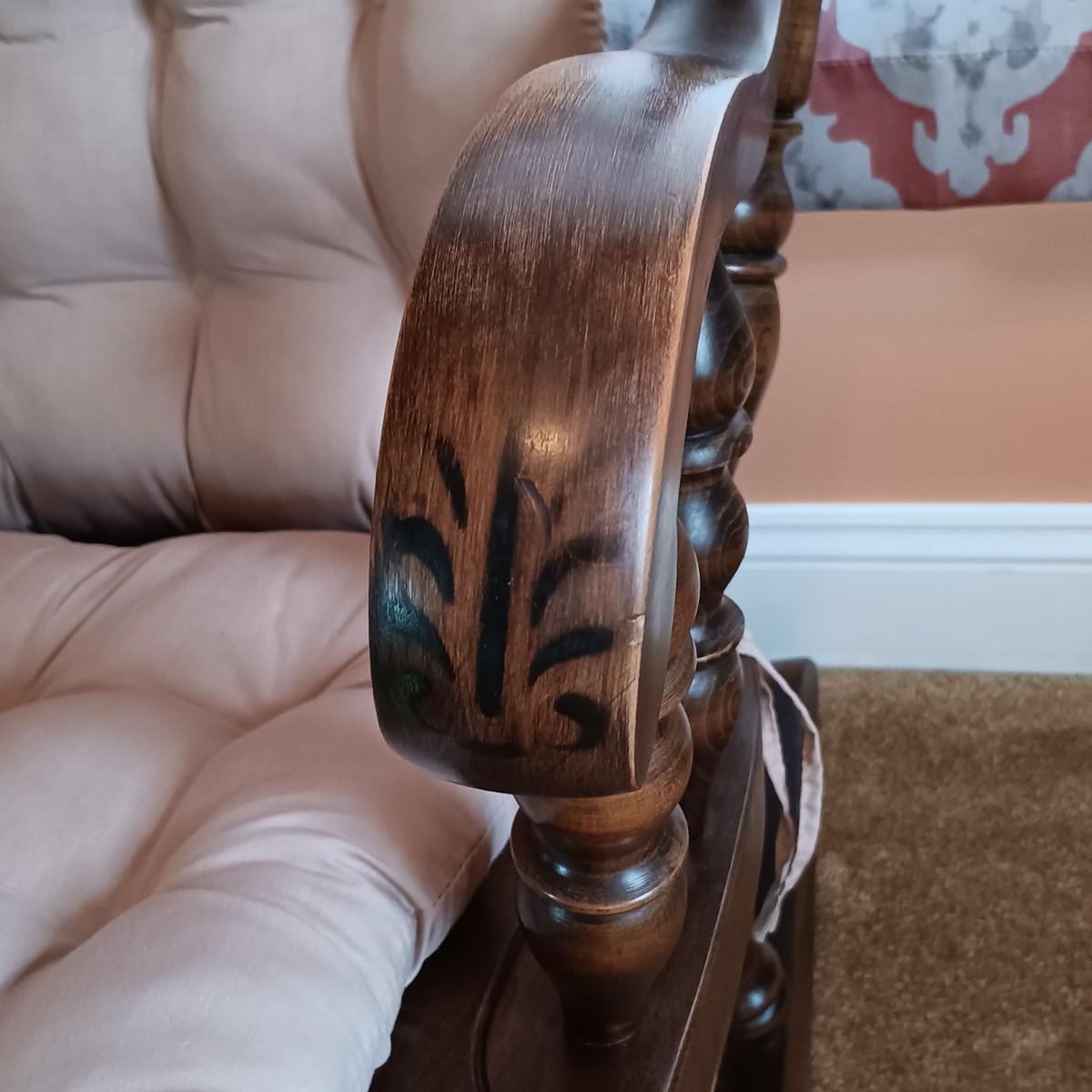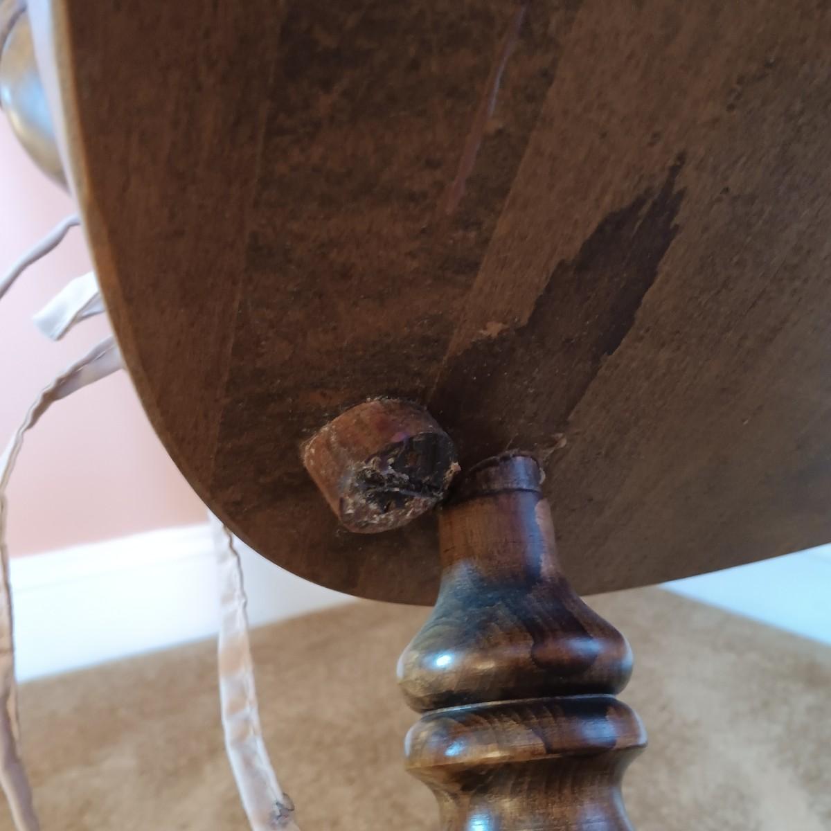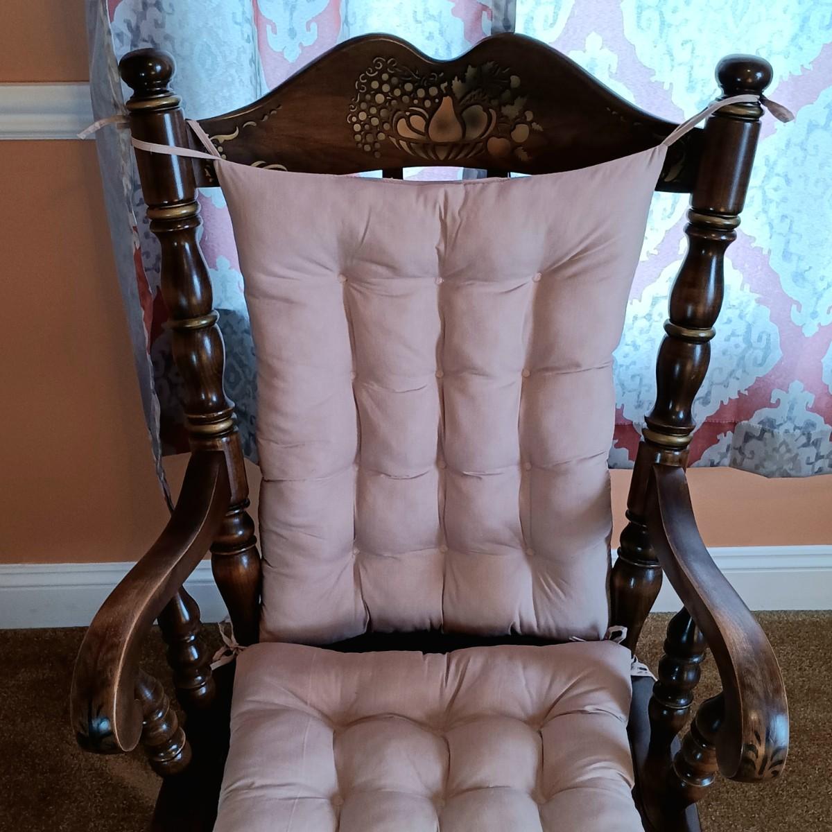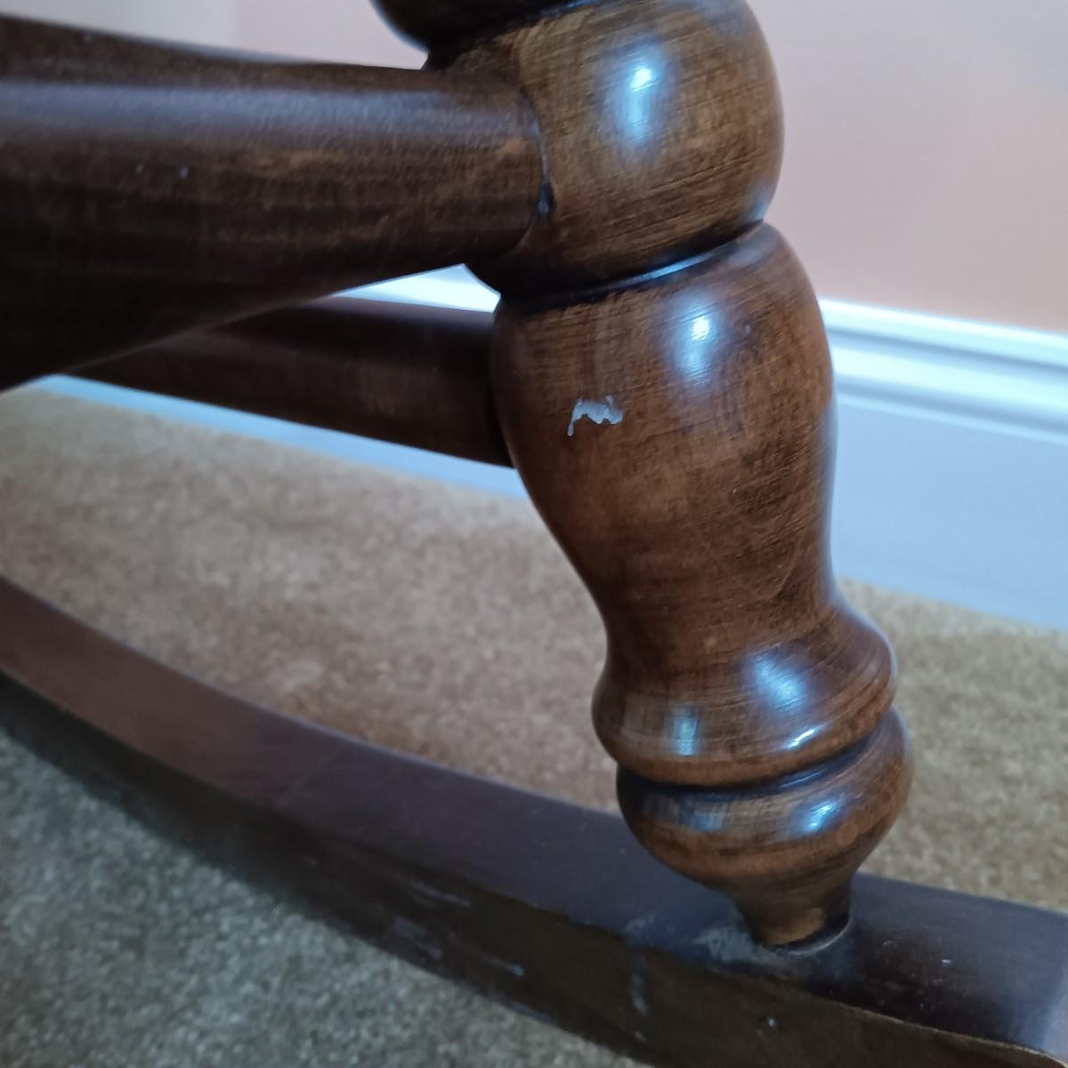 LOT5-O: Sturdy Wood Rocking Chair with Cushion; Pie Crust Table with Brass Style Lamp