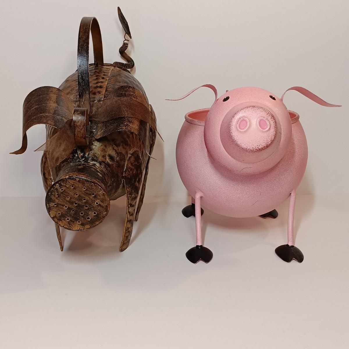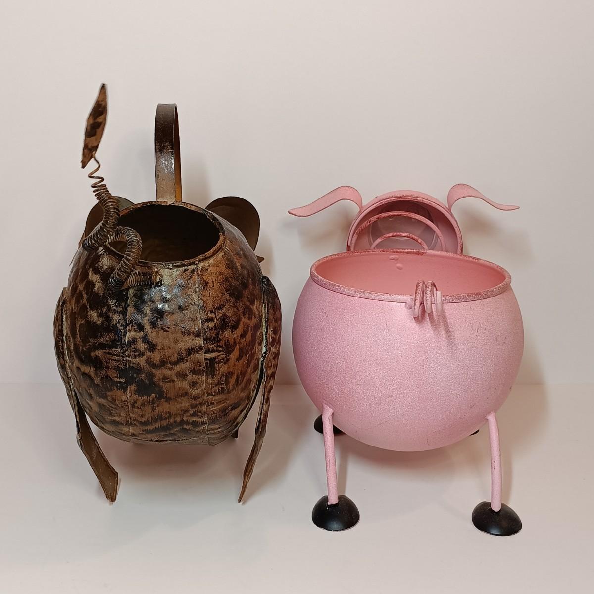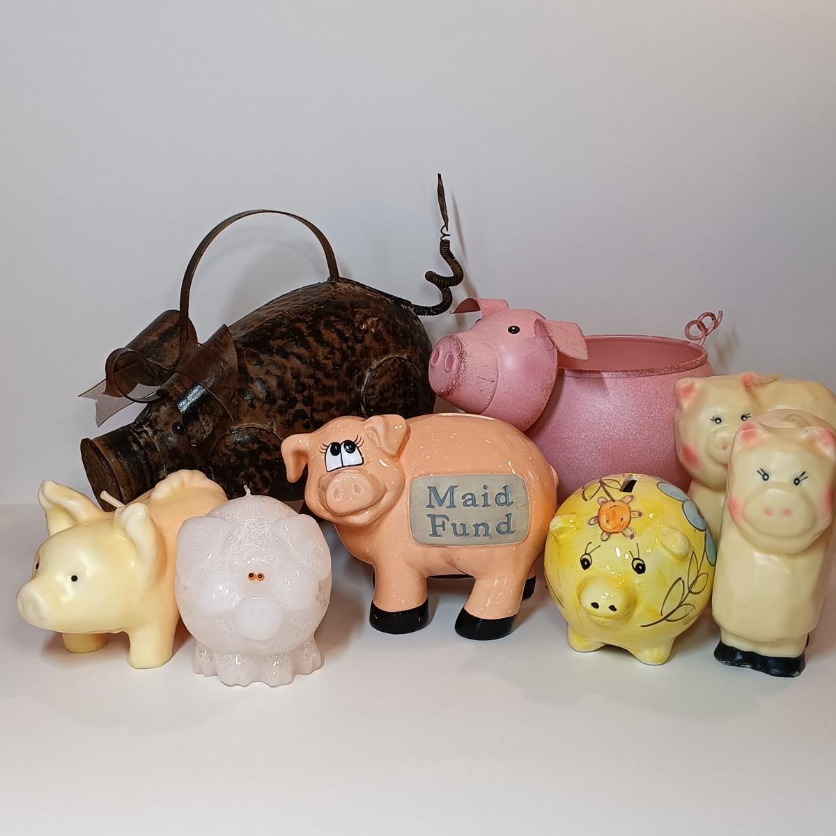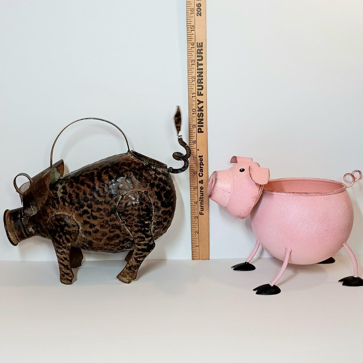 LOT19-O: Cute Pig Collection including Metal Watering Can, Planter, Candles and Banks