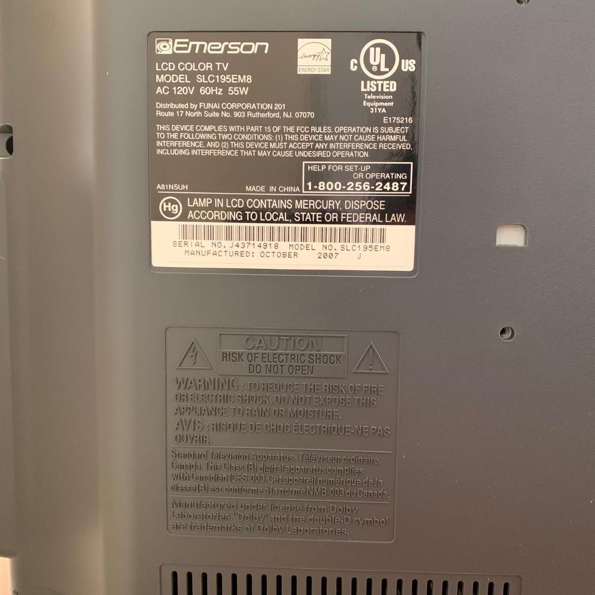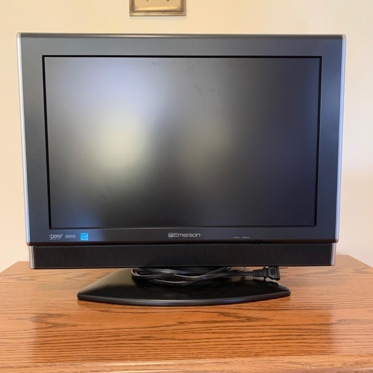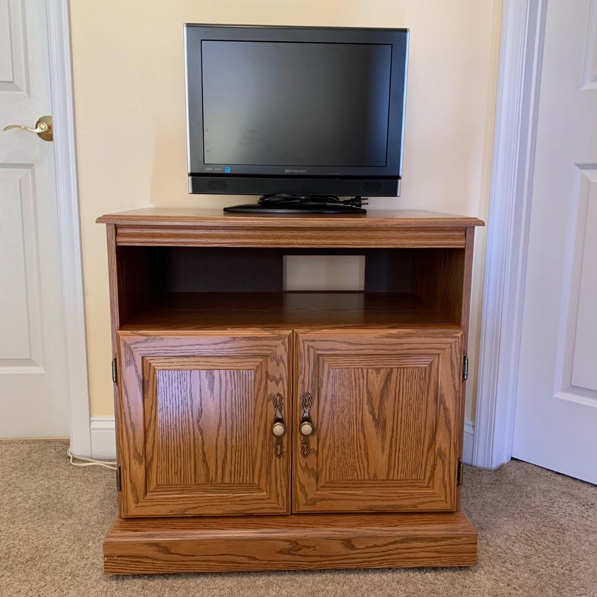 LOT 67 G: Emerson LCD Color TV Model Number SLC195EM8 W/ Rolling TV & Media Cabinet W/ Storage