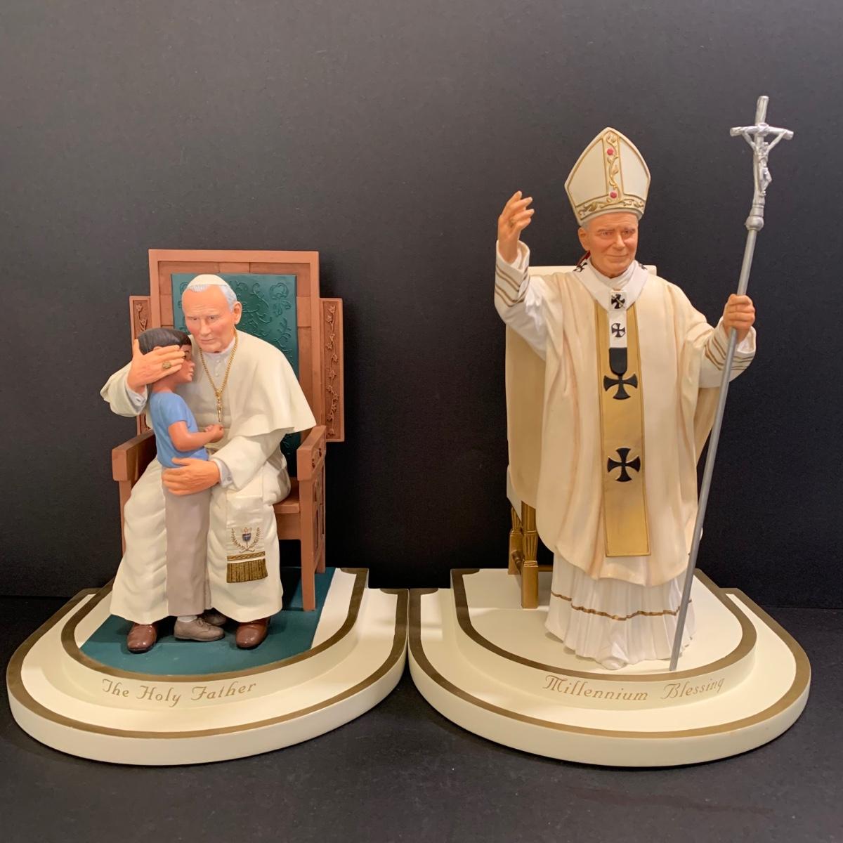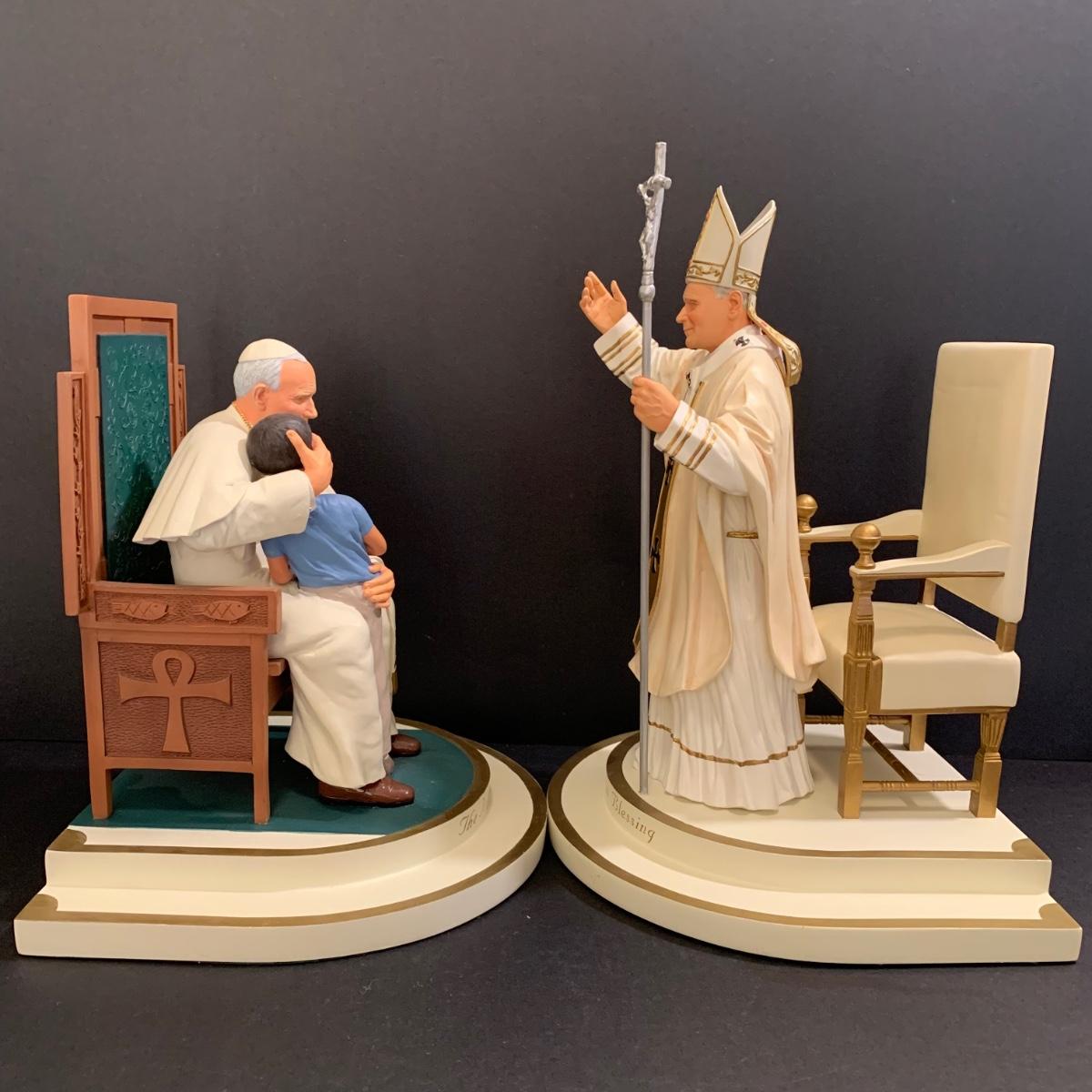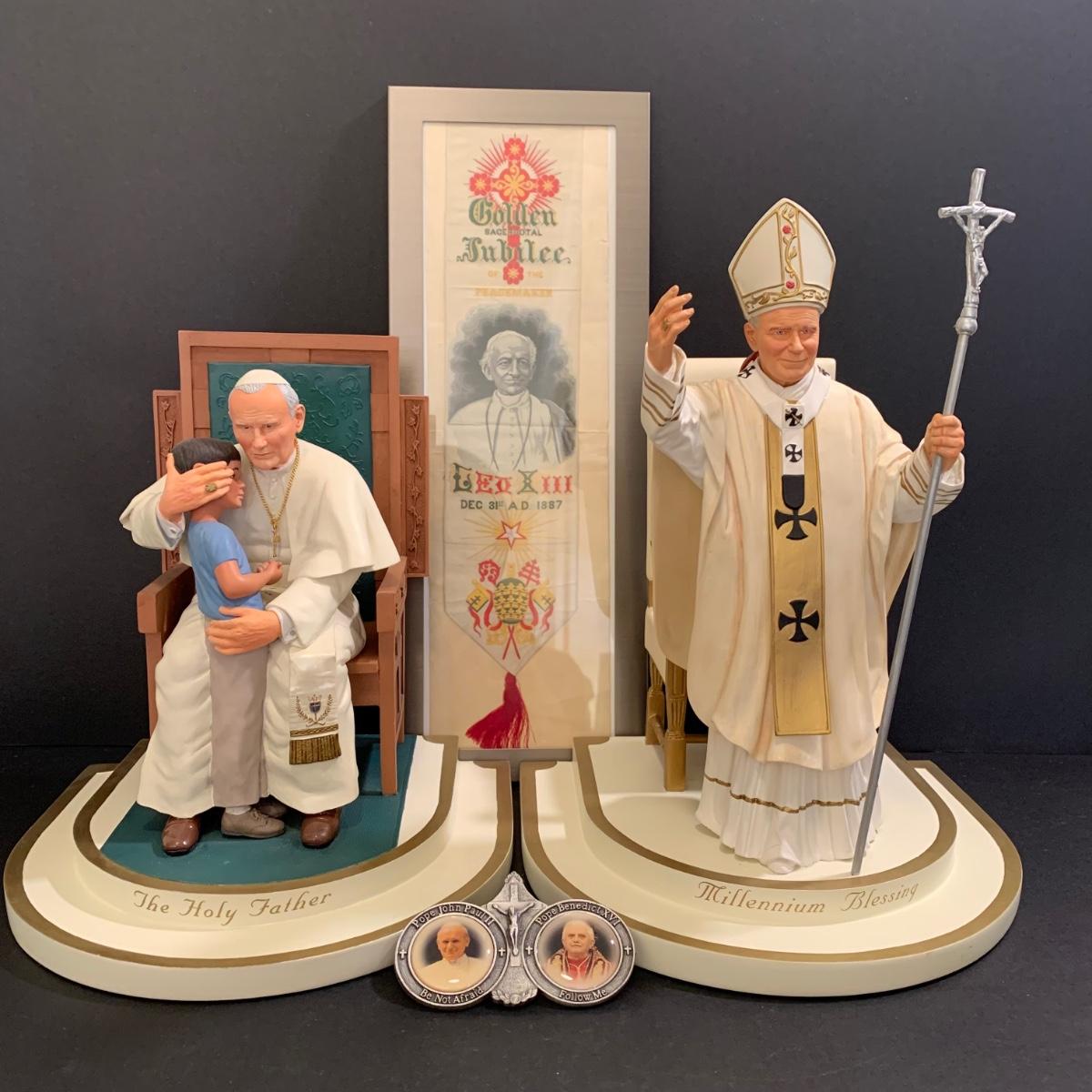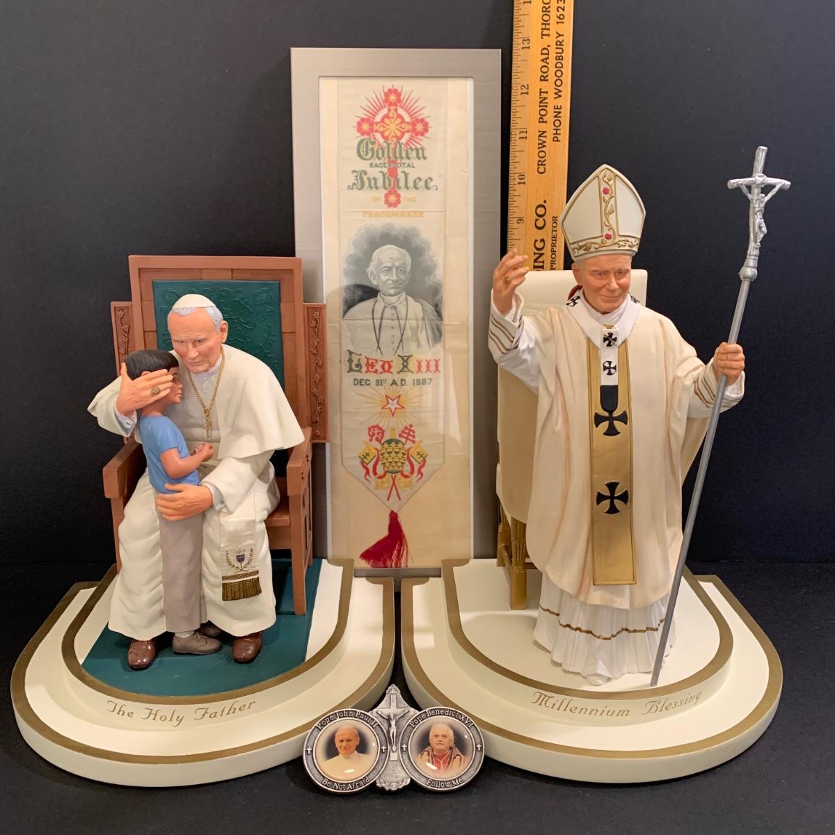 LOT 79 FB: "The Holy Father" & Millennium Blessing" Sculptures From The Danbury Mint, Pope John Paul II & Benedict XVI Photo Clip, & Golden Jubilee Ribbon For Pope Leo XII