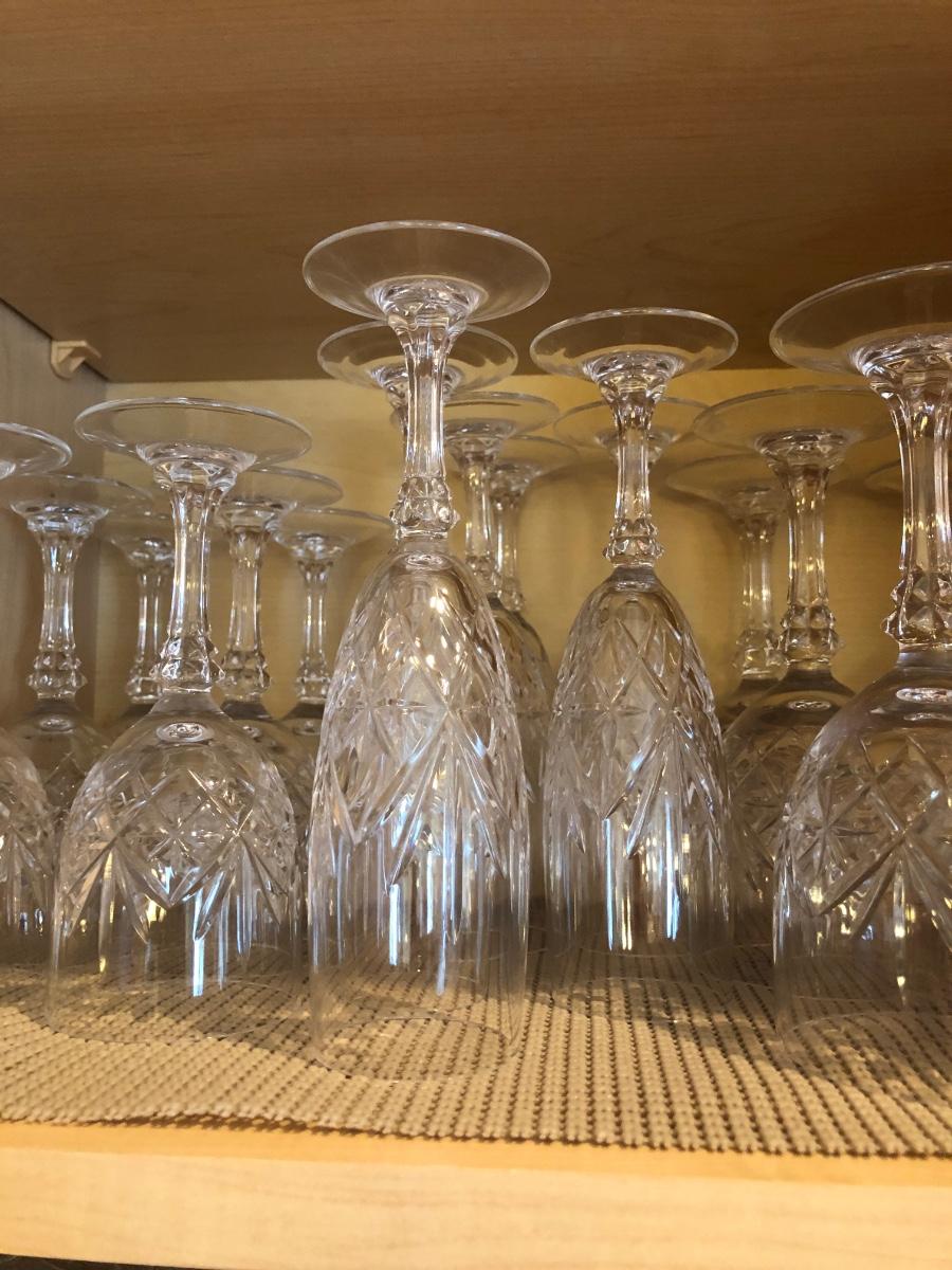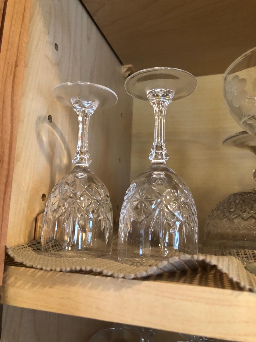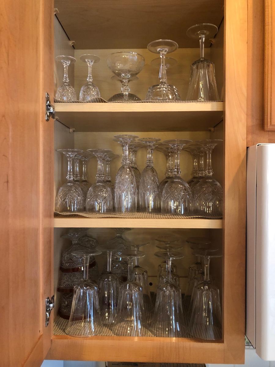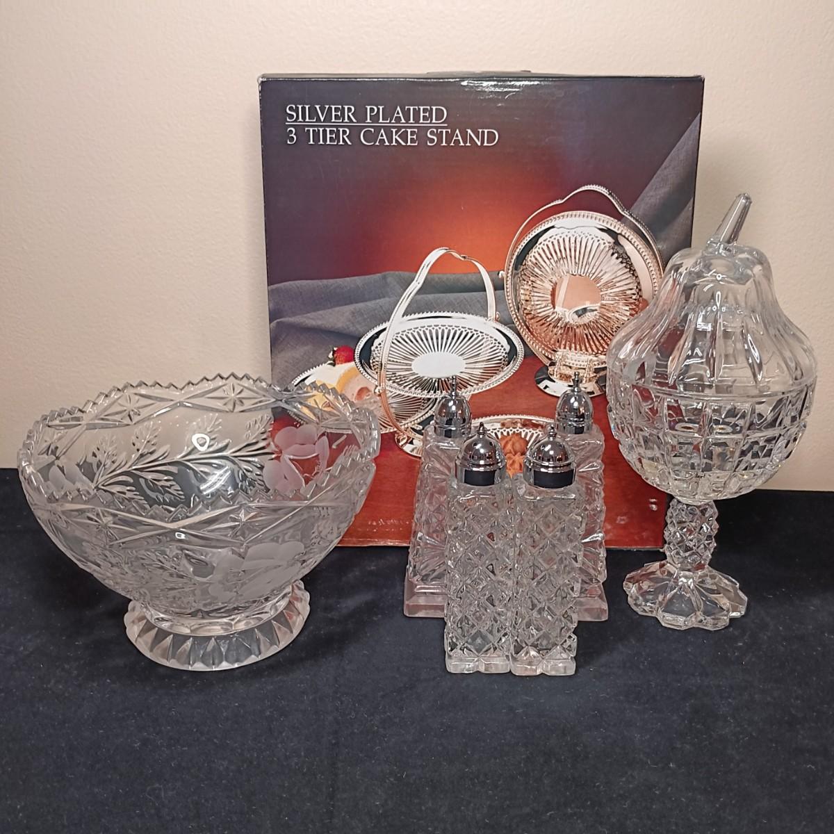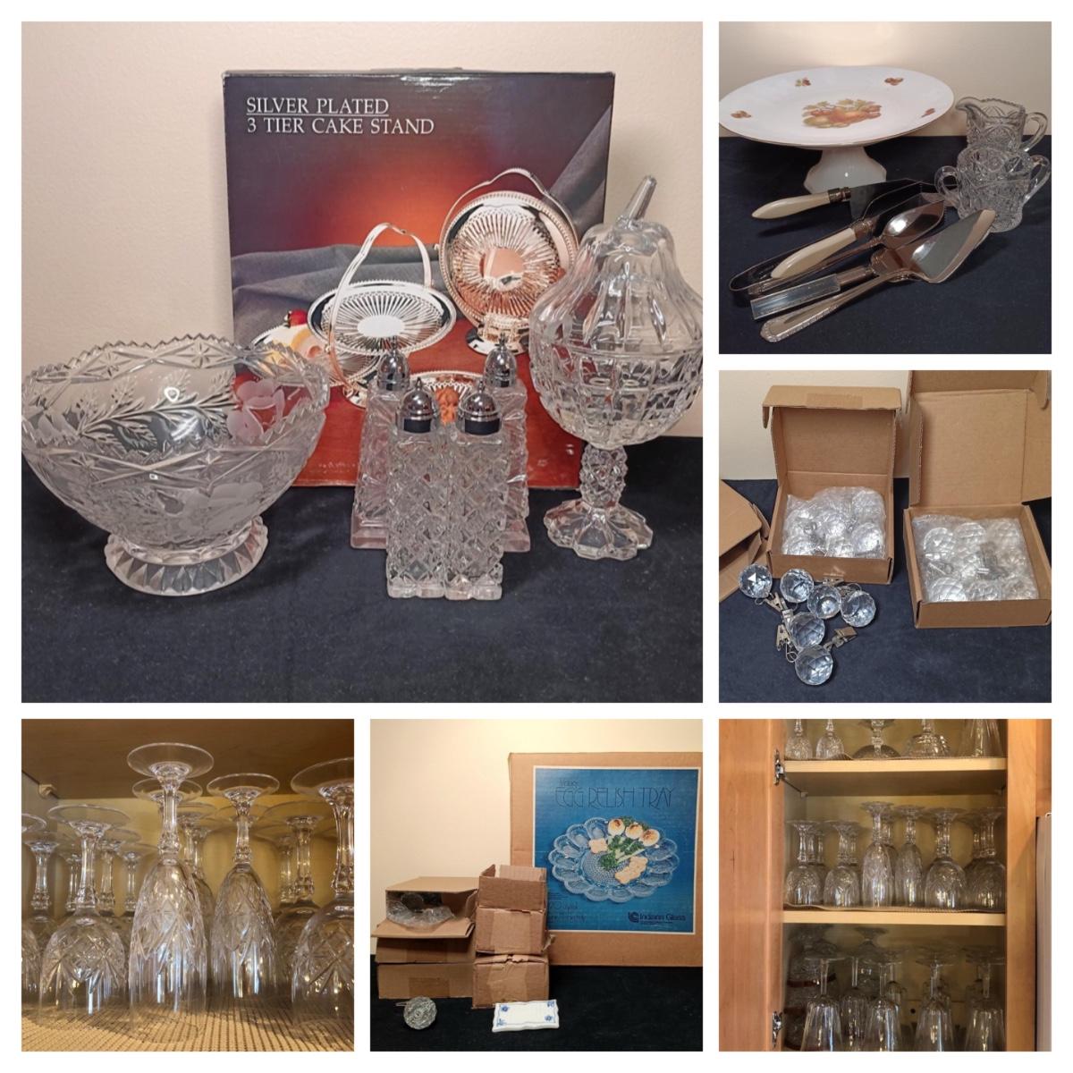 LOT 89K: Cabinet of Stemmed Glassware, Crystal Serving Dishes, Crystal Tablecloth Holders Cake Plates, Serving Ware & More