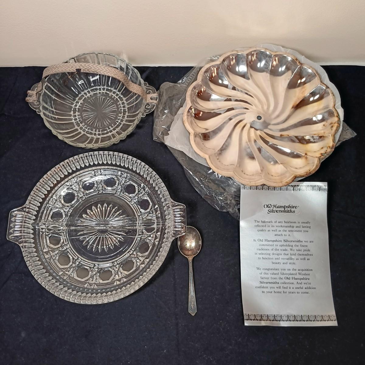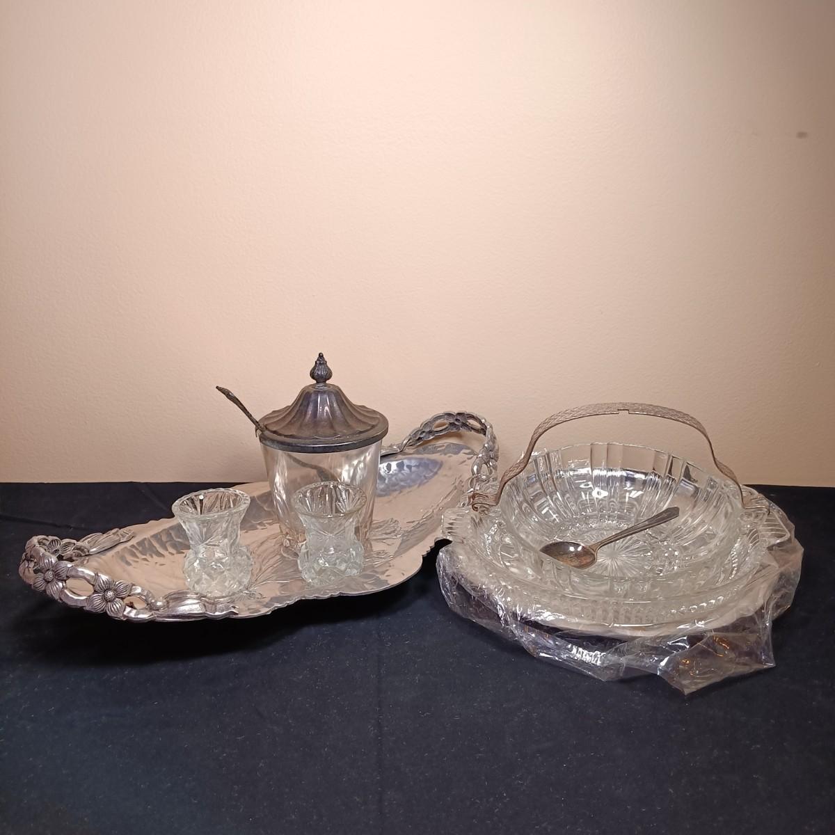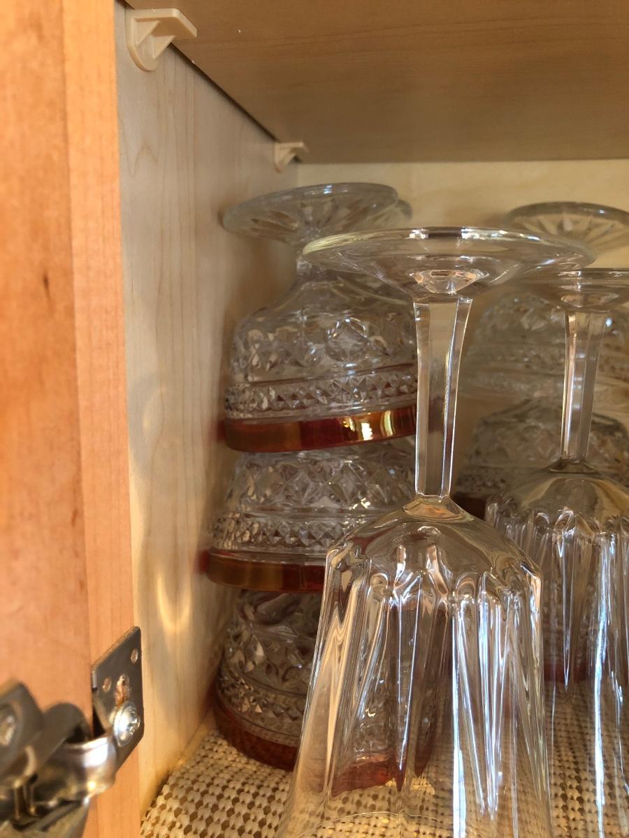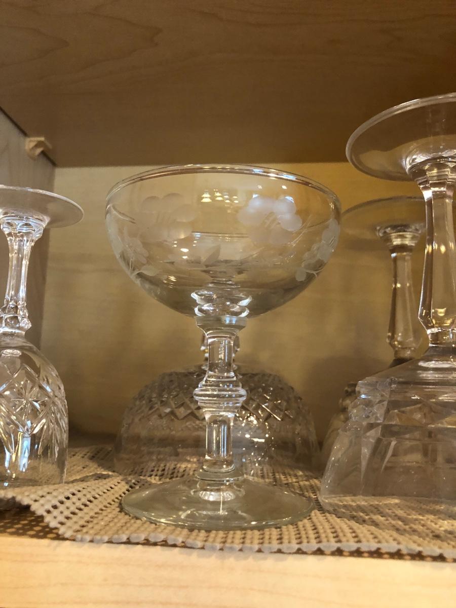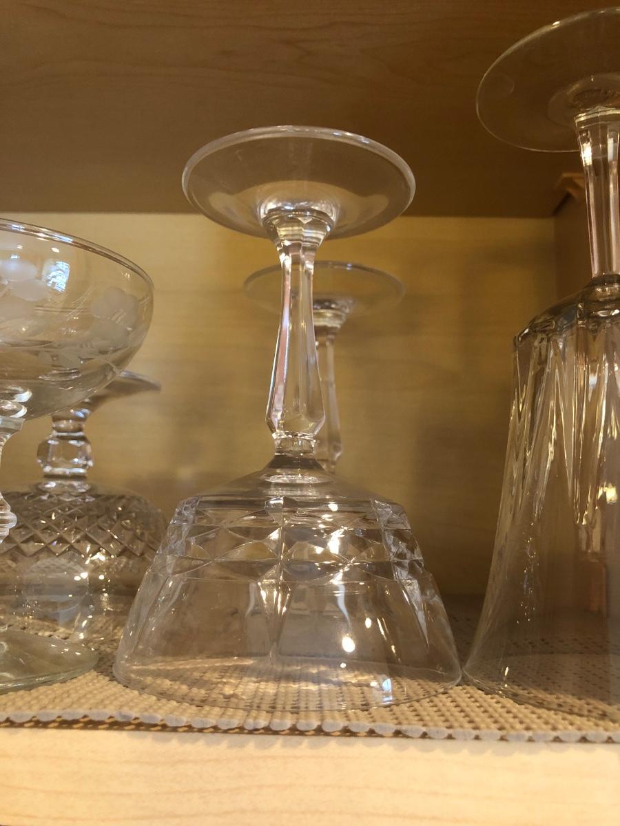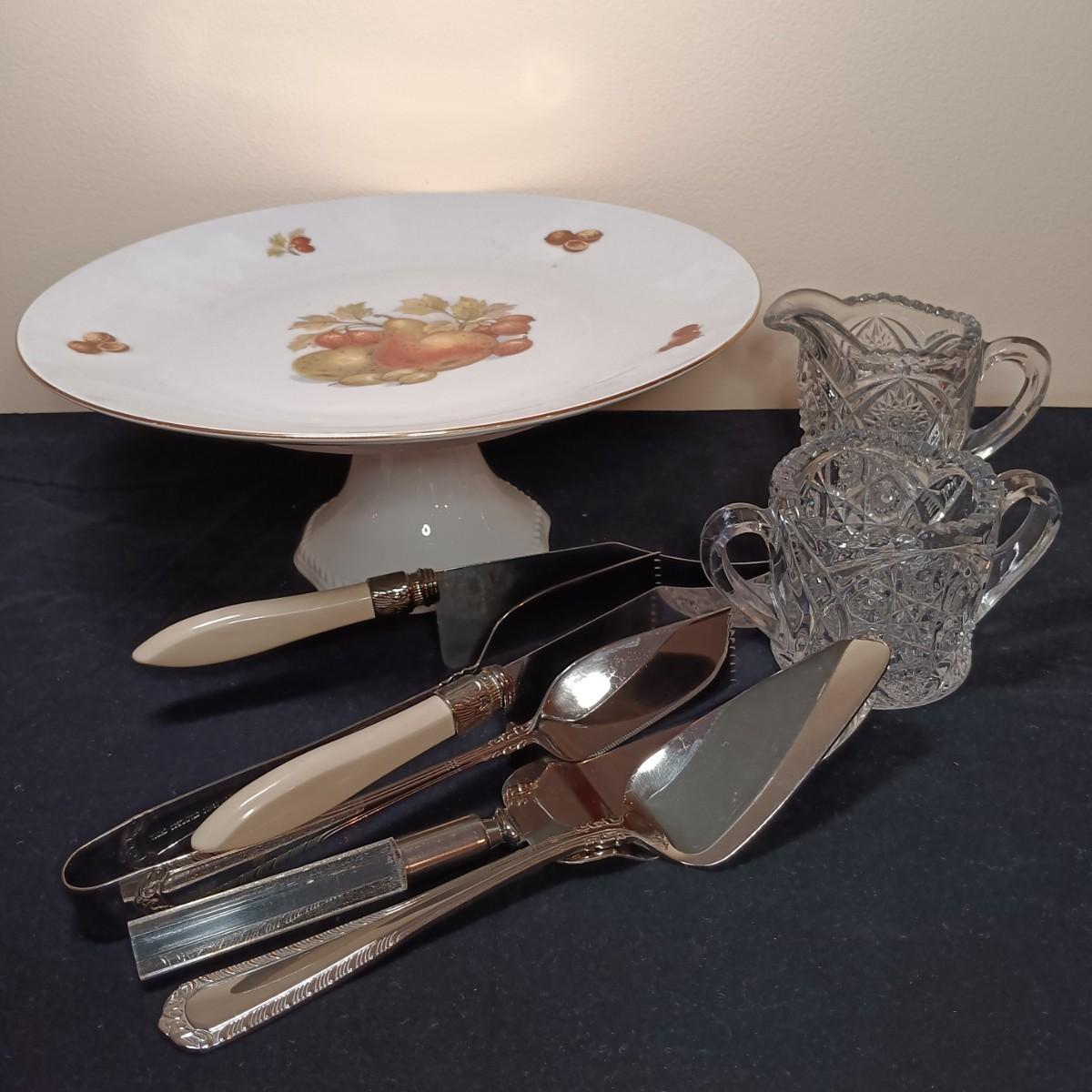 LOT 89K: Cabinet of Stemmed Glassware, Crystal Serving Dishes, Crystal Tablecloth Holders Cake Plates, Serving Ware & More