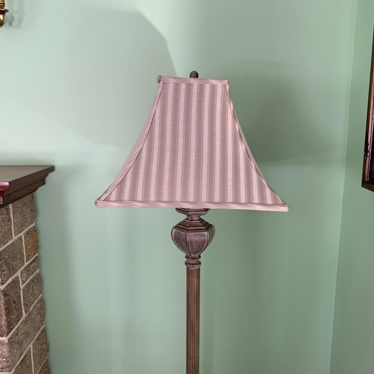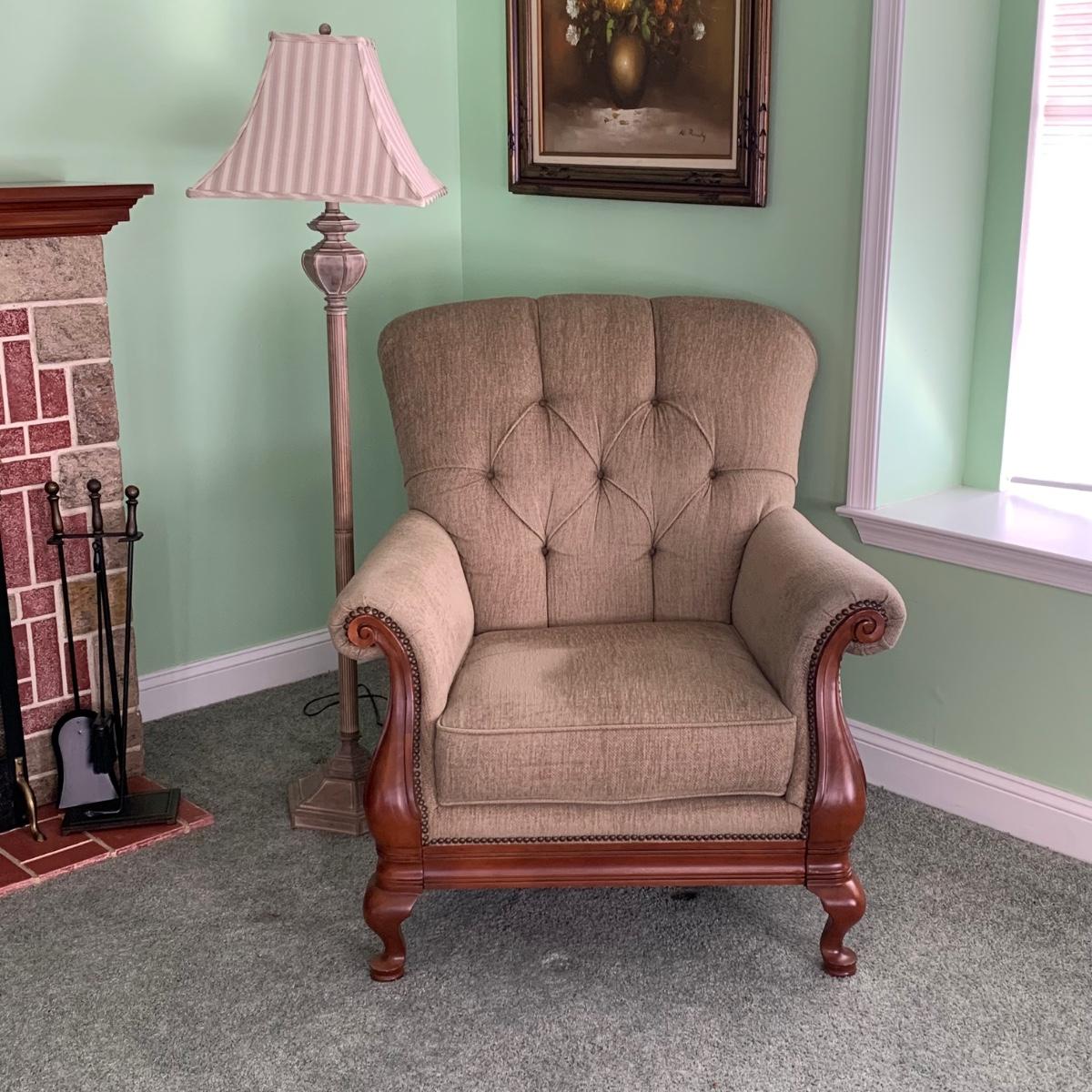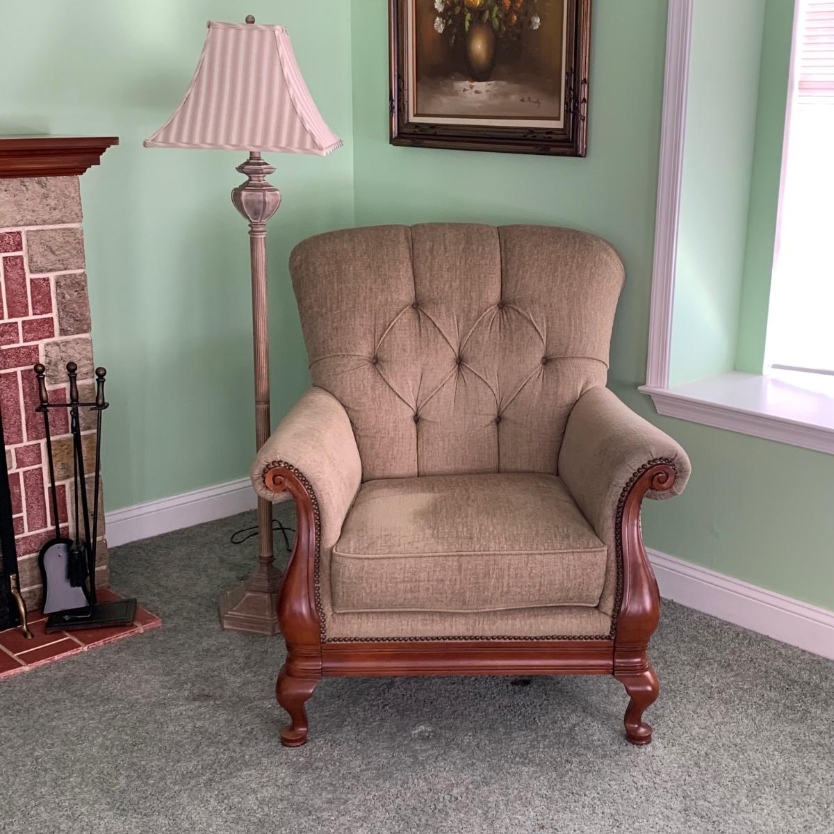 LOT 121L: Pre-Loved Upholstered Chair in Tan & Ceramic Based Floor Lamp