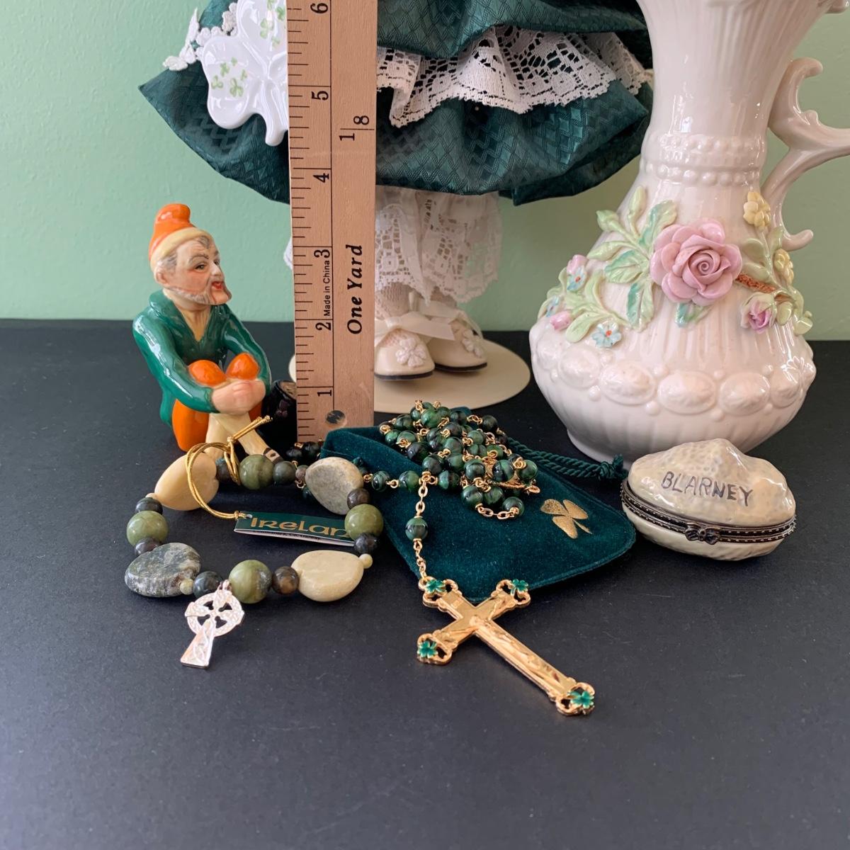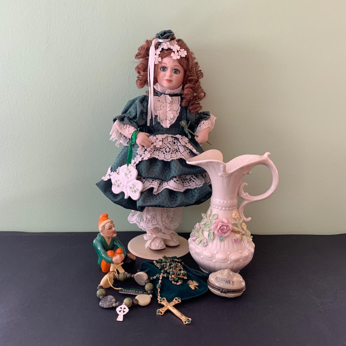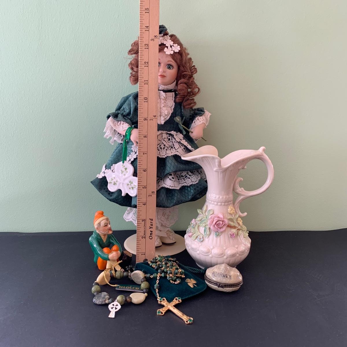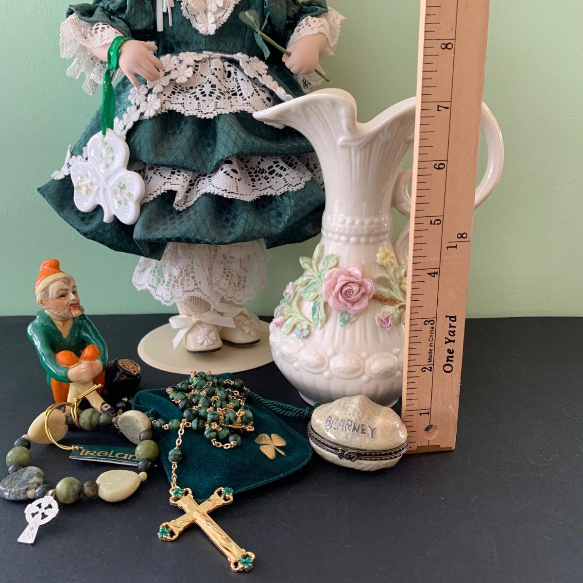 LOT 124L: Irish Collection: Belleek Pitcher/Vase, MZ Ireland Leprechaun, Connemara Marble Stretch Bracelet,Rosaries,Musical Porcelain Doll