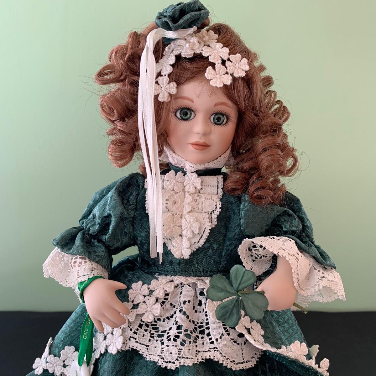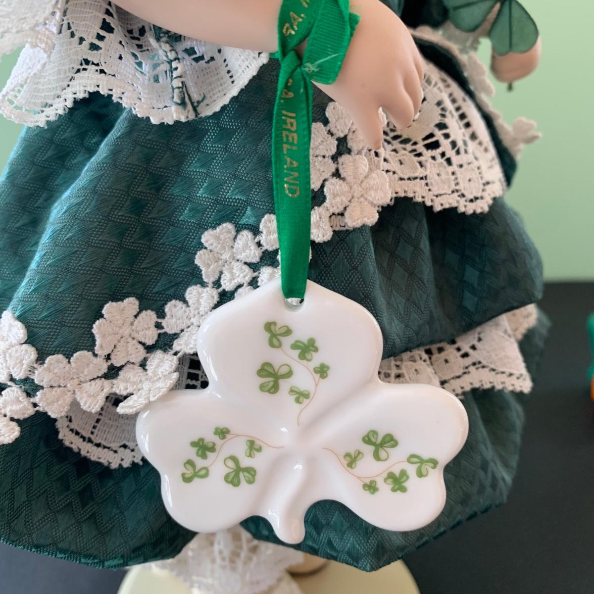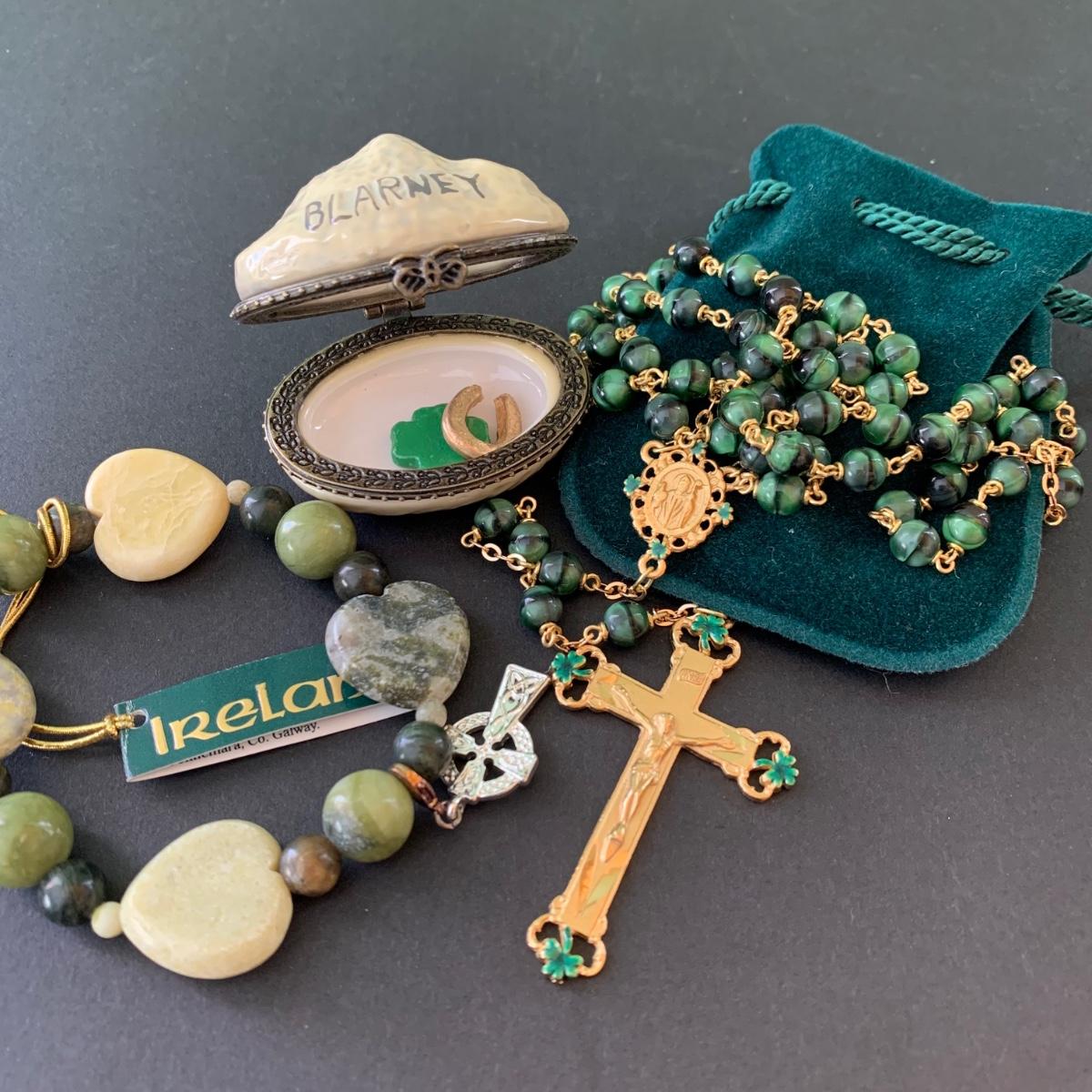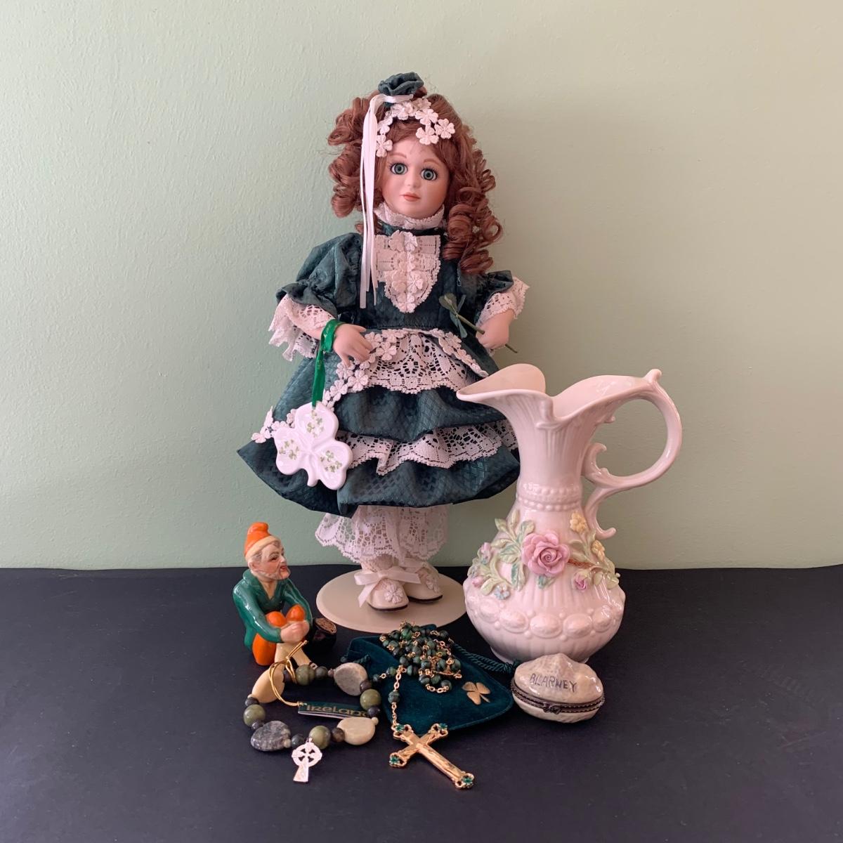 LOT 124L: Irish Collection: Belleek Pitcher/Vase, MZ Ireland Leprechaun, Connemara Marble Stretch Bracelet,Rosaries,Musical Porcelain Doll