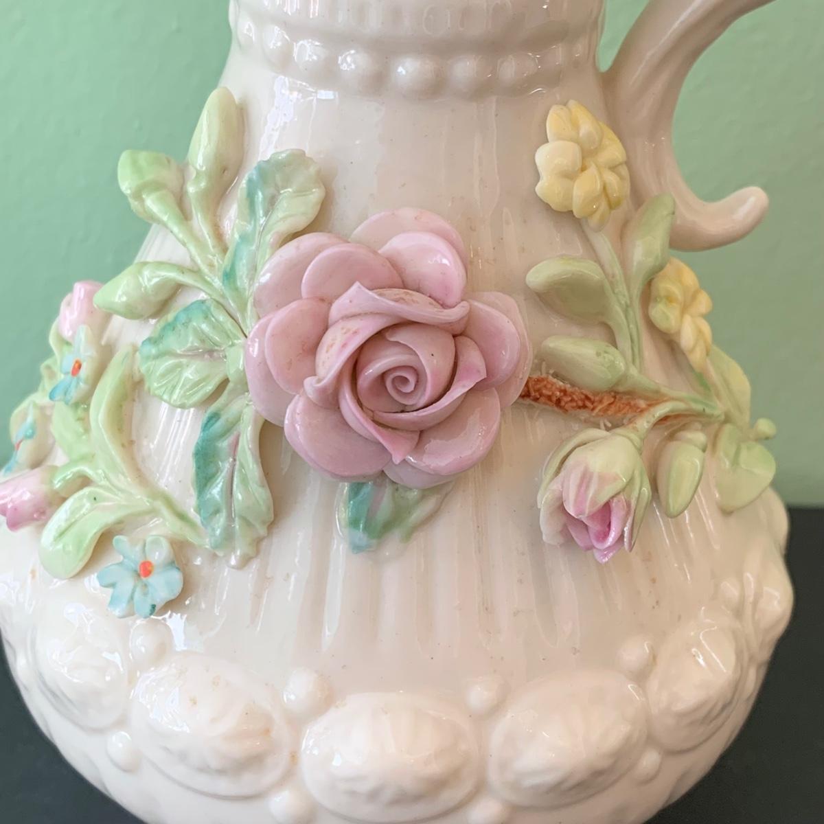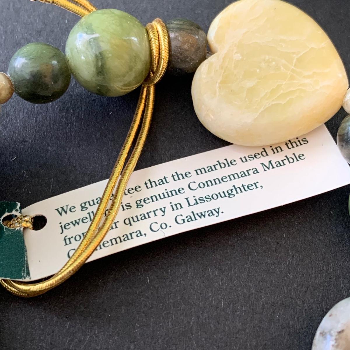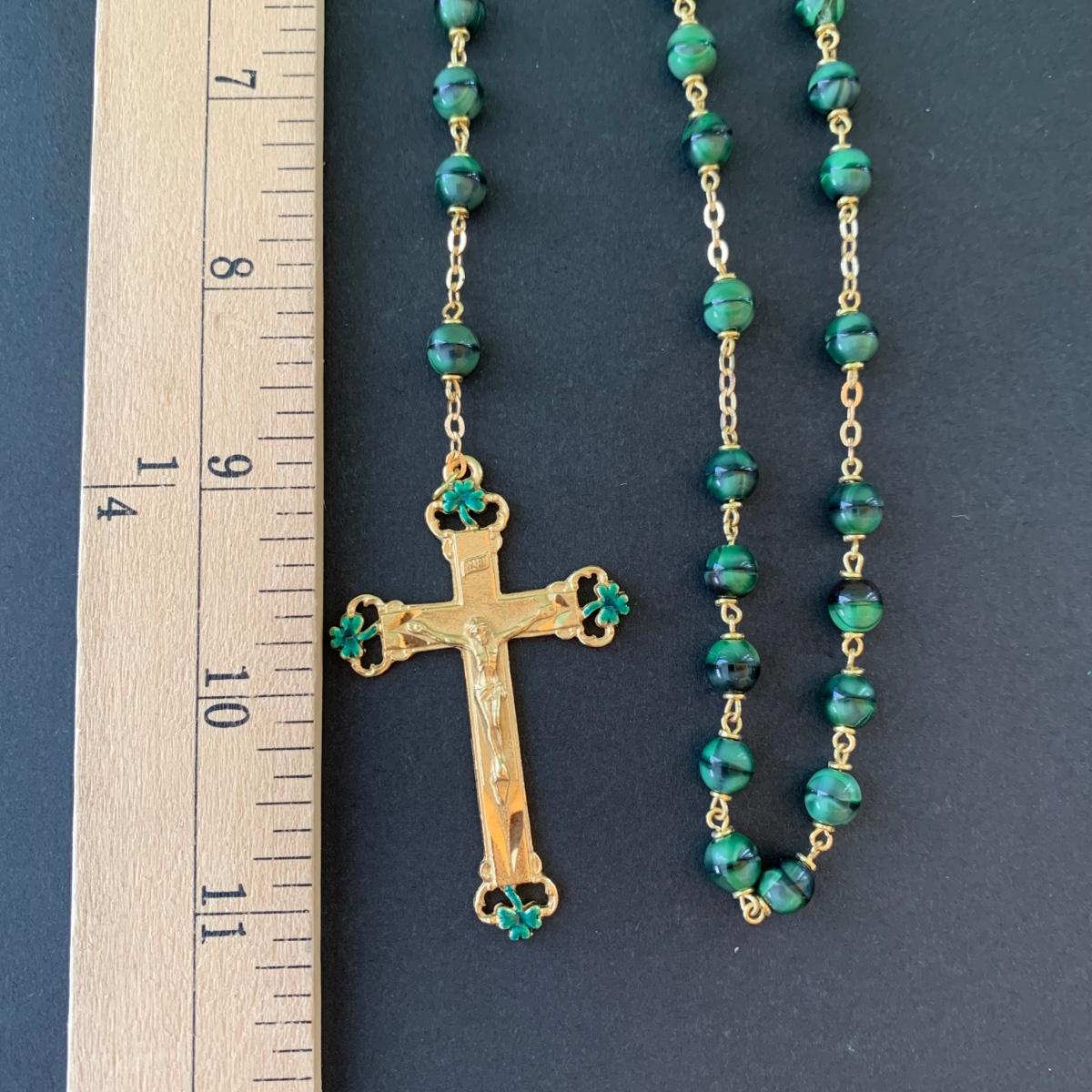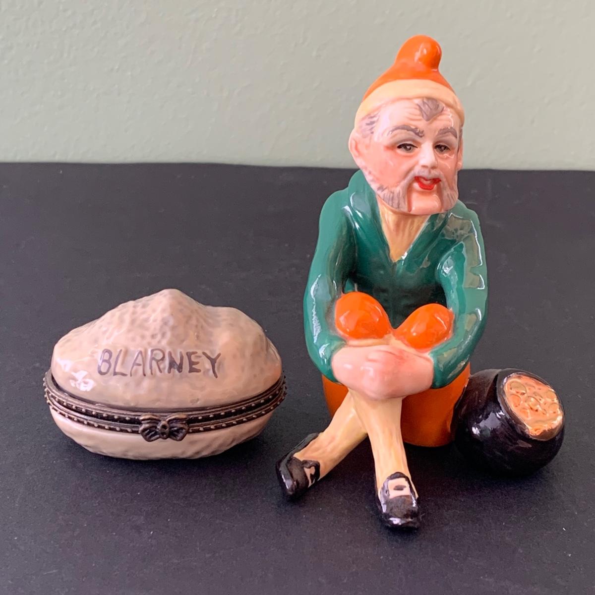 LOT 124L: Irish Collection: Belleek Pitcher/Vase, MZ Ireland Leprechaun, Connemara Marble Stretch Bracelet,Rosaries,Musical Porcelain Doll