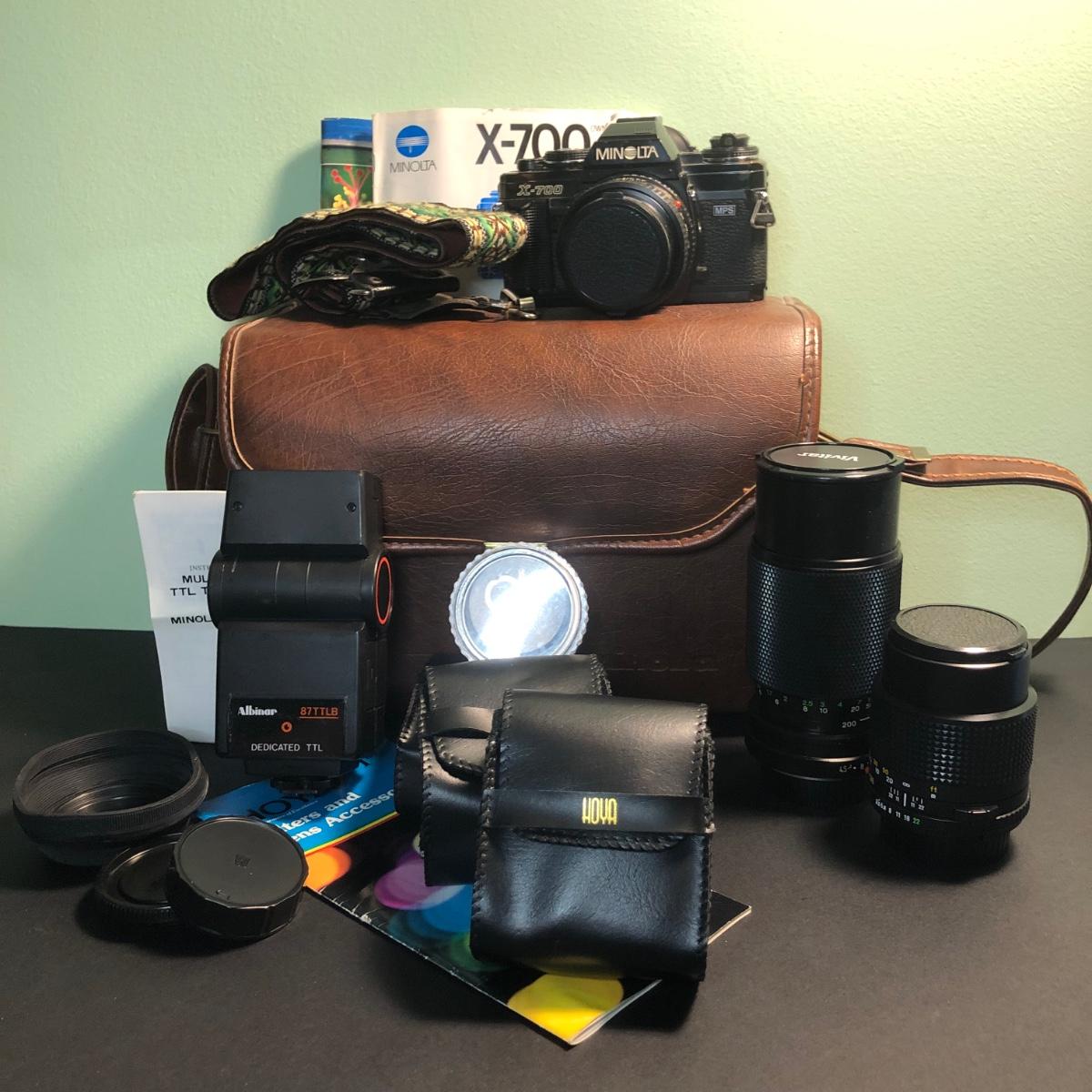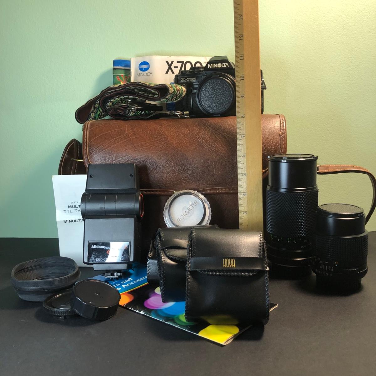 LOT 141FB: Vintage Minolta X-700 35mm Film Camera w/ 3 Lenses, Minolta Branded Camera Bag, Hoya Filters & More Accessories