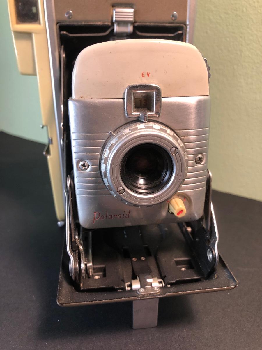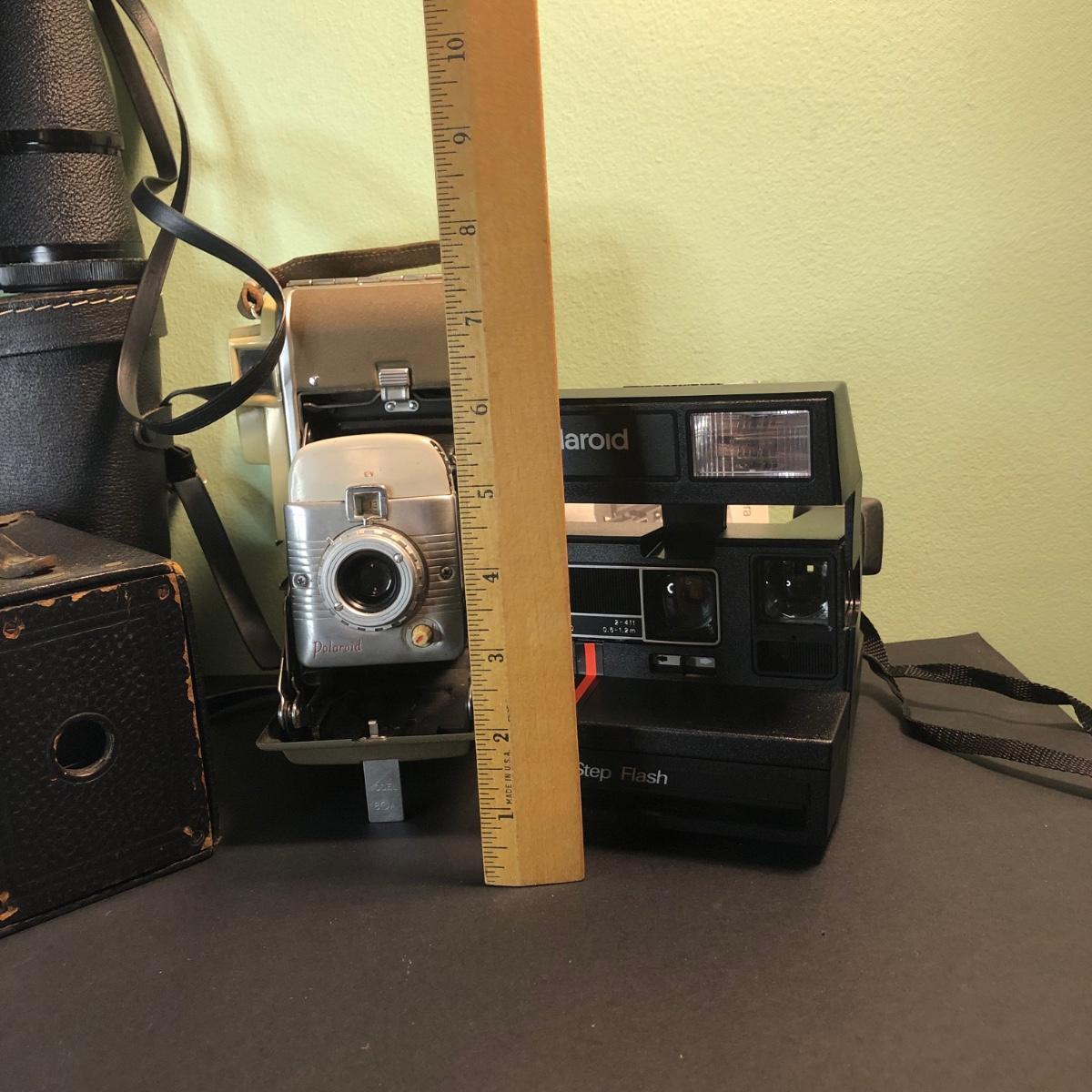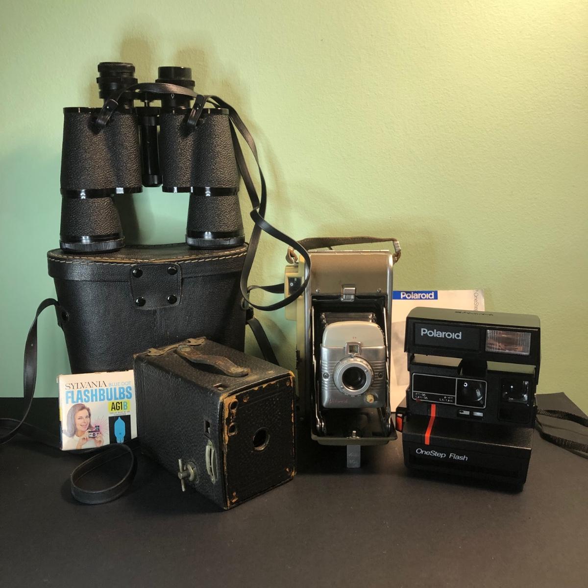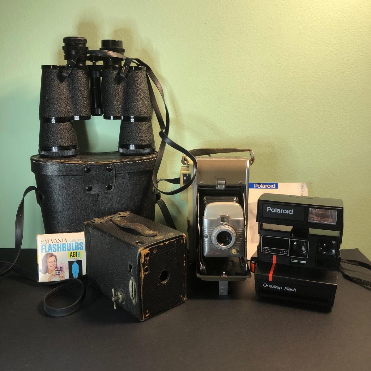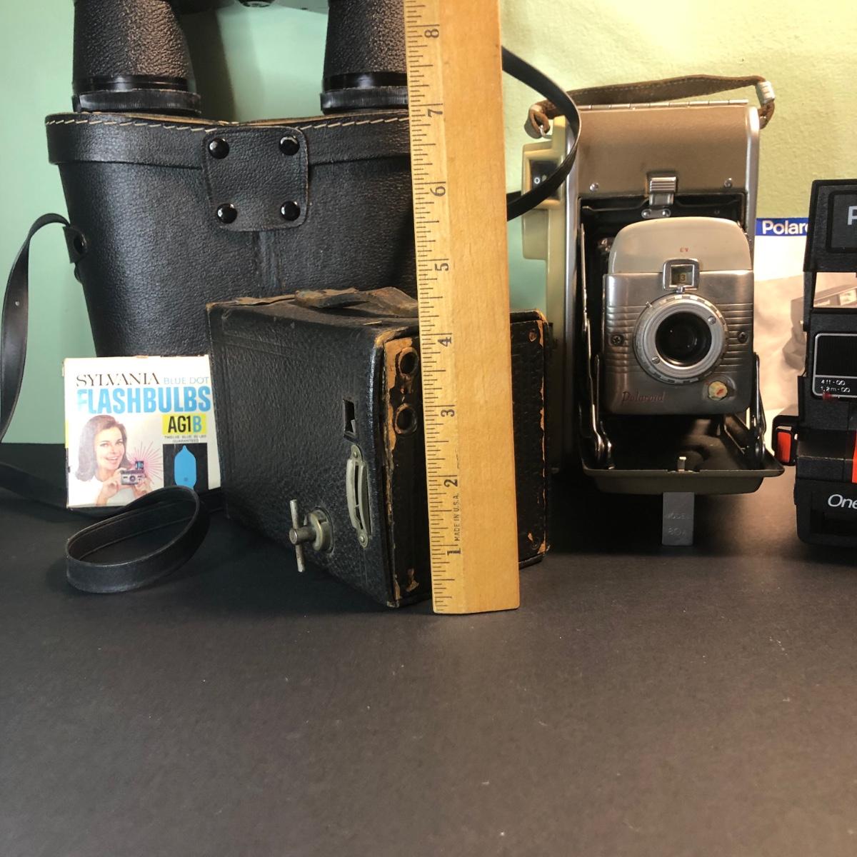 LOT 142MBC: Vintage Cameras & More - Polaroid Folding Model 80A, Kodak No. 2 Brownie Box, Polaroid OneStep Flash & Stellar Binoculars w/ Case