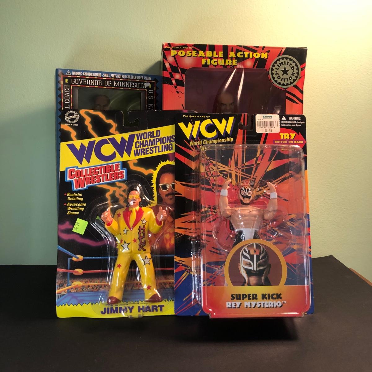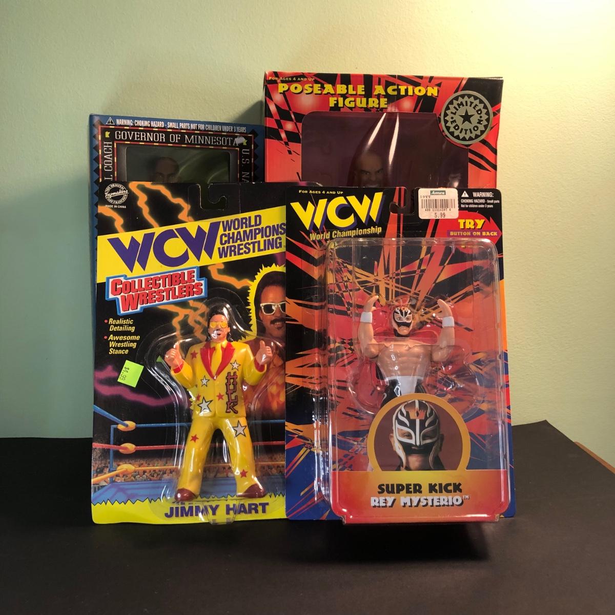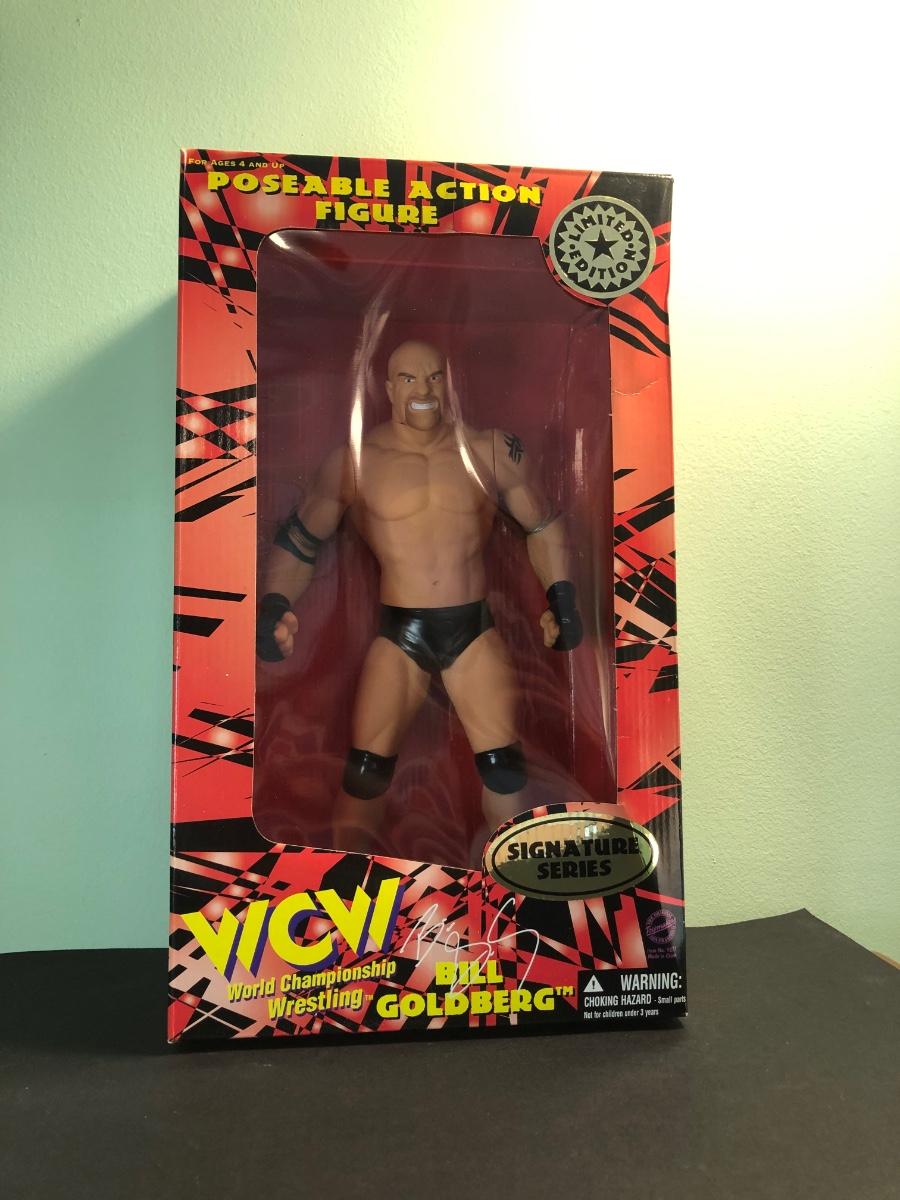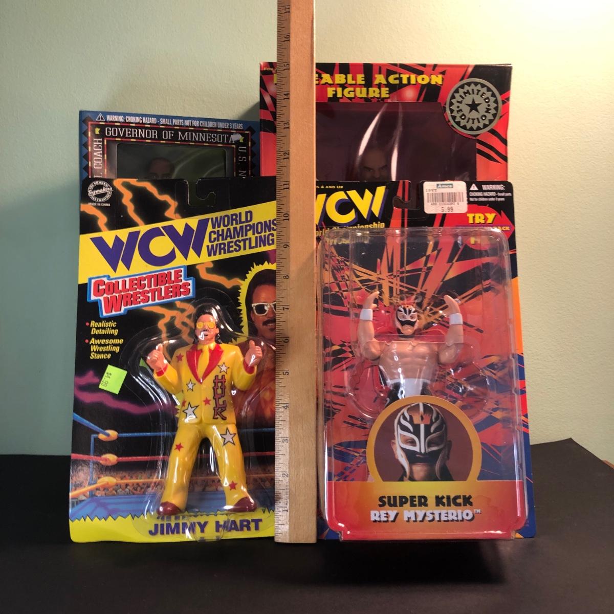 LOT 158MBC: 1998 Limited Edition Signature Series WCW Bill Goldberg Poseable Action Figure, 1999 Jessie Ventura for Governor of Minnesota Action Figure, WCW Super Kick Rey Mysterio & Jimmy Hart