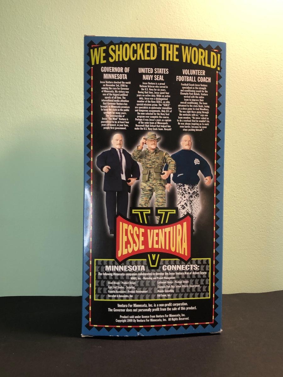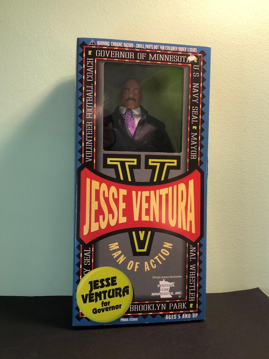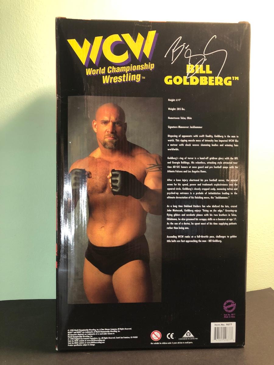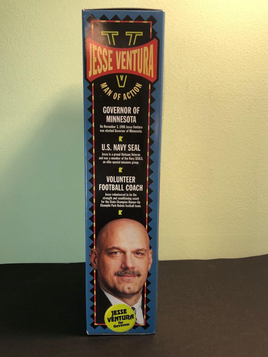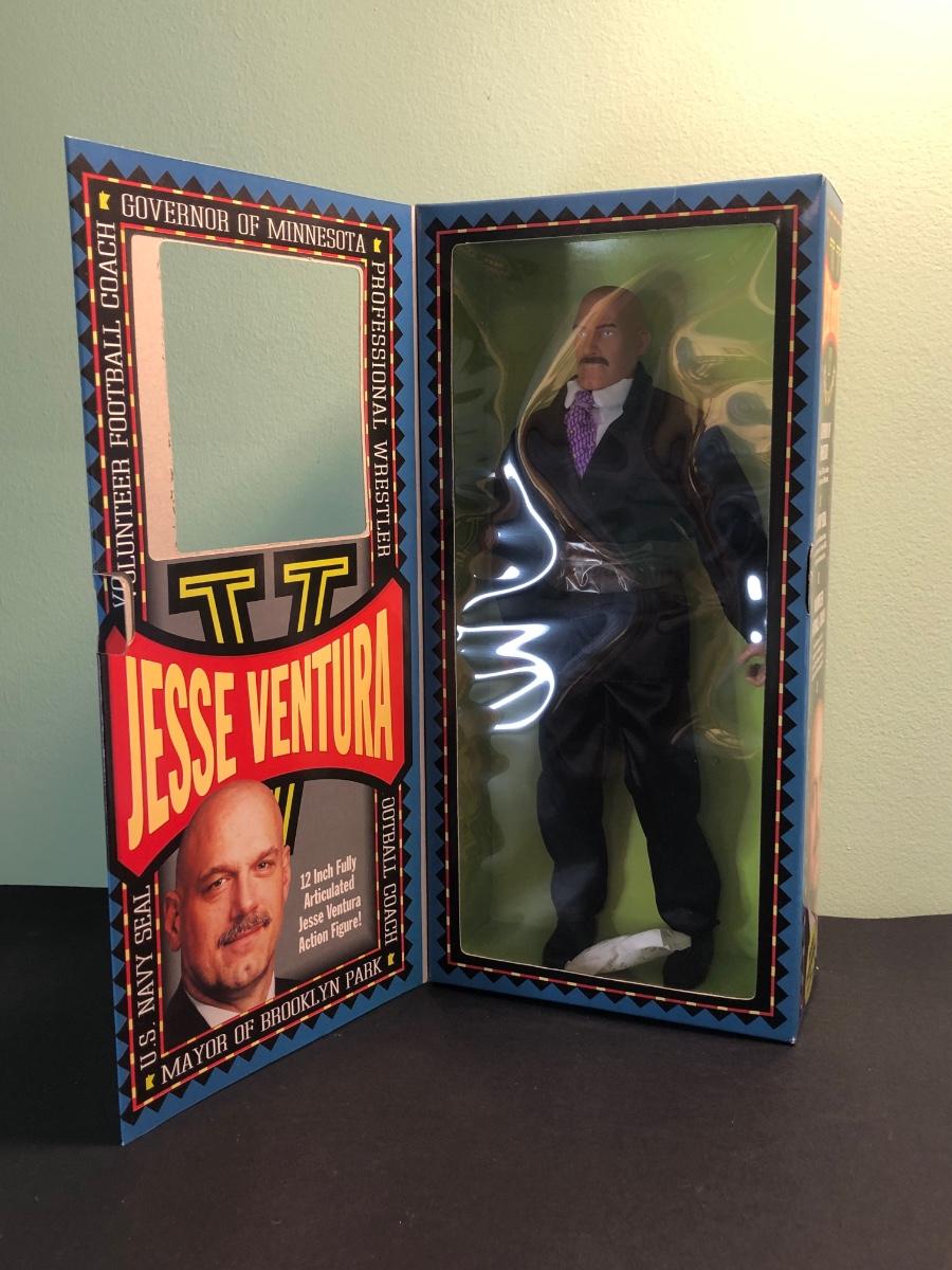 LOT 158MBC: 1998 Limited Edition Signature Series WCW Bill Goldberg Poseable Action Figure, 1999 Jessie Ventura for Governor of Minnesota Action Figure, WCW Super Kick Rey Mysterio & Jimmy Hart