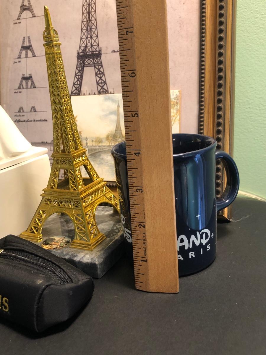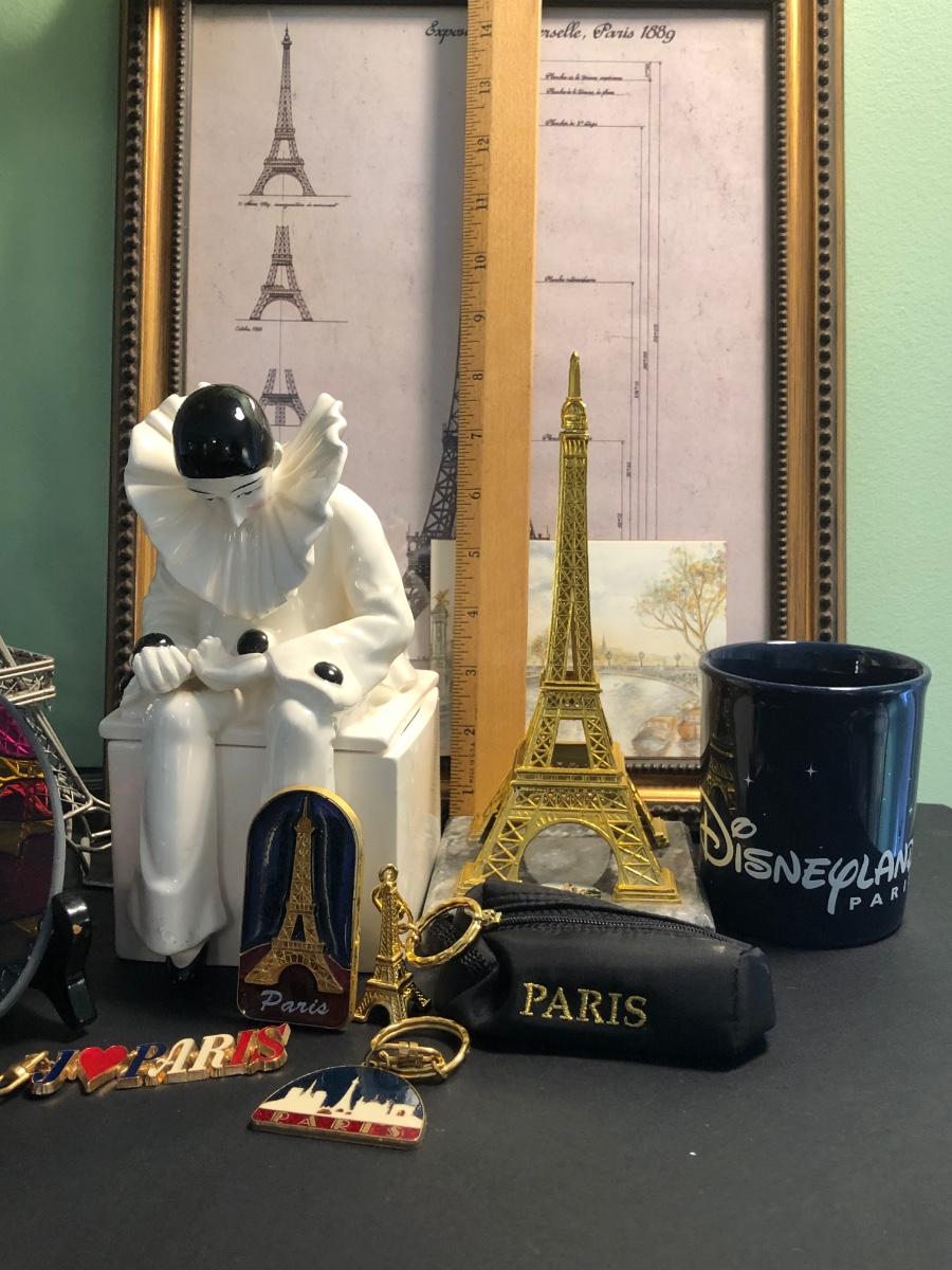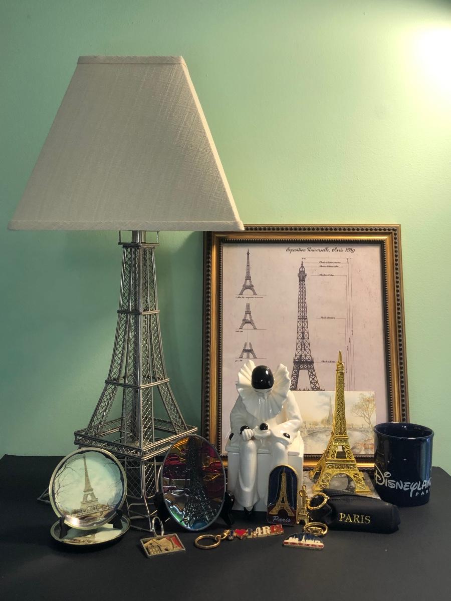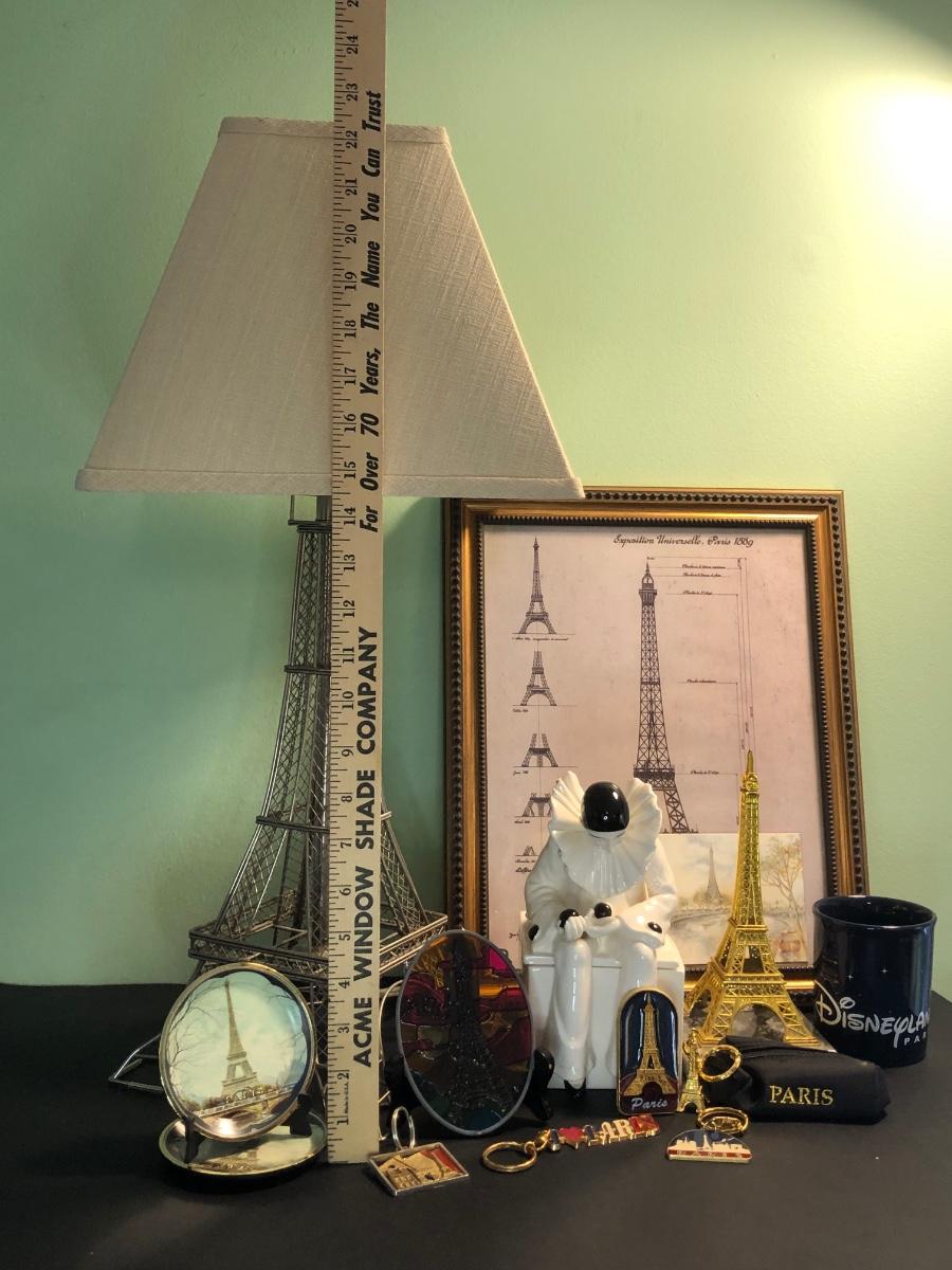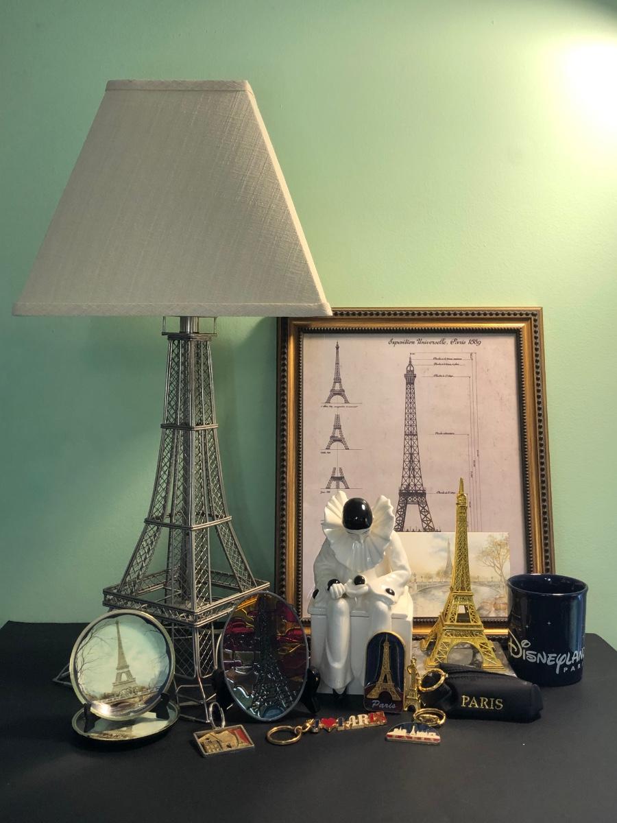LOT 162FB: Paris / Eiffel Tower Collection - Disneyland Paris Mug, Eiffel Tower Schematic Print, Lamp, & More