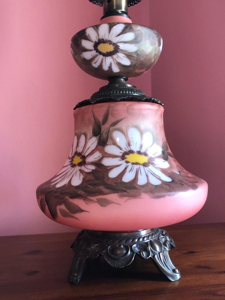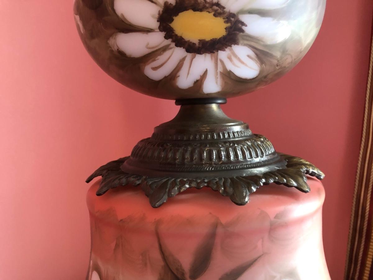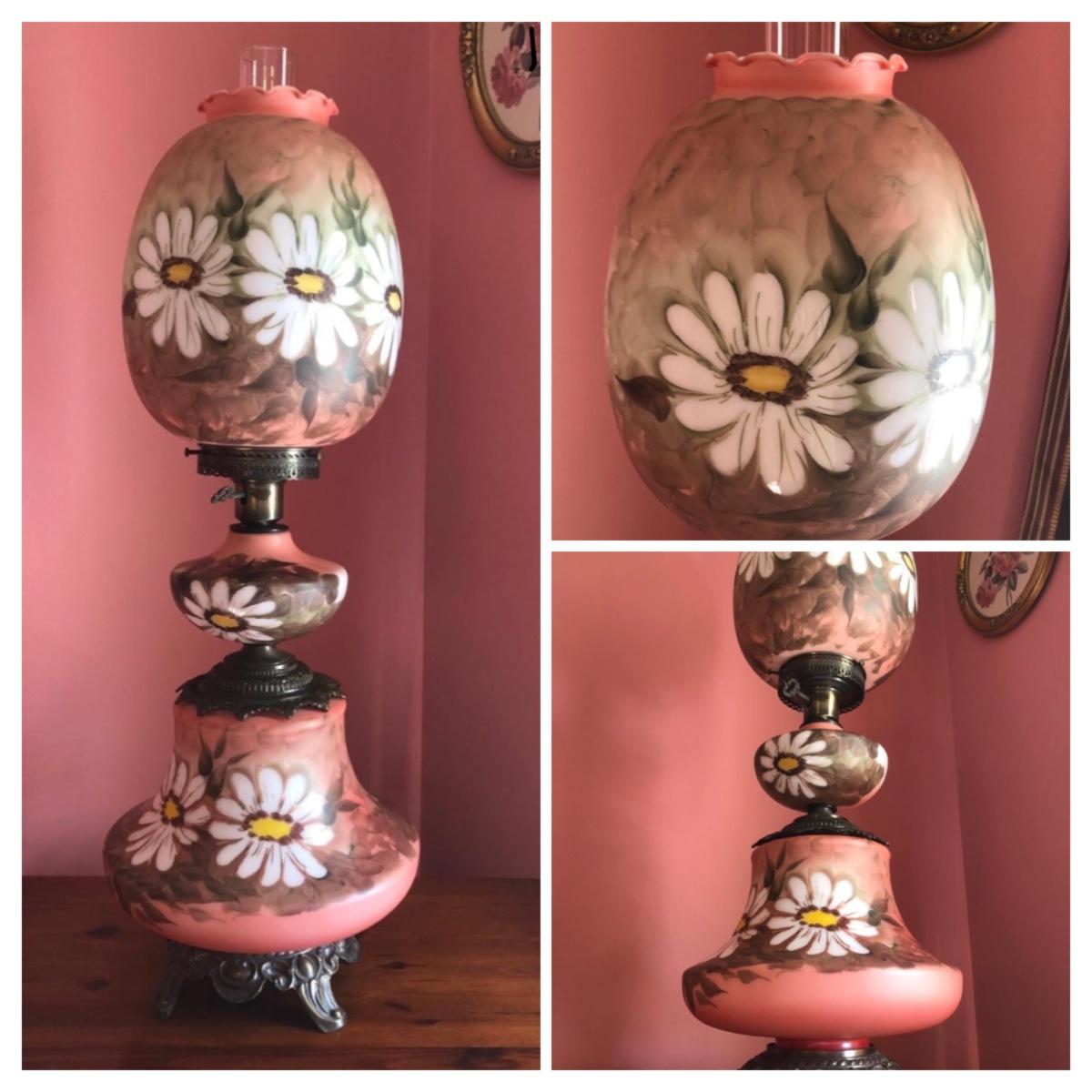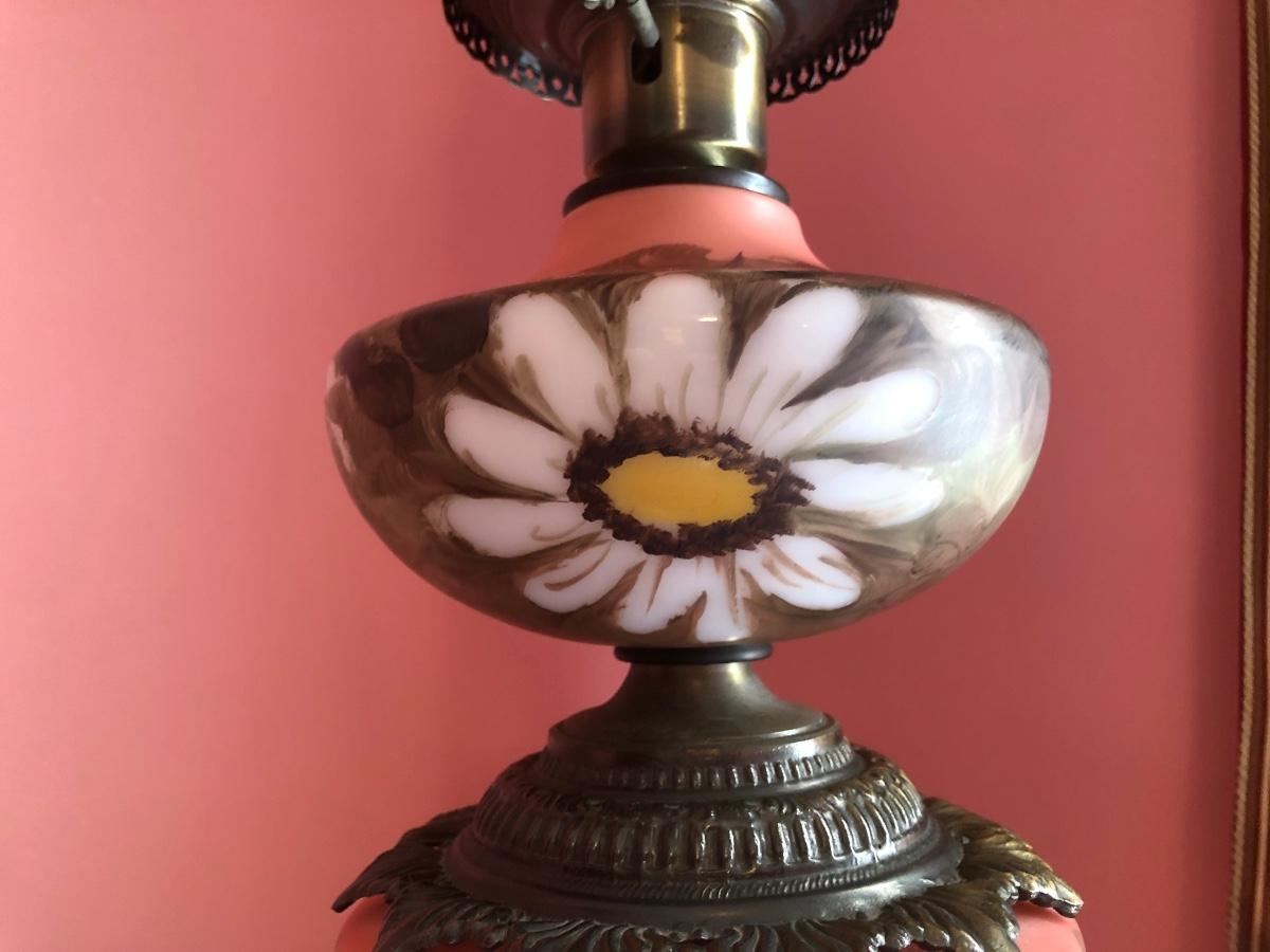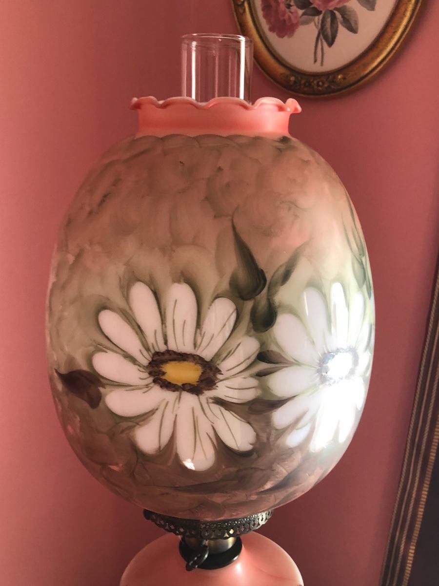 LOT 165PB: Beautiful Floral Hand-Painted 3-Tiered Pink Hurricane Lamp