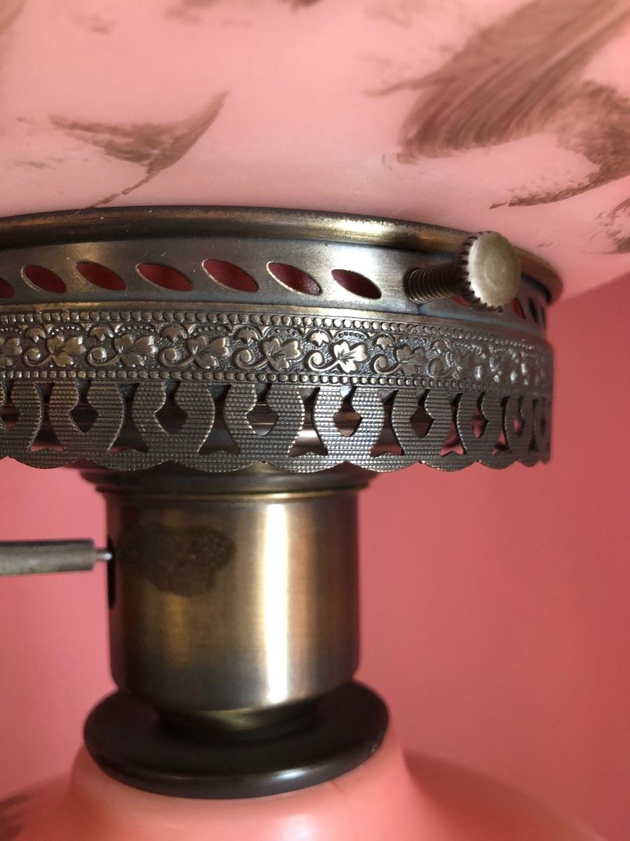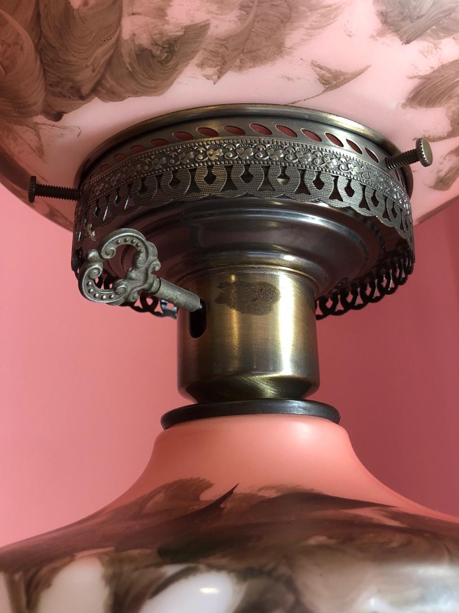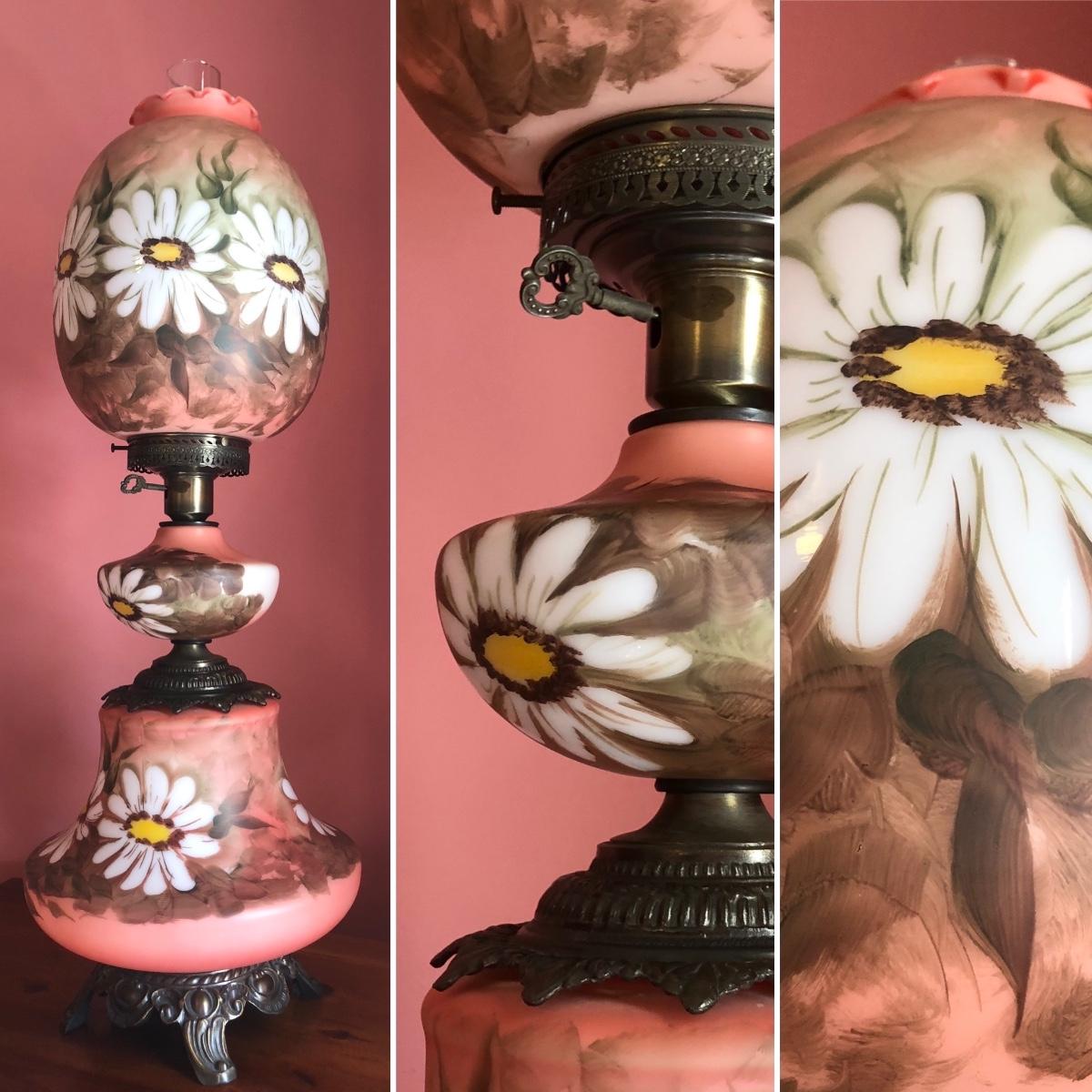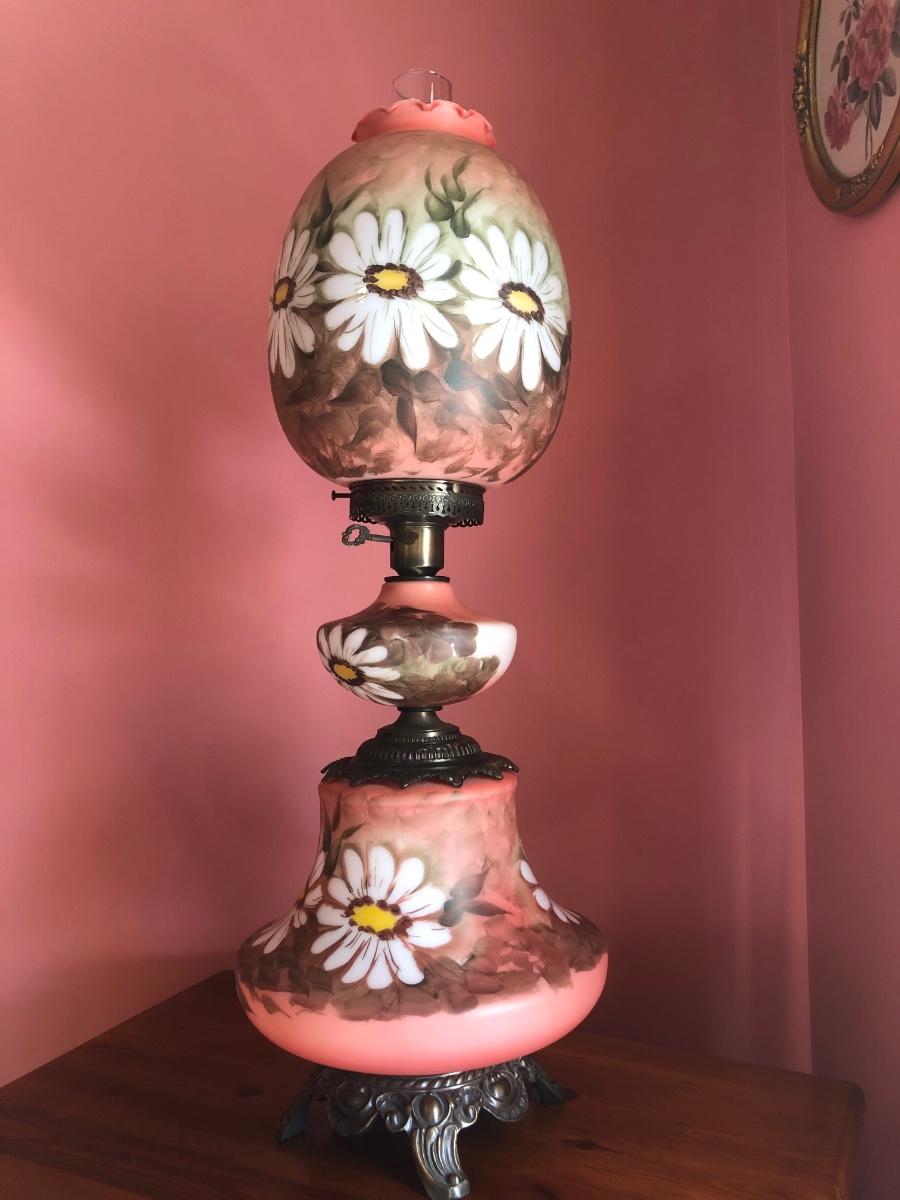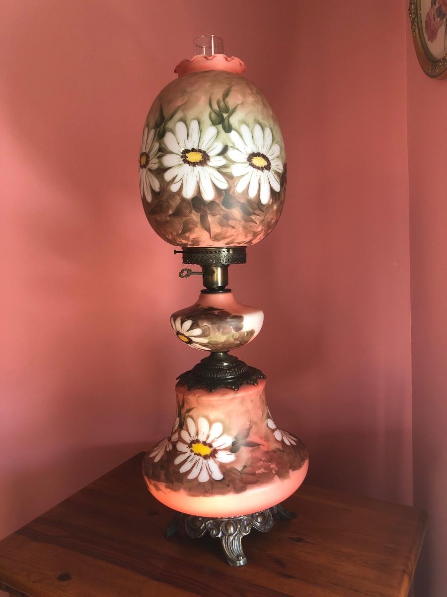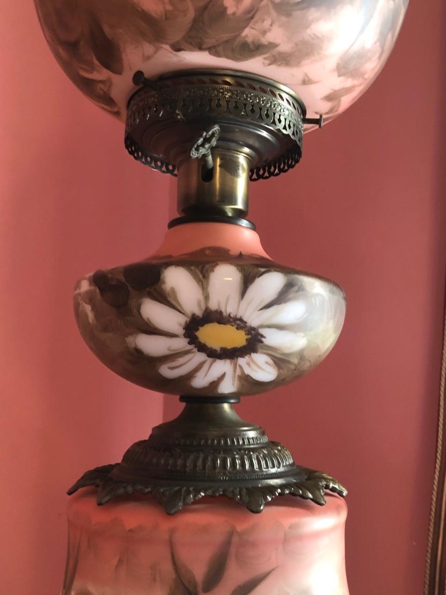 LOT 165PB: Beautiful Floral Hand-Painted 3-Tiered Pink Hurricane Lamp