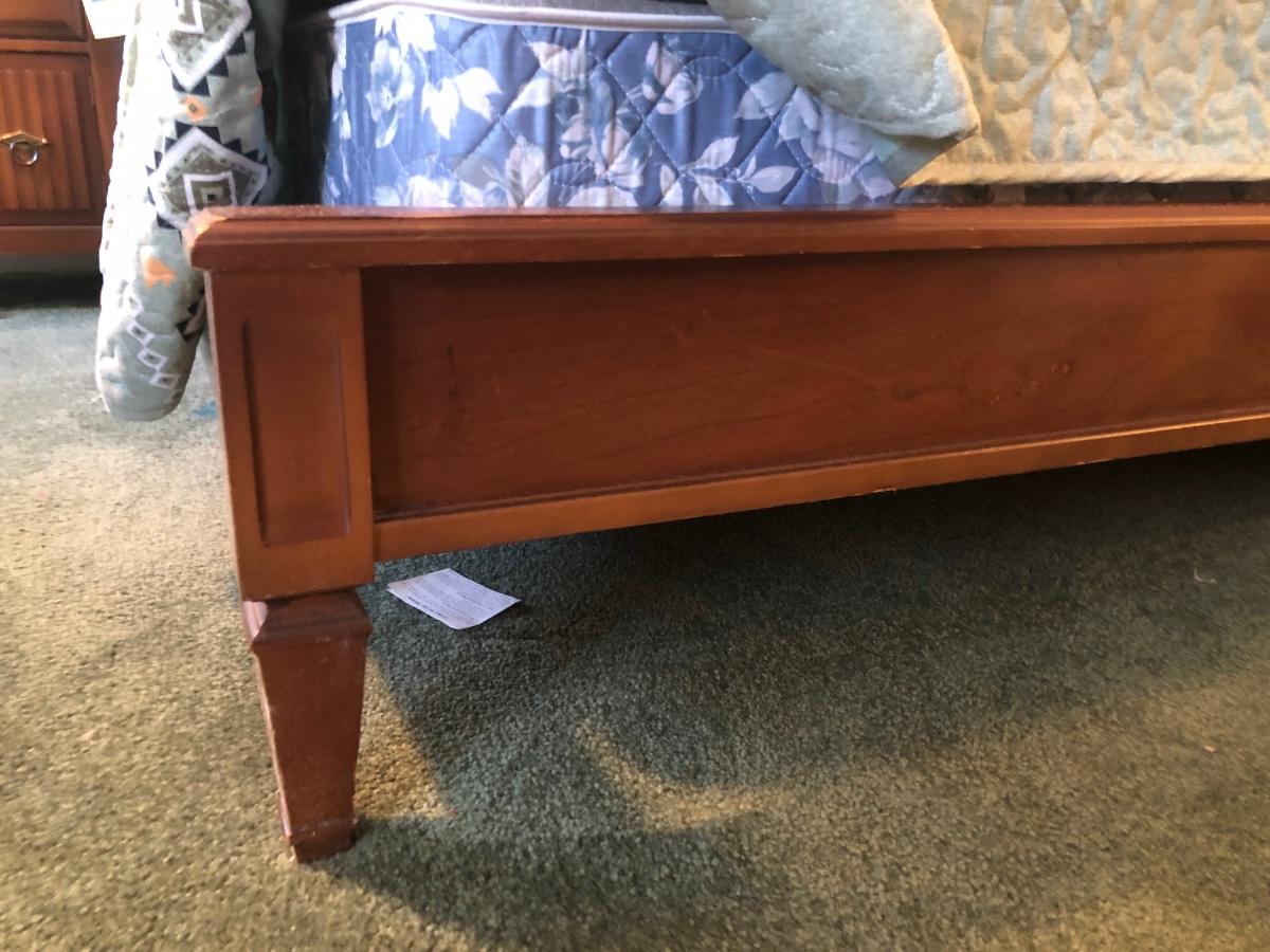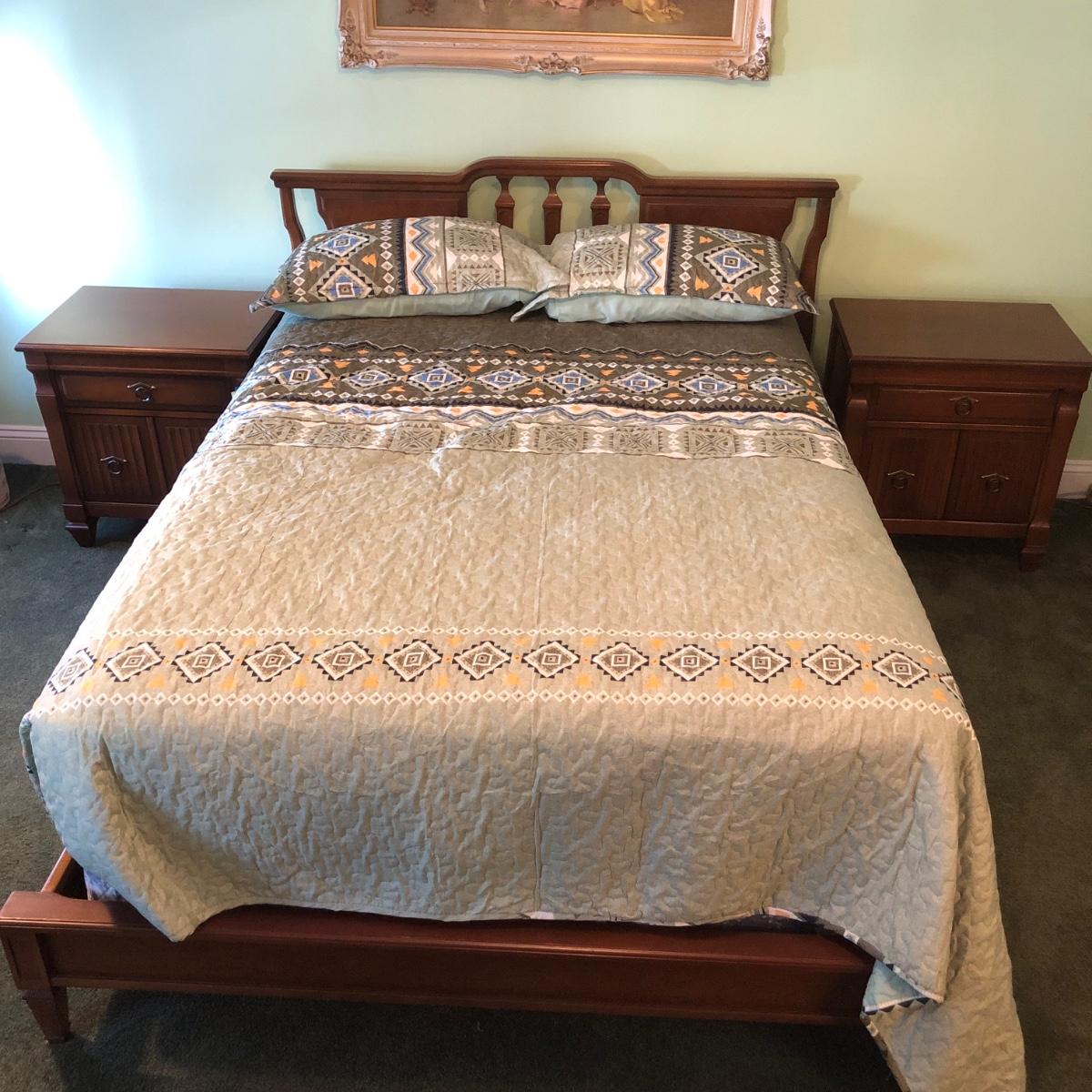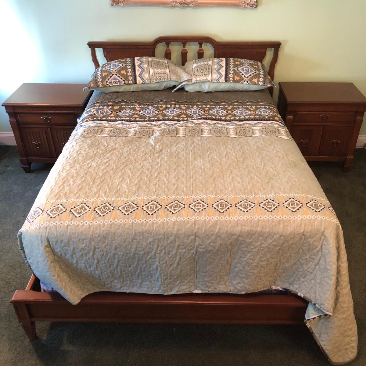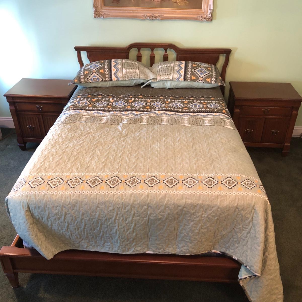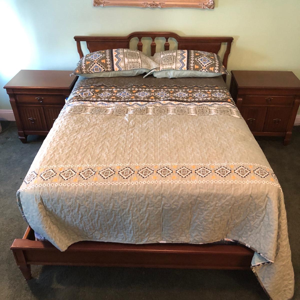 LOT 180GB: Full Sized Wooden Bed w/ 2 Matching End Tables