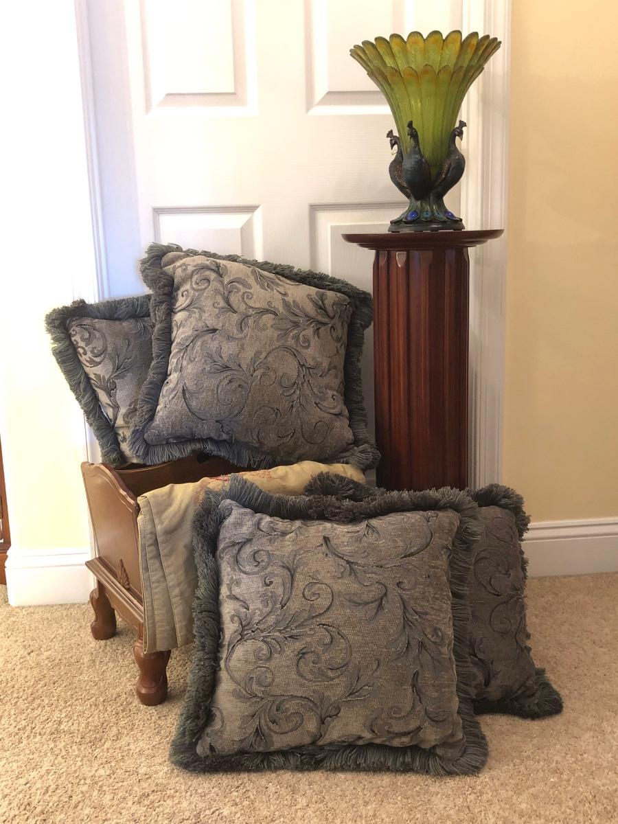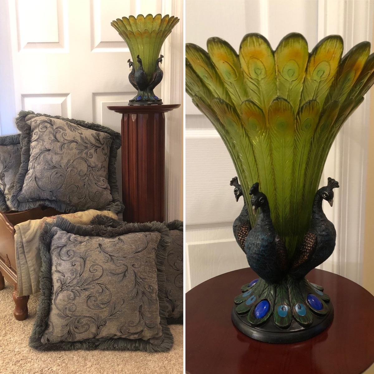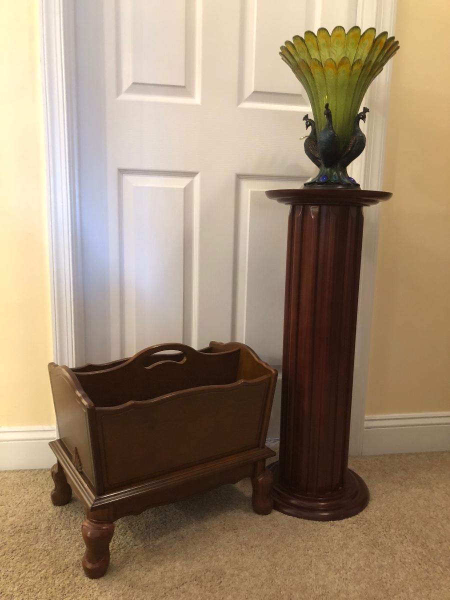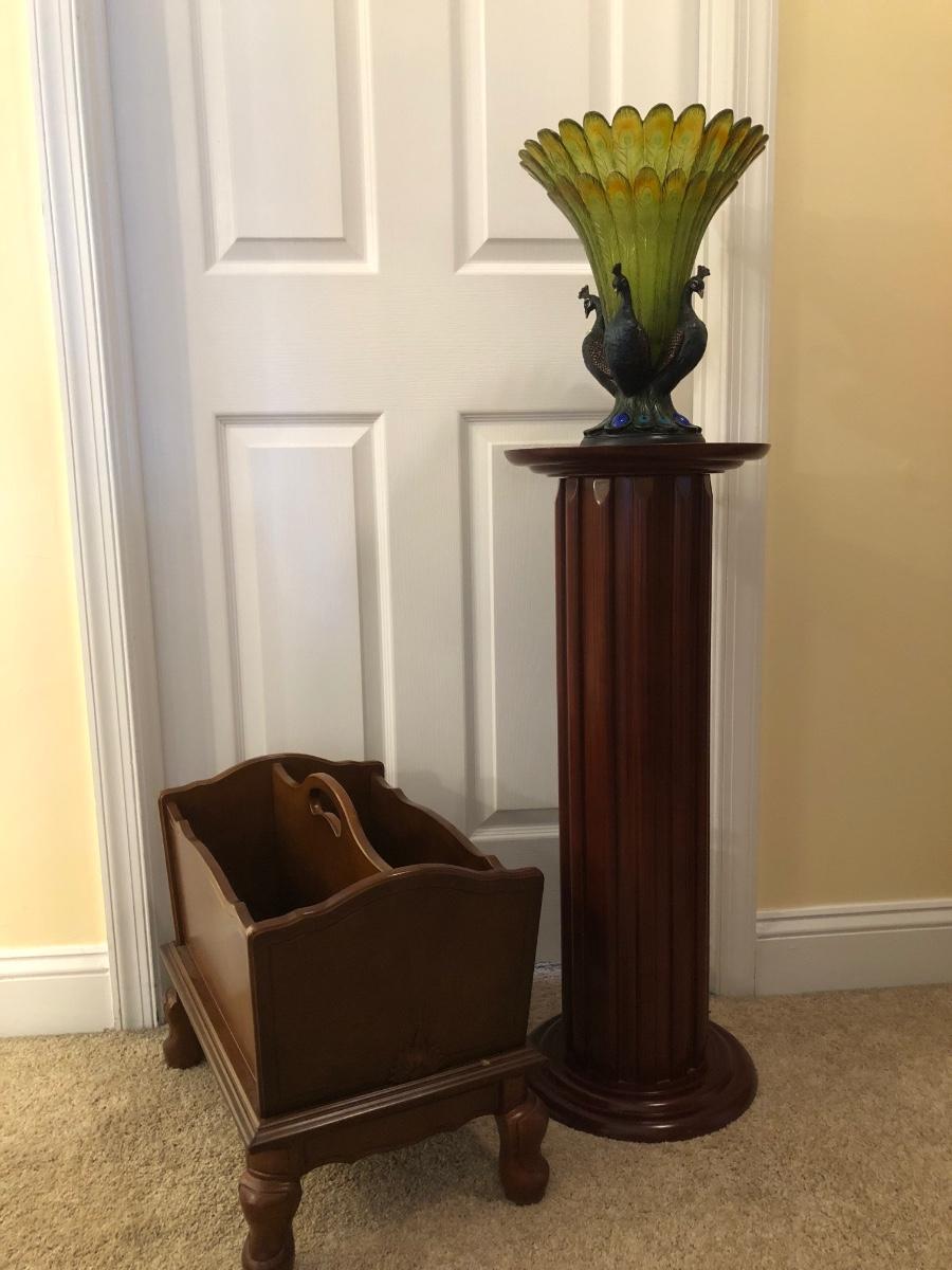 LOT 184GB: Home Decor Peacock Vase, Cherry Wood Pedestal & Magazine Rack, Home Decor Pillows & Table Runners