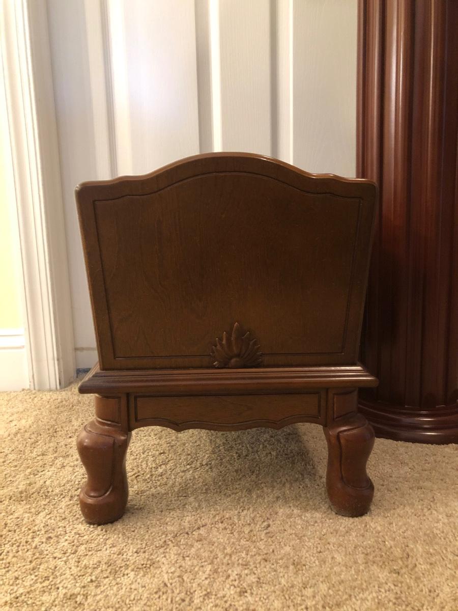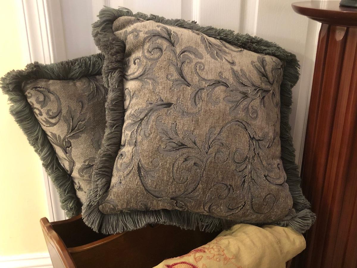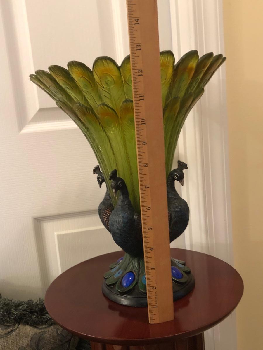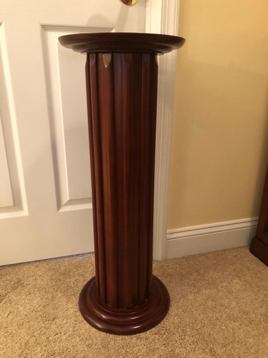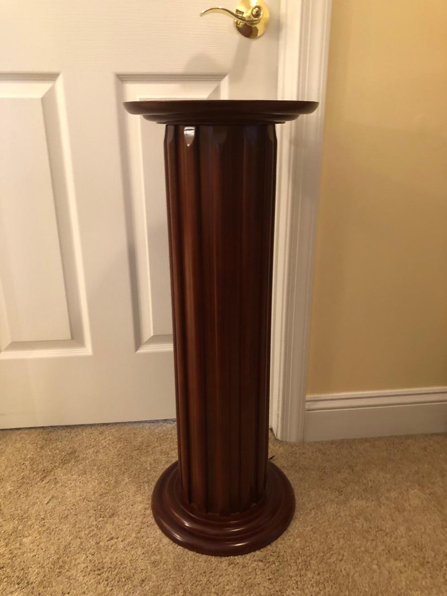 LOT 184GB: Home Decor Peacock Vase, Cherry Wood Pedestal & Magazine Rack, Home Decor Pillows & Table Runners