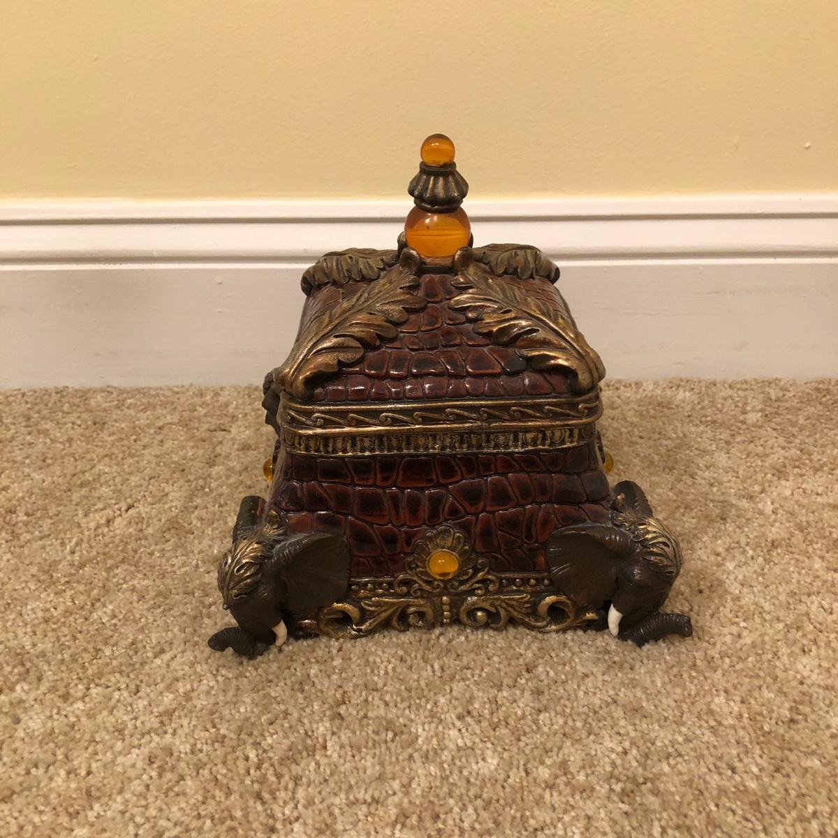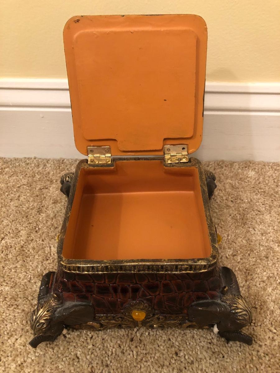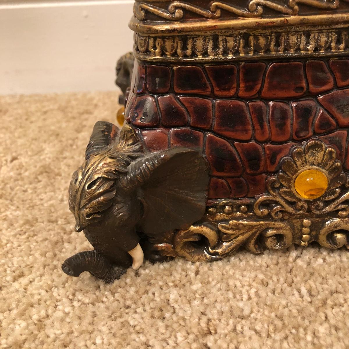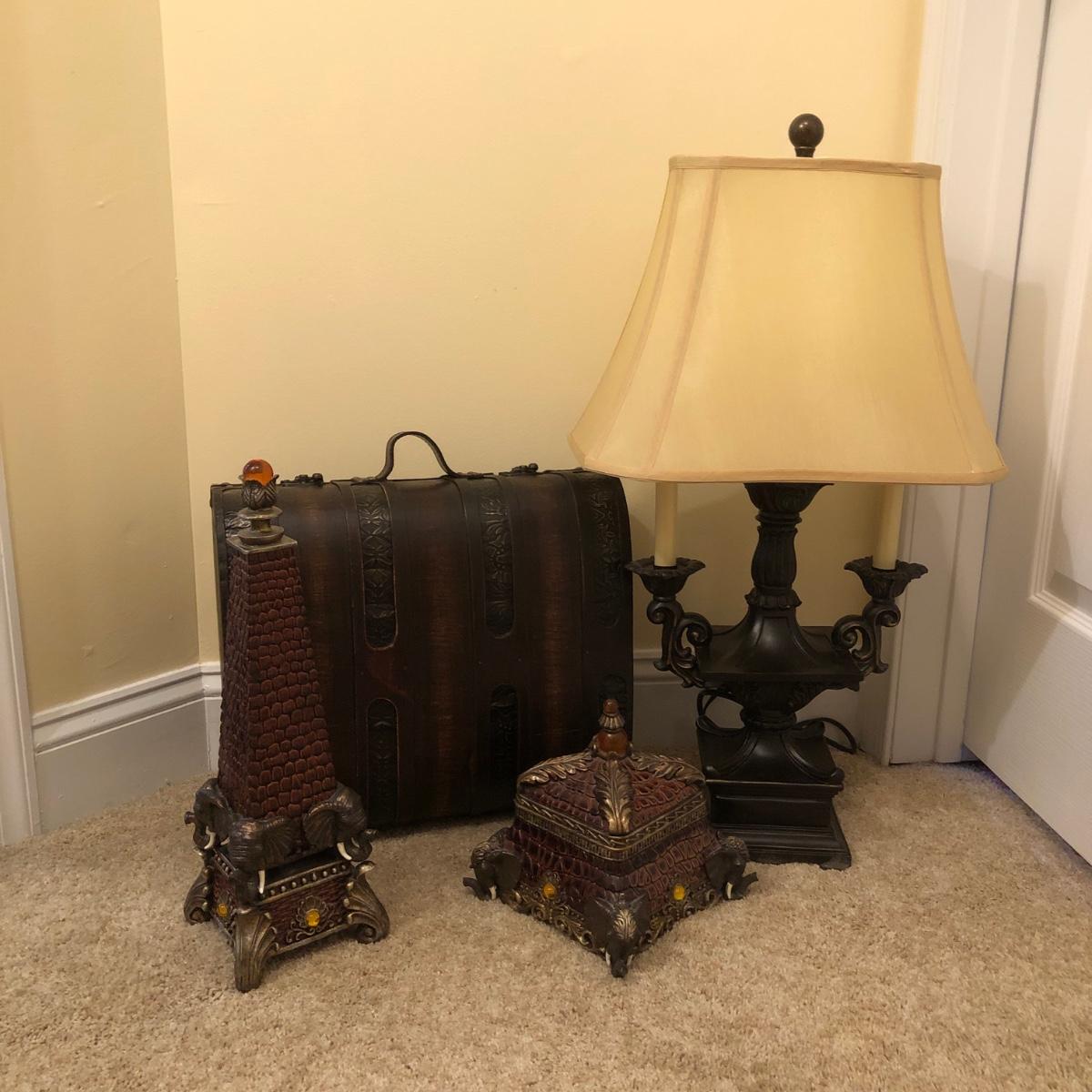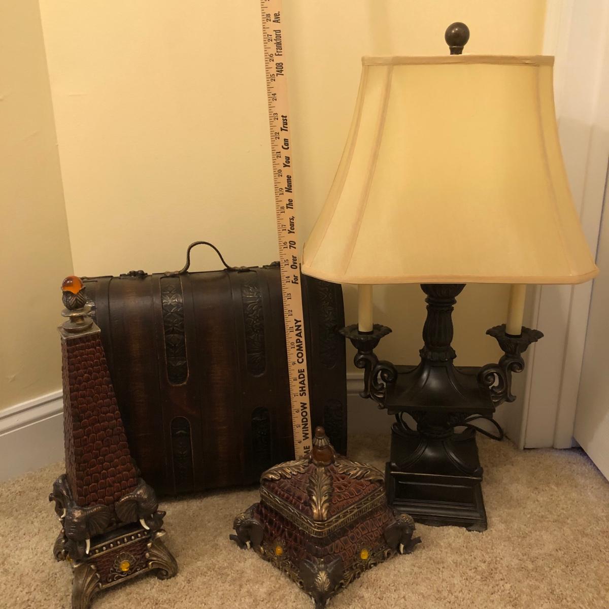 LOT 187MBC: Ornate Elephant Box & Decor, Lamp & Decorative Wooden Suitcase