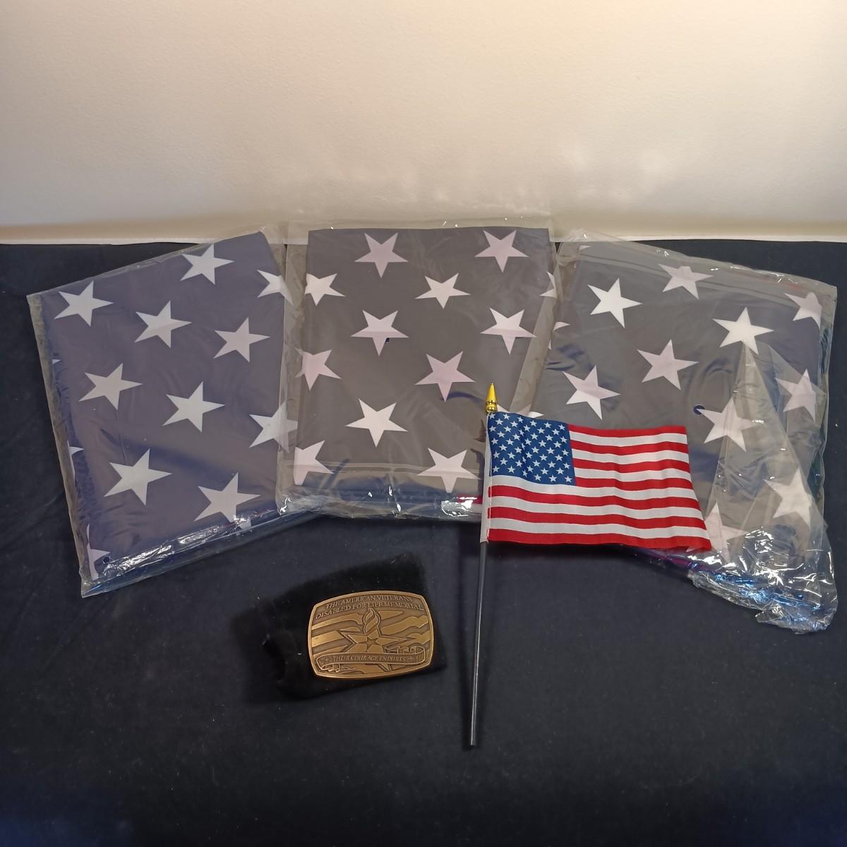 LOT 248K: Militaria Collection- Flag Case, American Veterans 2006 Belt Buckle, Norman Rockwell 'Celebration' Figurine & More
