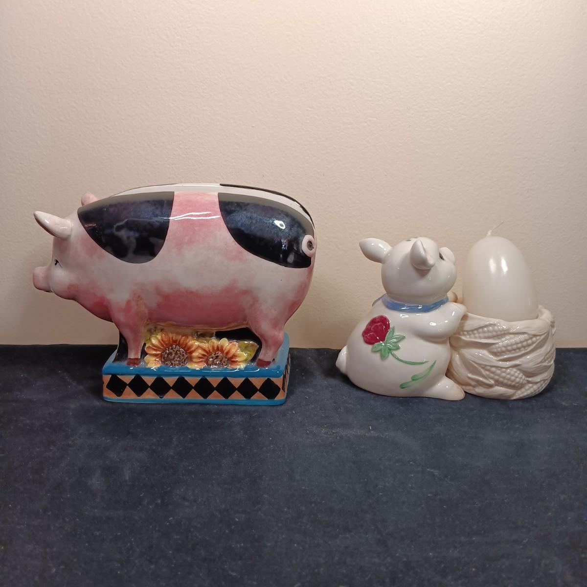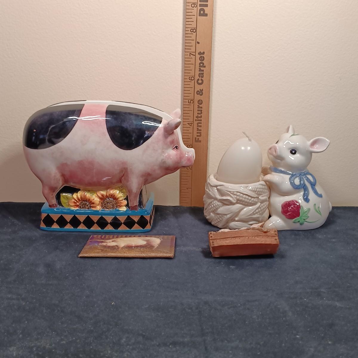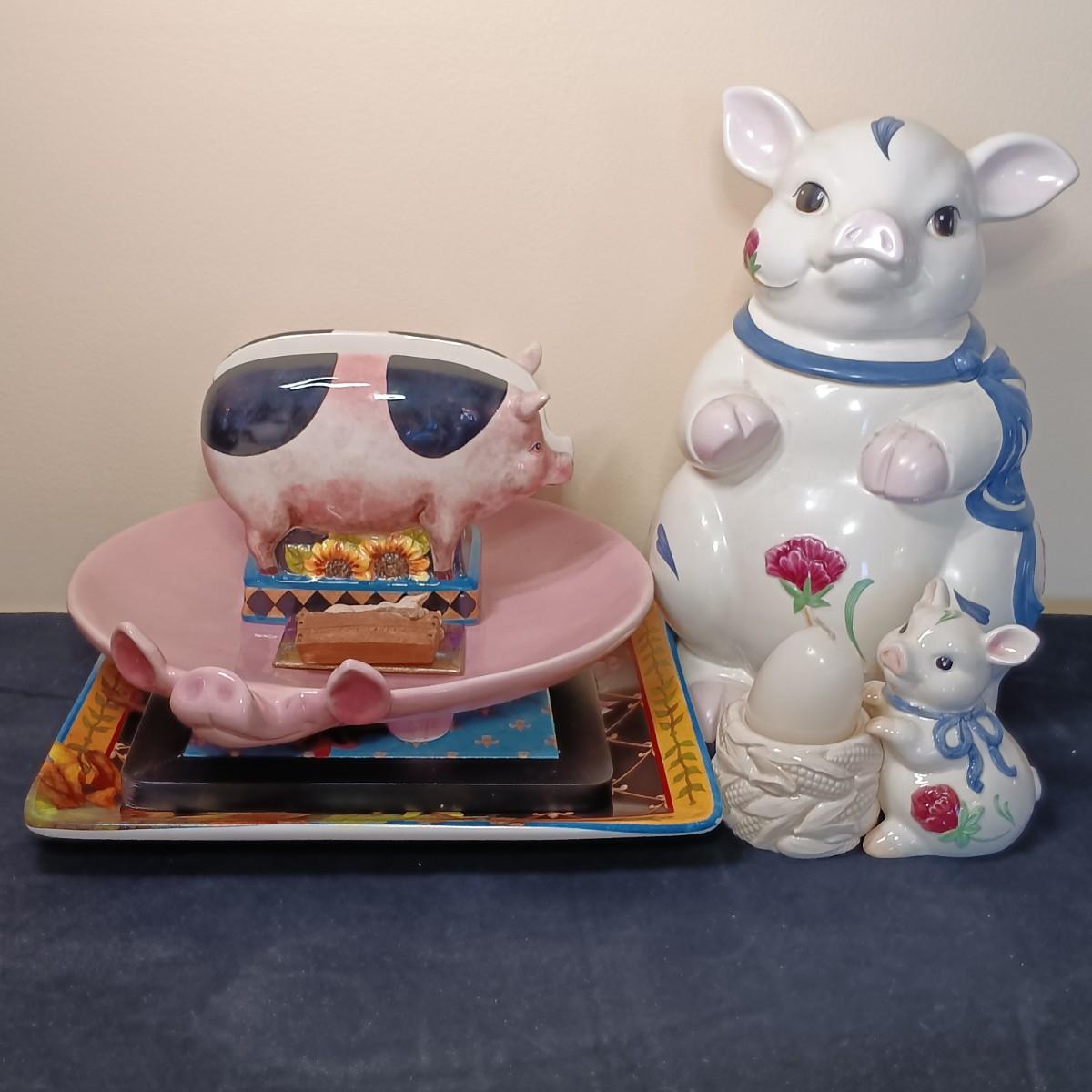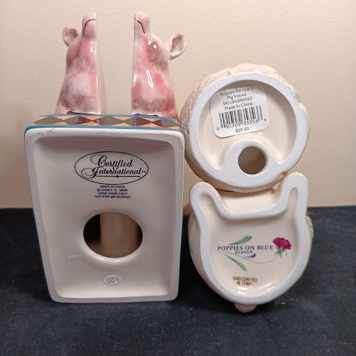 LOT 258K: Pig Collection- Lenox 'Poppies on Blue' Cookie Jar and Votive, Certified International Napkin Holder, Plate and Trivet & More