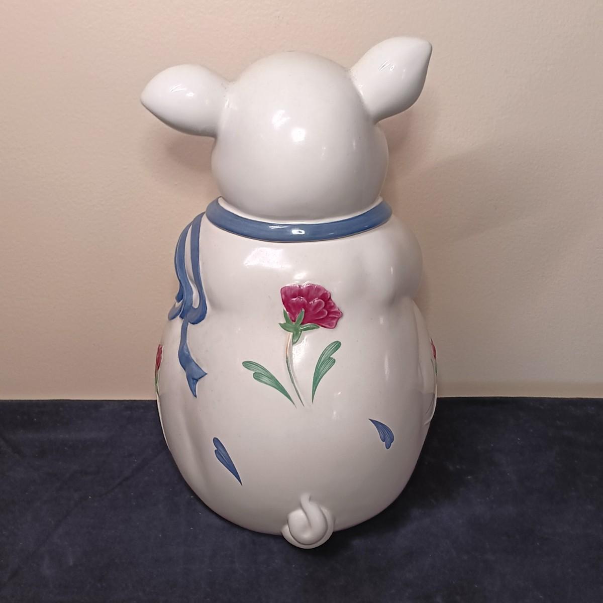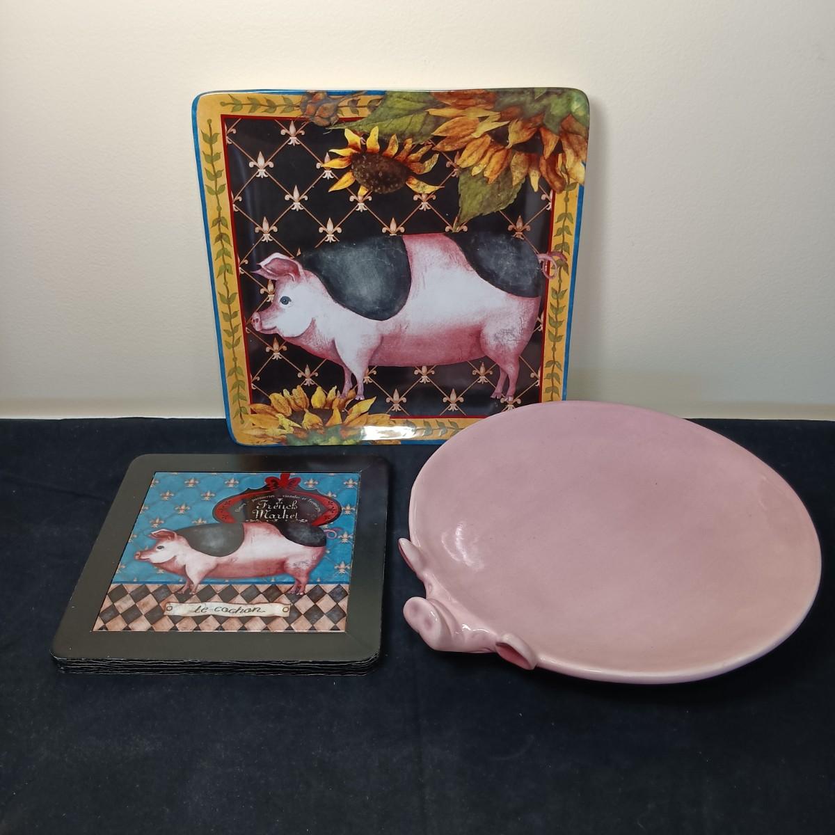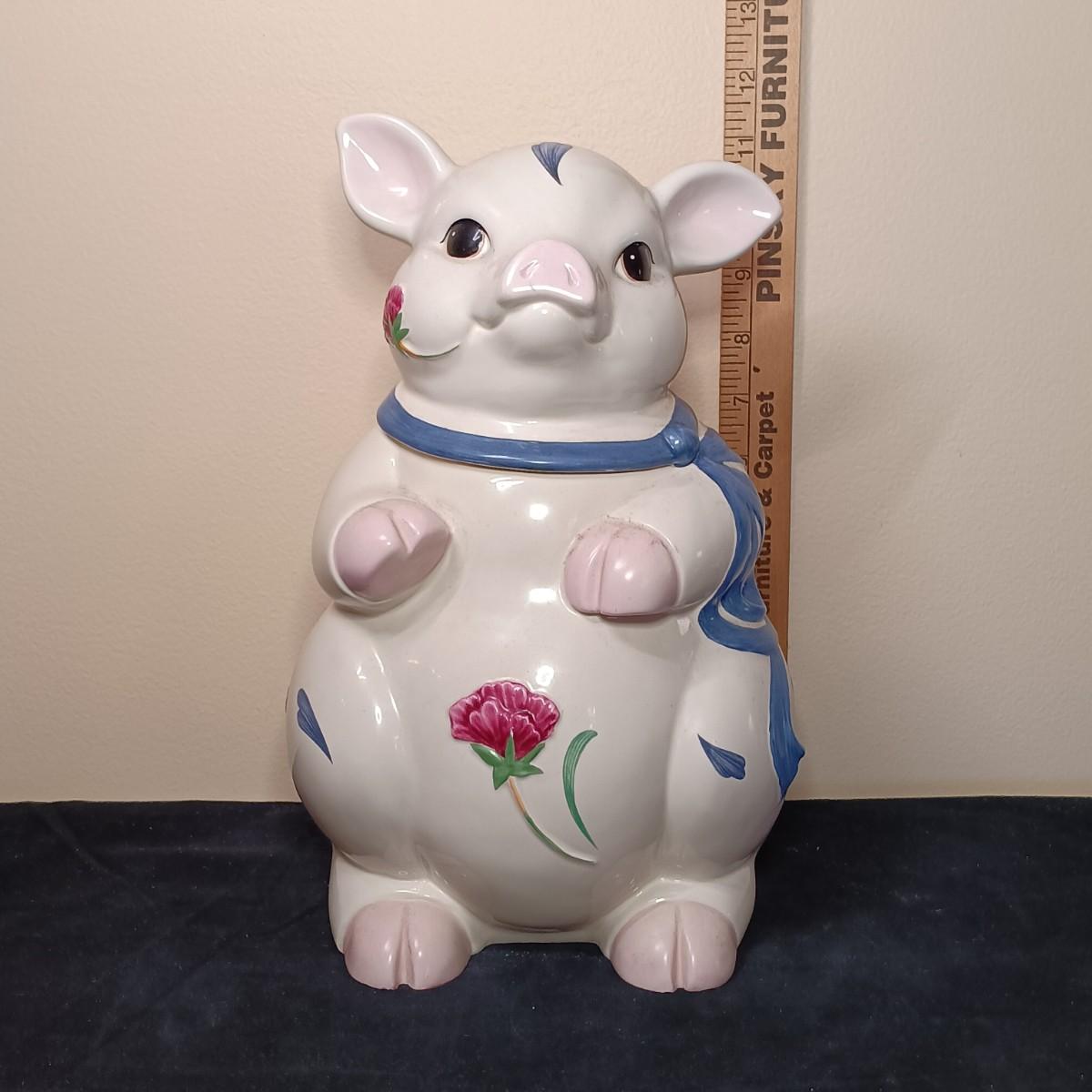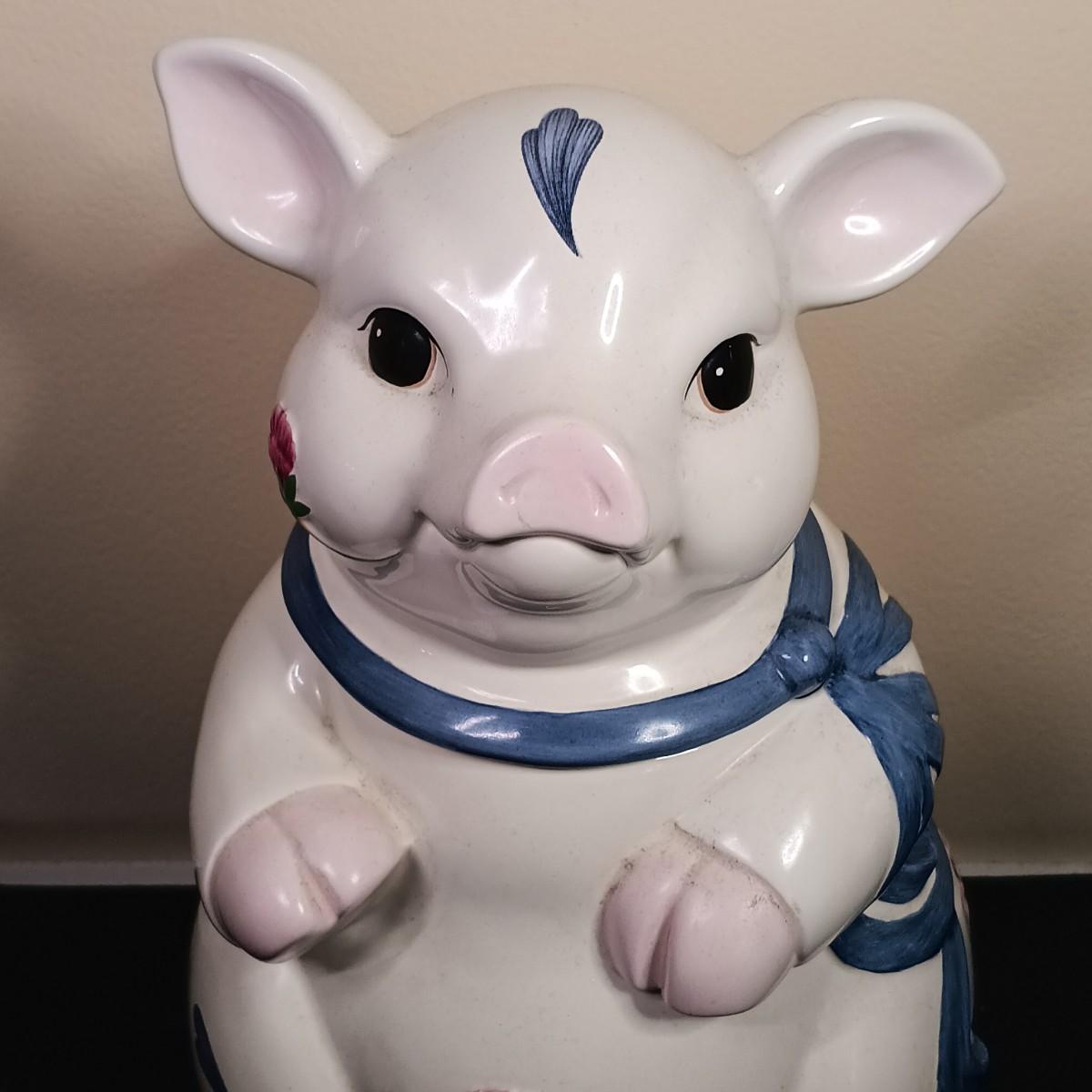 LOT 258K: Pig Collection- Lenox 'Poppies on Blue' Cookie Jar and Votive, Certified International Napkin Holder, Plate and Trivet & More