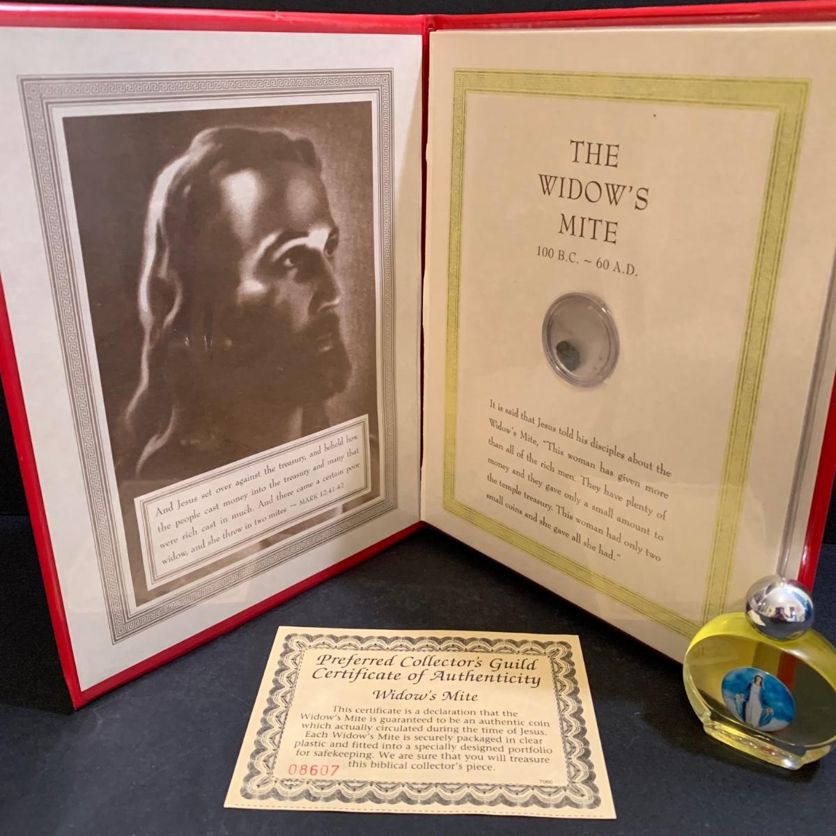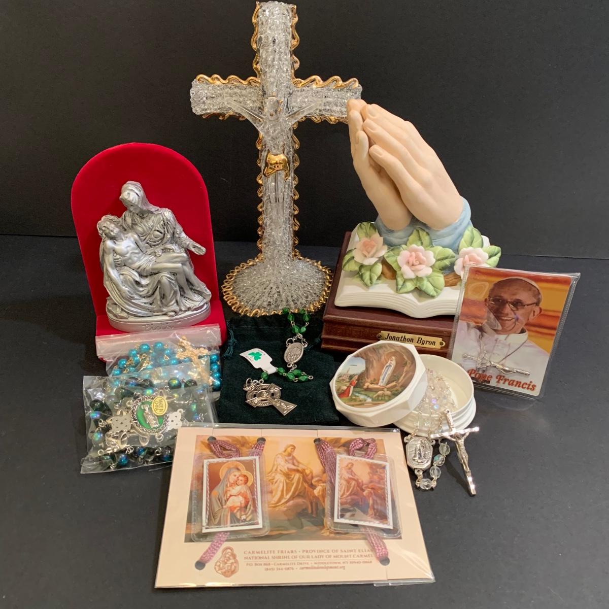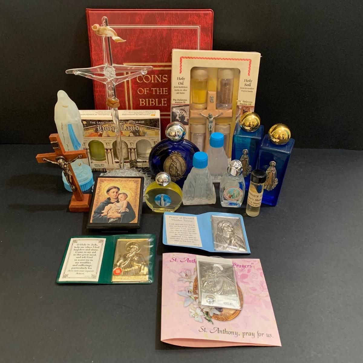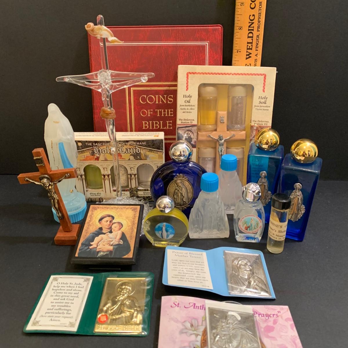 LOT 277 MB: Coins Of The Bible "Widow's Mite", Italian Pewter Piela Statue, Rosaries, Crucifixes, Holy Water, Holy Oils, & More