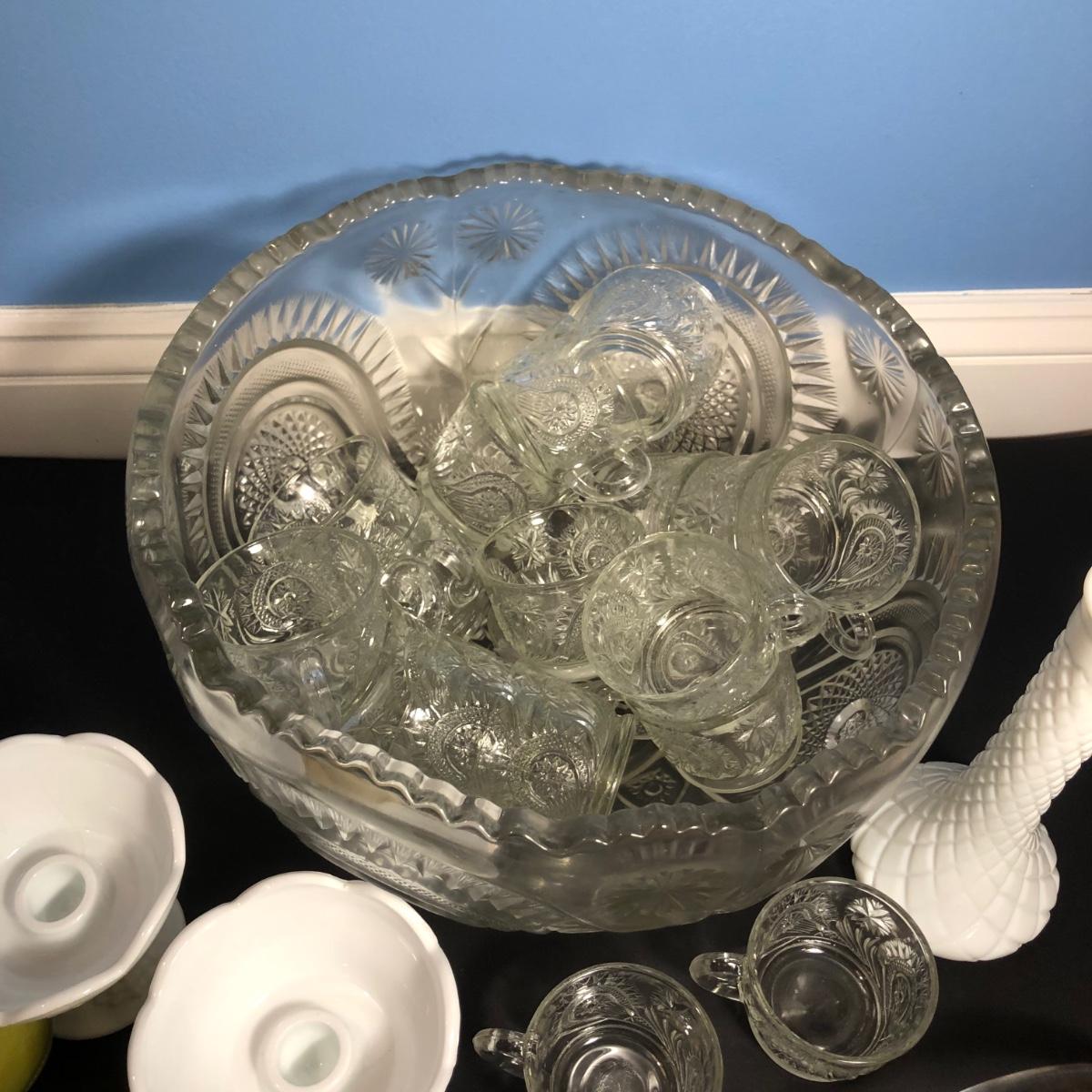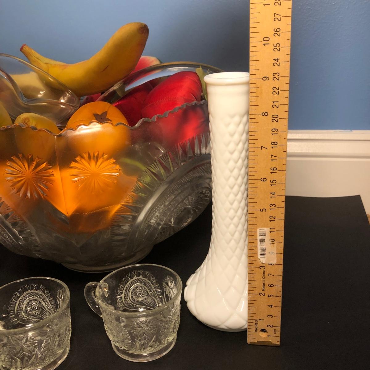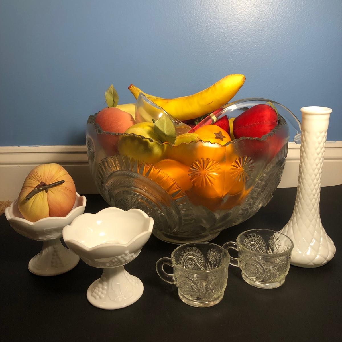 LOT 281B: Large Cut Crystal Punch Bowl w/ Several Matching Cups, Soft Fruit & Milk Glass Pieces