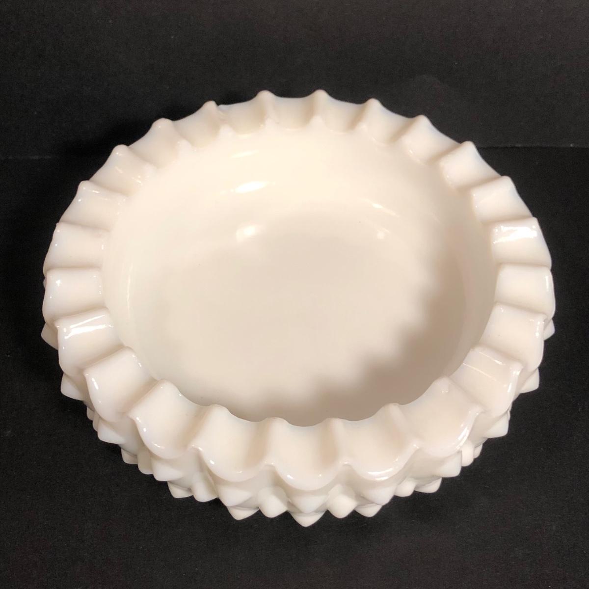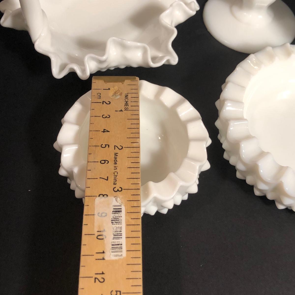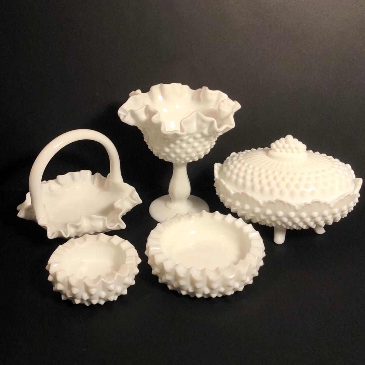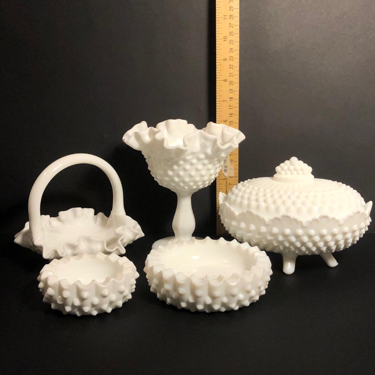 LOT 282B: Fenton Hobnail Milk Glass Pieces - Ruffled Edge Compote, Ruffled Basket, Ash Trays & Lidded Candy Dish