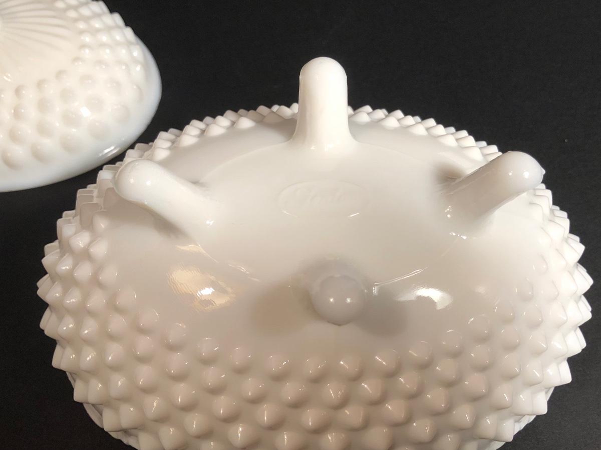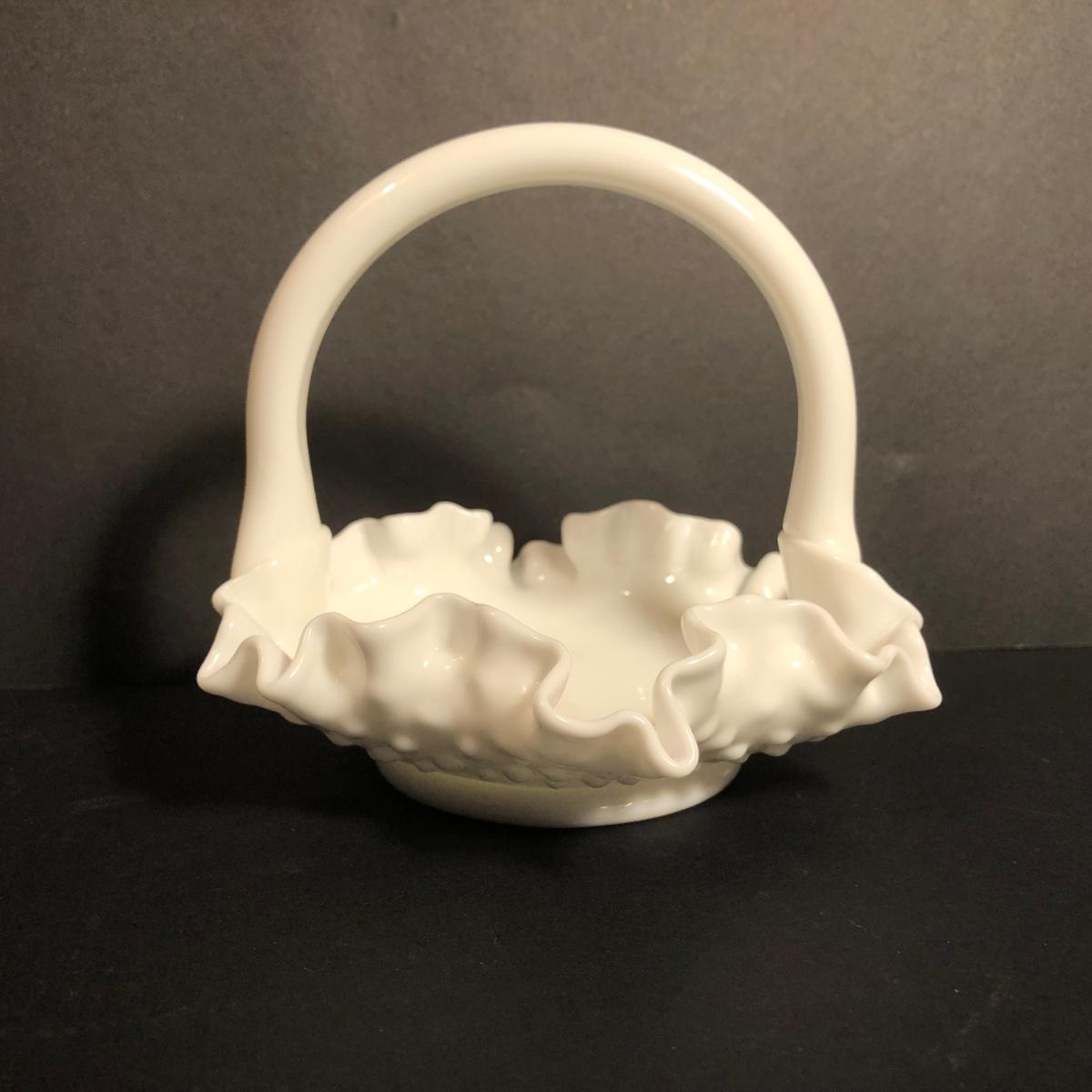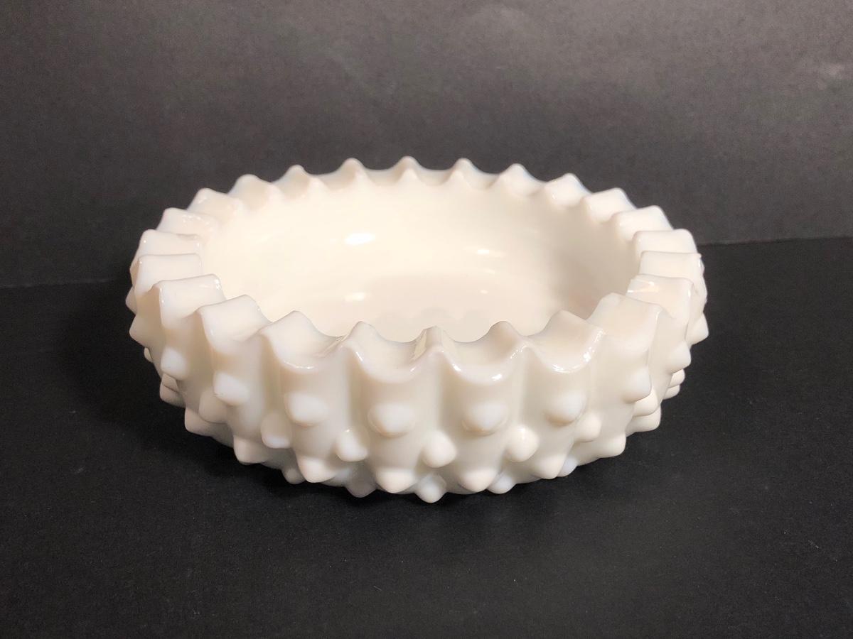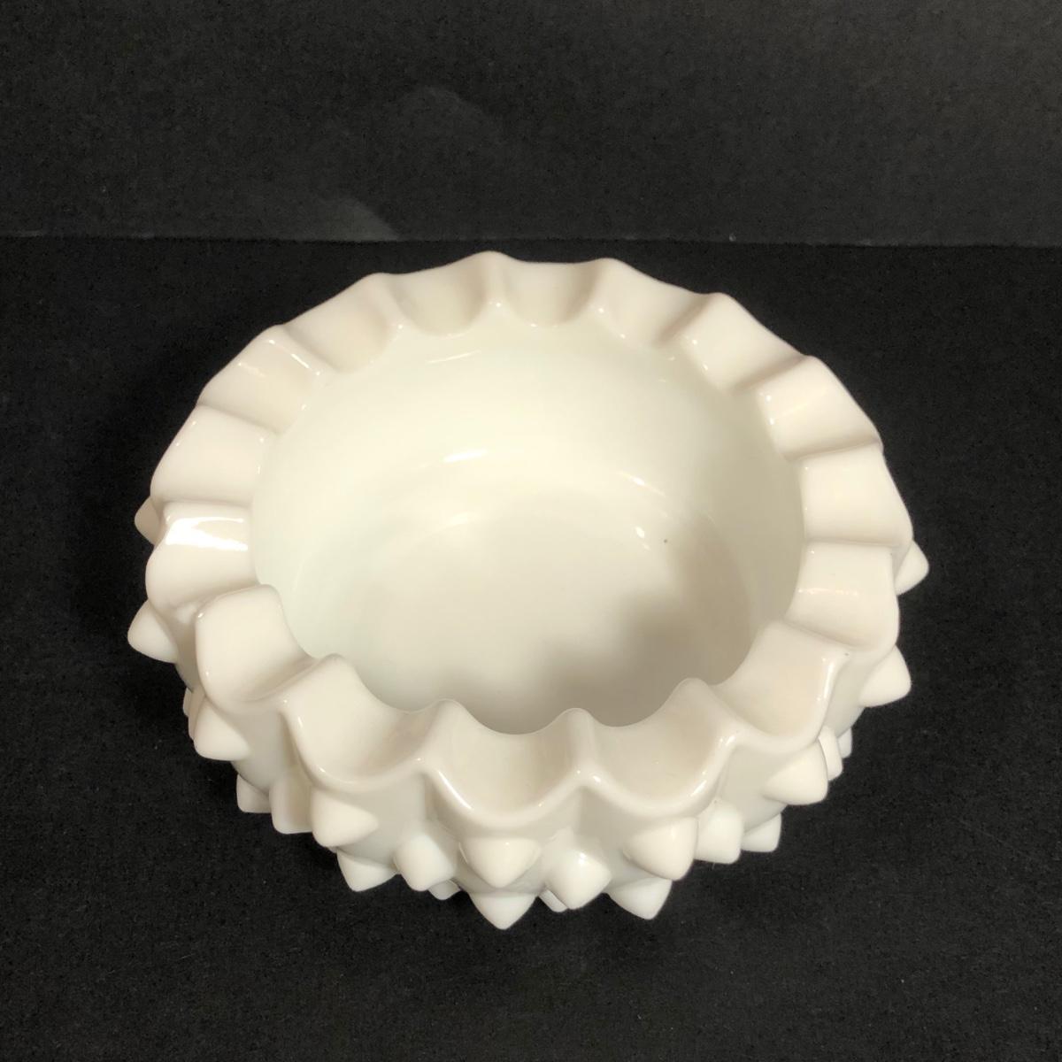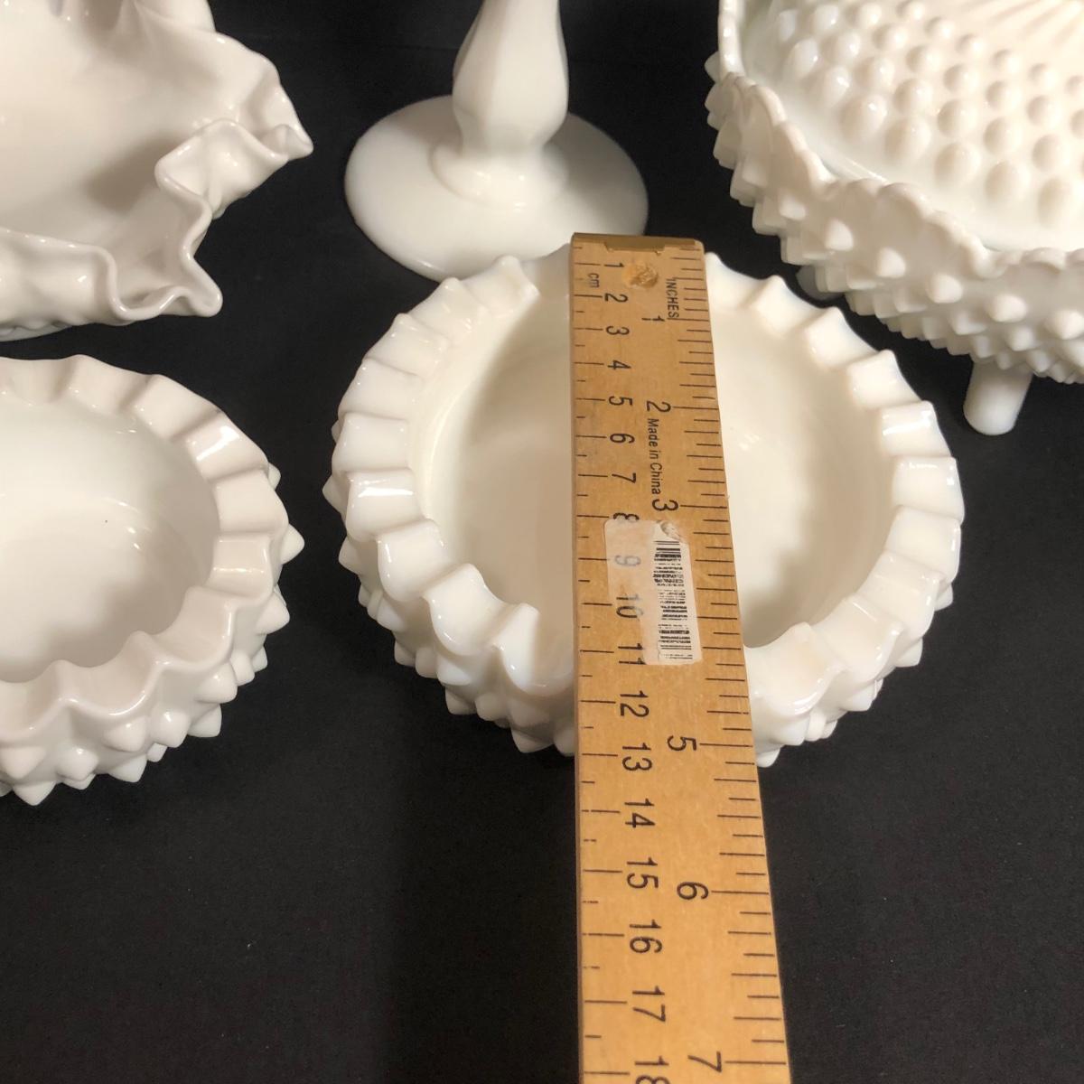 LOT 282B: Fenton Hobnail Milk Glass Pieces - Ruffled Edge Compote, Ruffled Basket, Ash Trays & Lidded Candy Dish