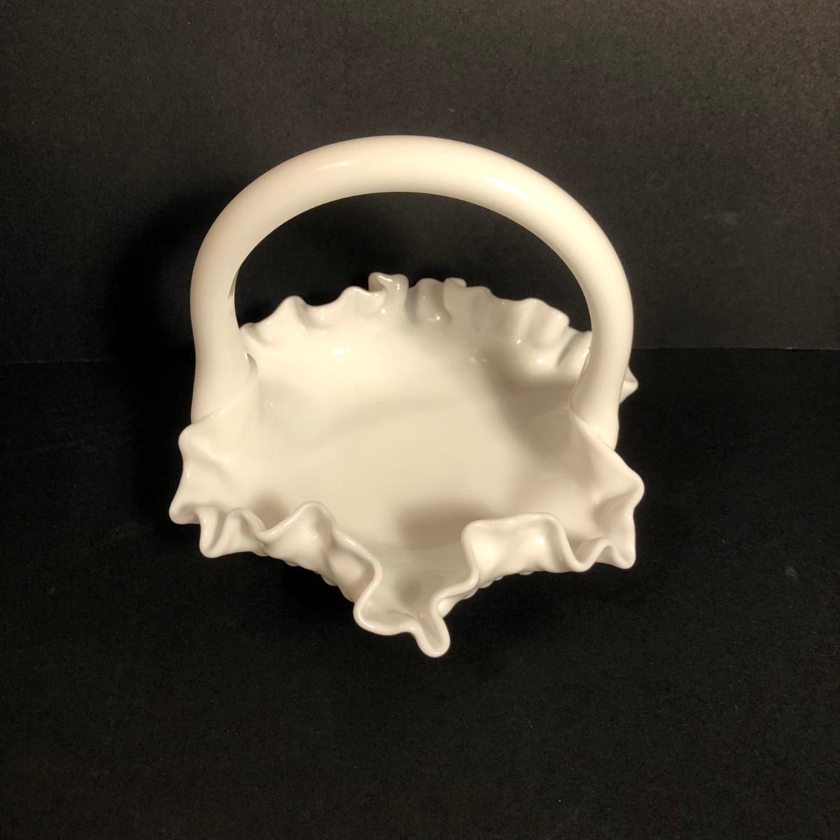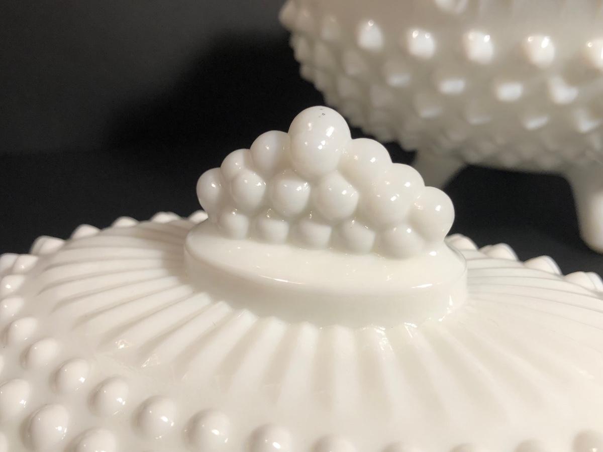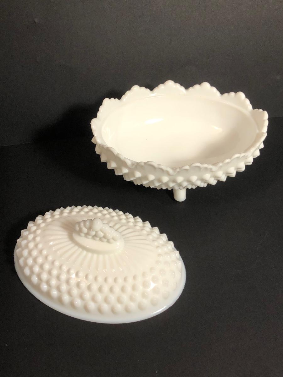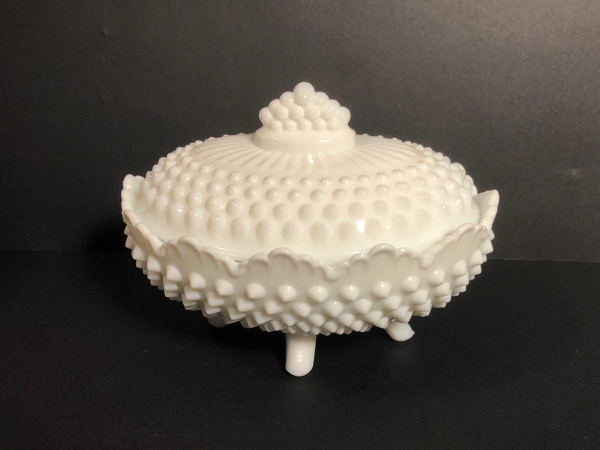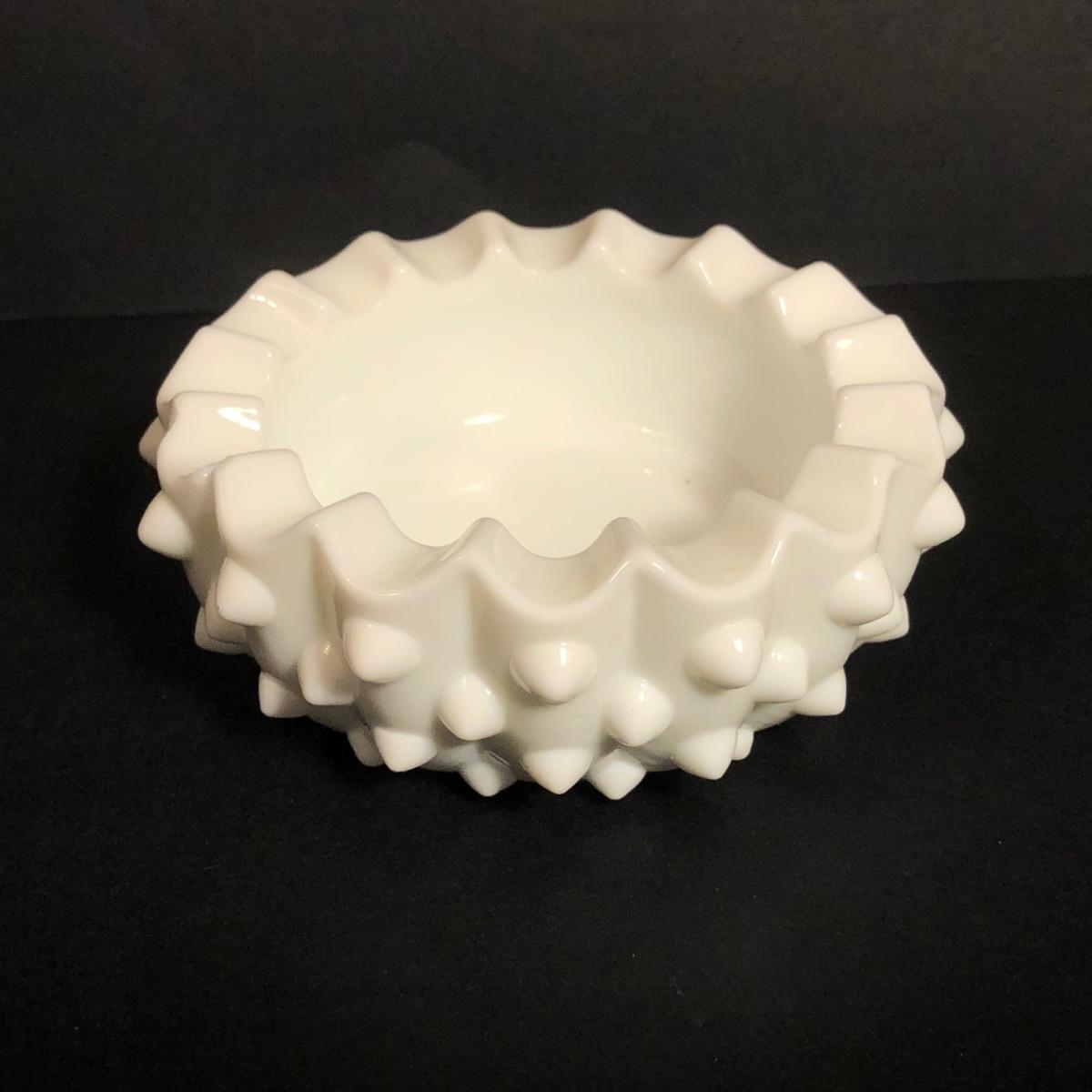LOT 282B: Fenton Hobnail Milk Glass Pieces - Ruffled Edge Compote, Ruffled Basket, Ash Trays & Lidded Candy Dish