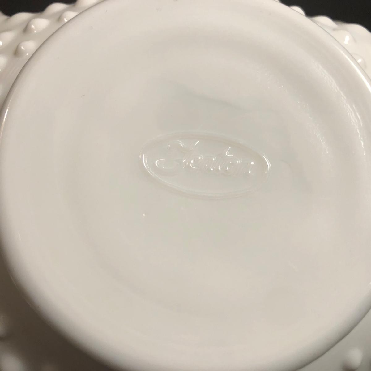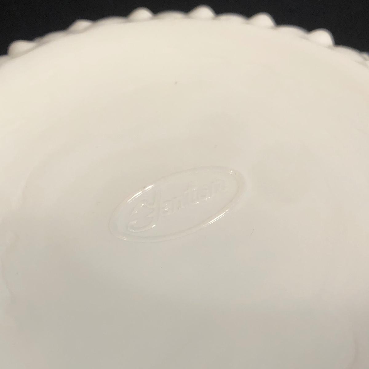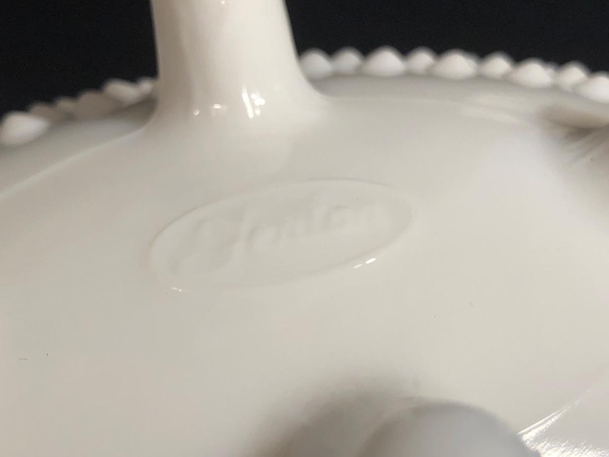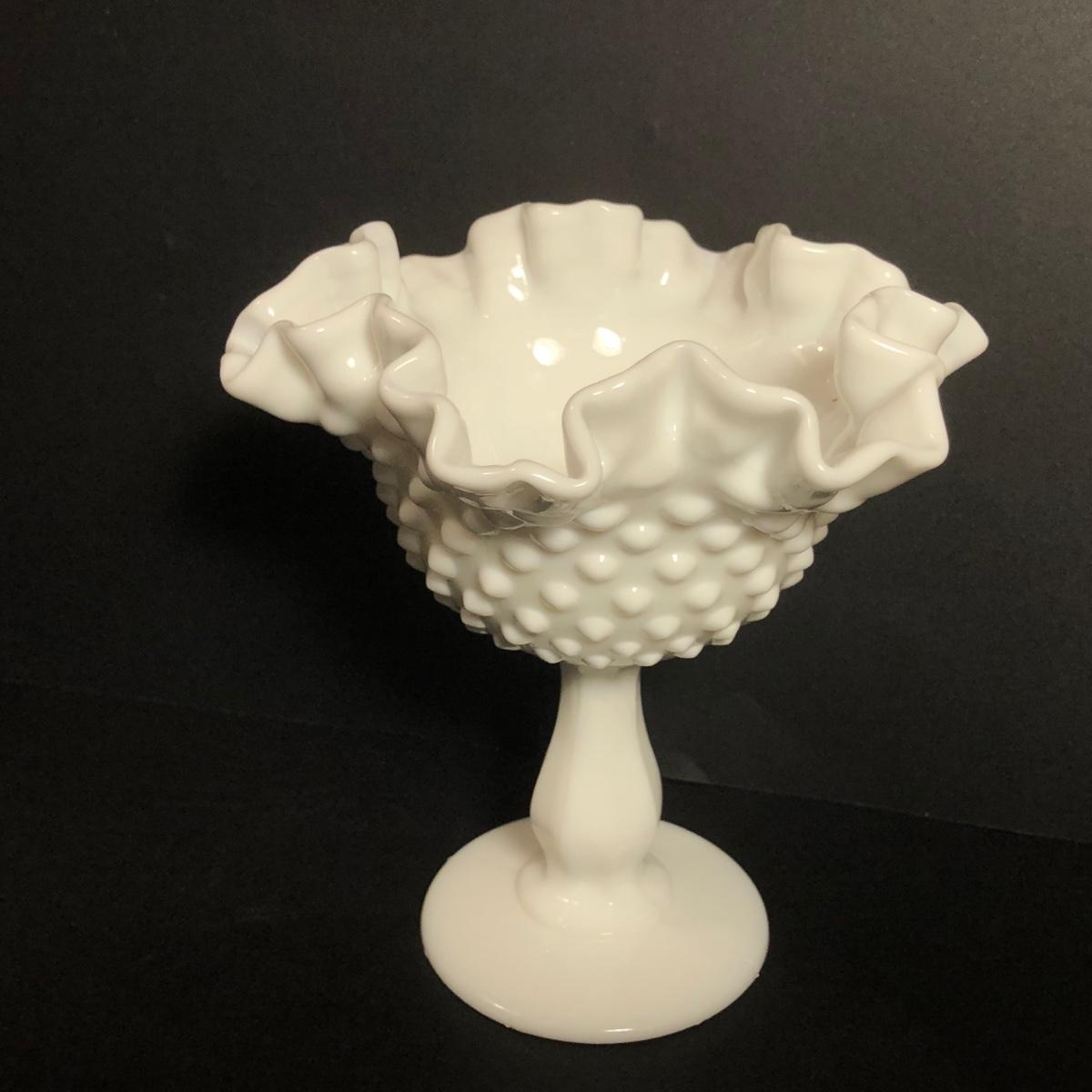 LOT 282B: Fenton Hobnail Milk Glass Pieces - Ruffled Edge Compote, Ruffled Basket, Ash Trays & Lidded Candy Dish