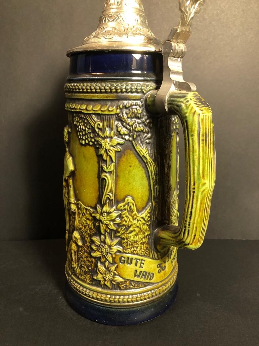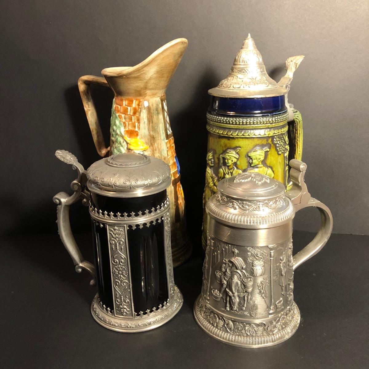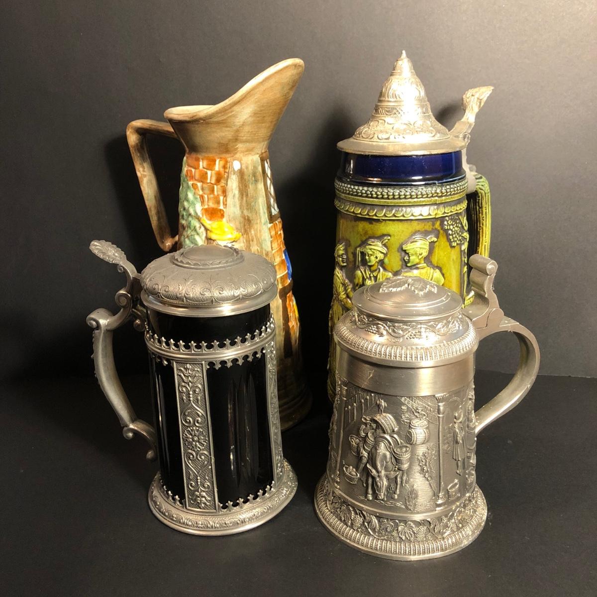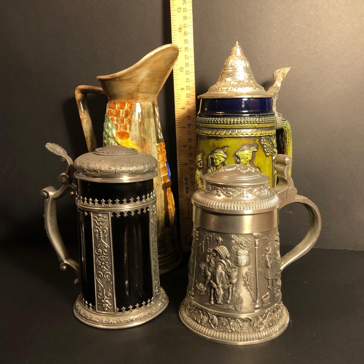 LOT 285B: Vintage Green Gerz Stein, Hand Painted Radford England Pitcher, Vintage House of Global Art Glass/Metal Stein & Metal Stein marked "SKS-Zinn"