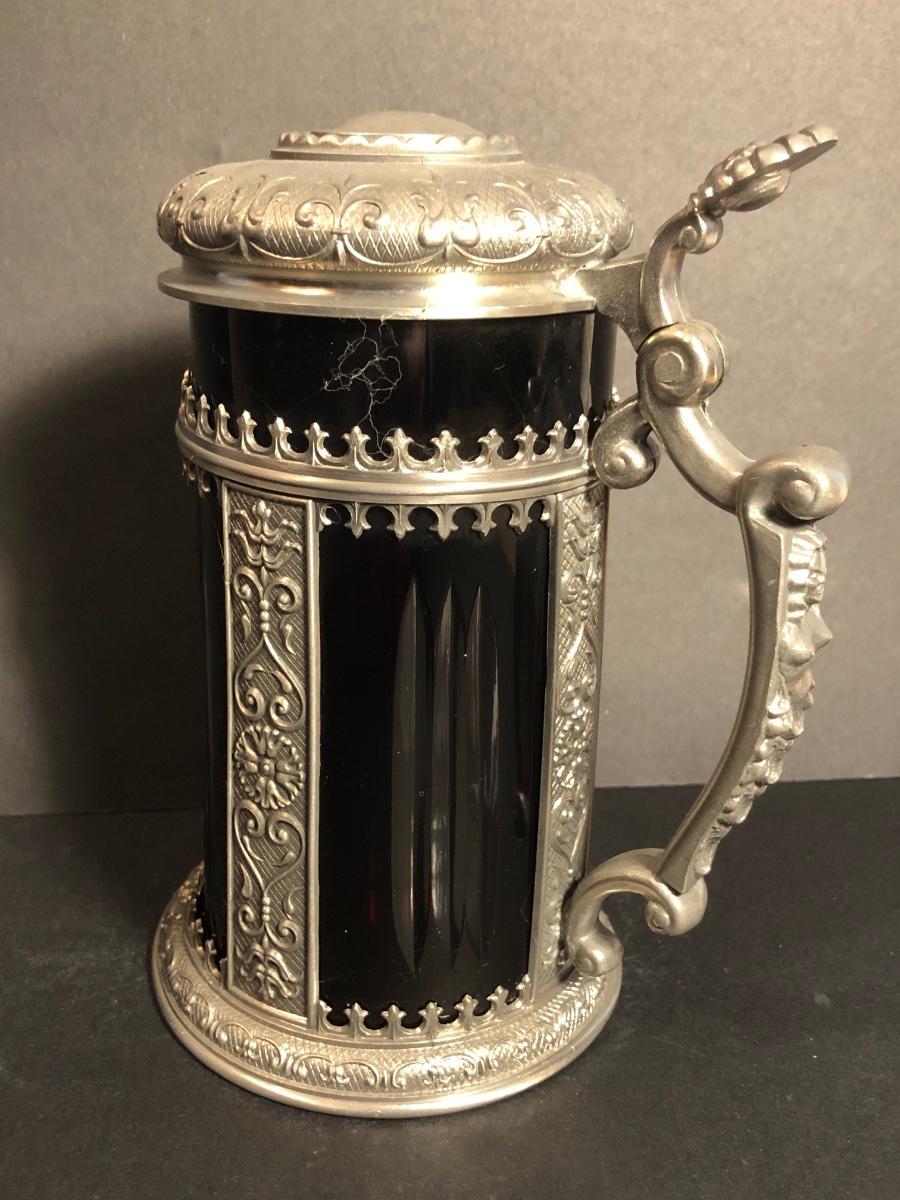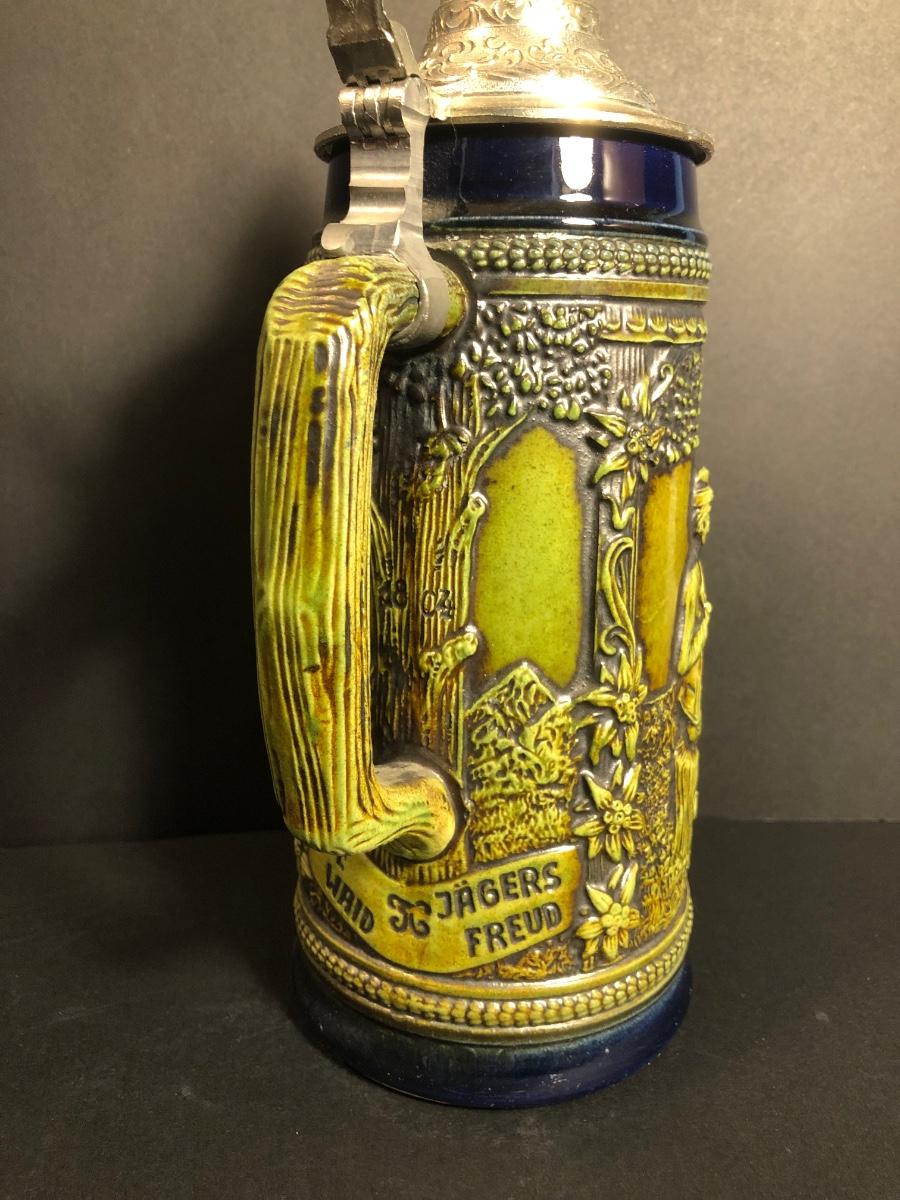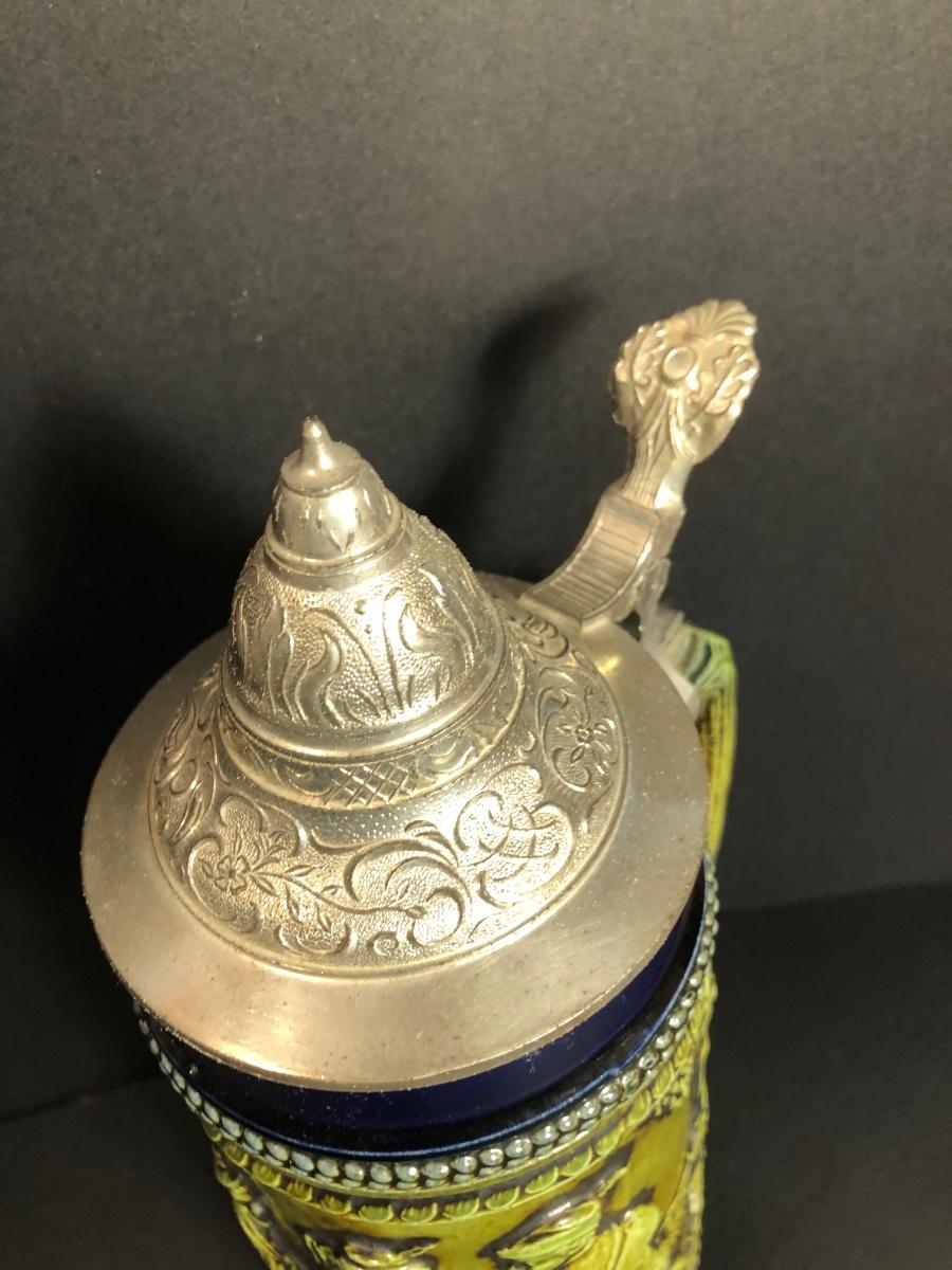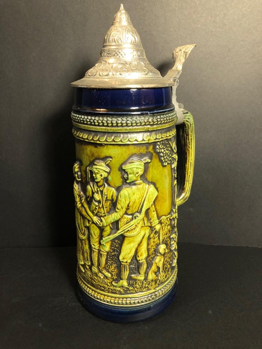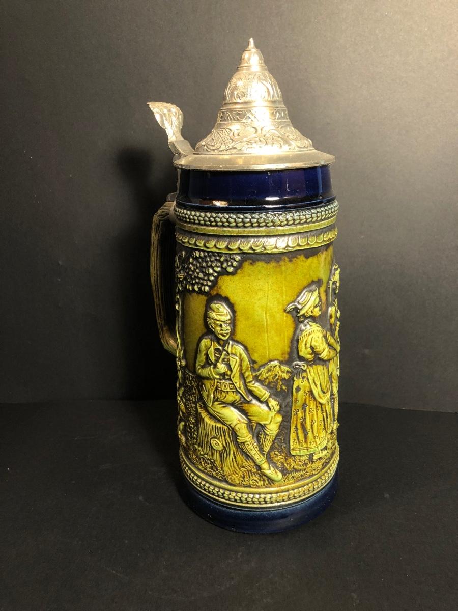 LOT 285B: Vintage Green Gerz Stein, Hand Painted Radford England Pitcher, Vintage House of Global Art Glass/Metal Stein & Metal Stein marked "SKS-Zinn"
