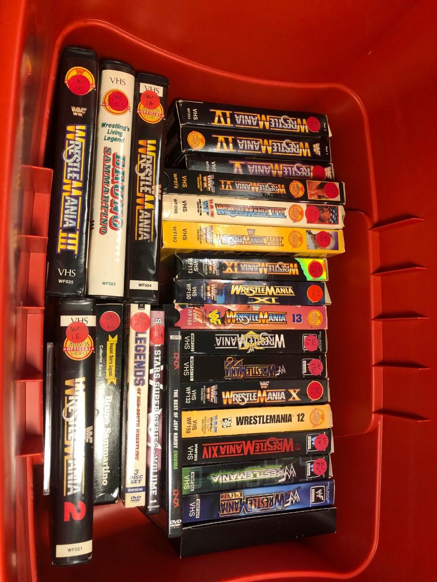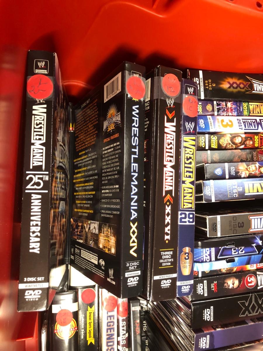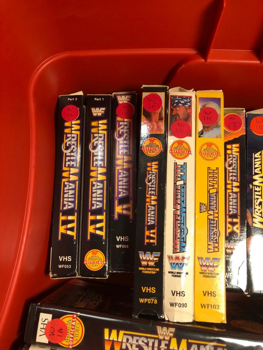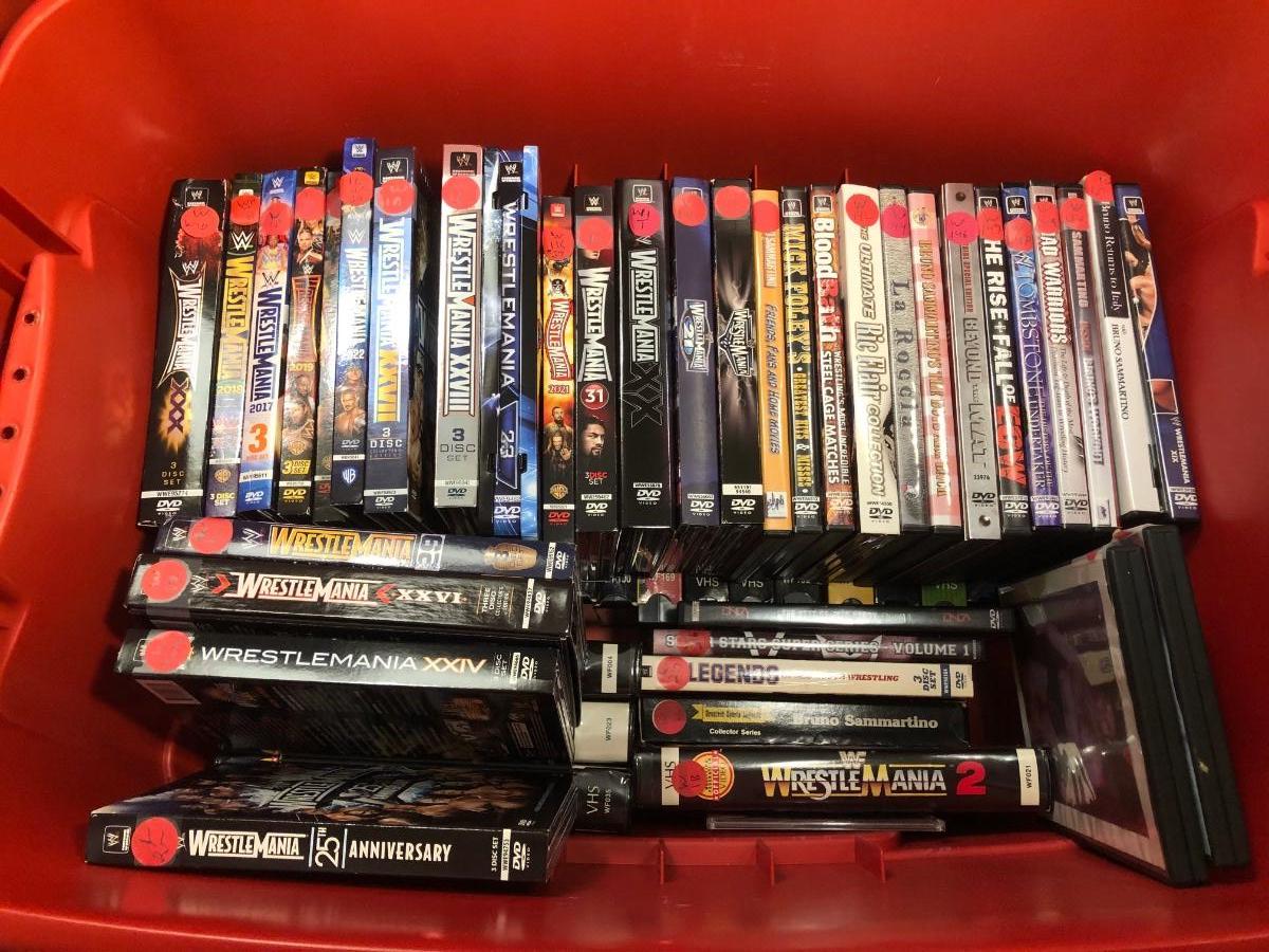 LOT 293B: Tub of Wrestling DVDs & VHS - WrestleMania & More