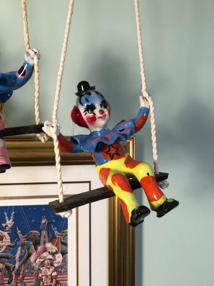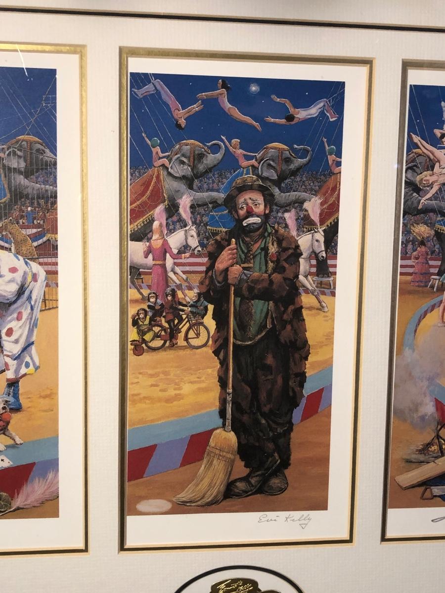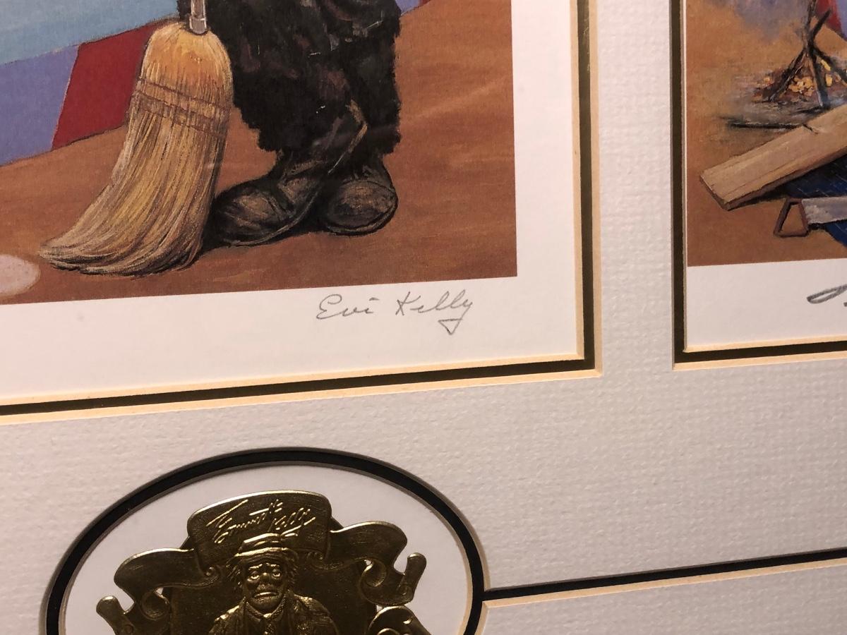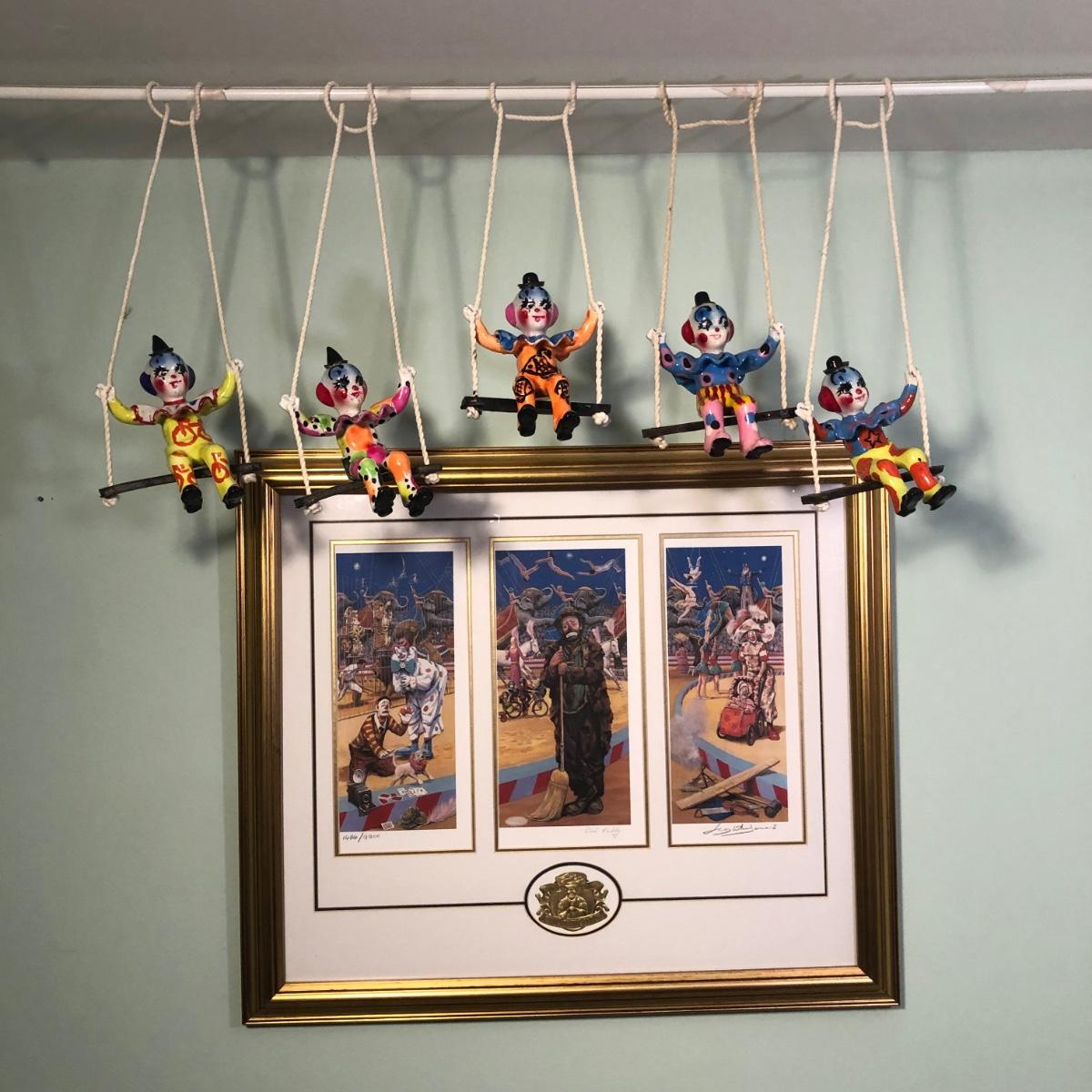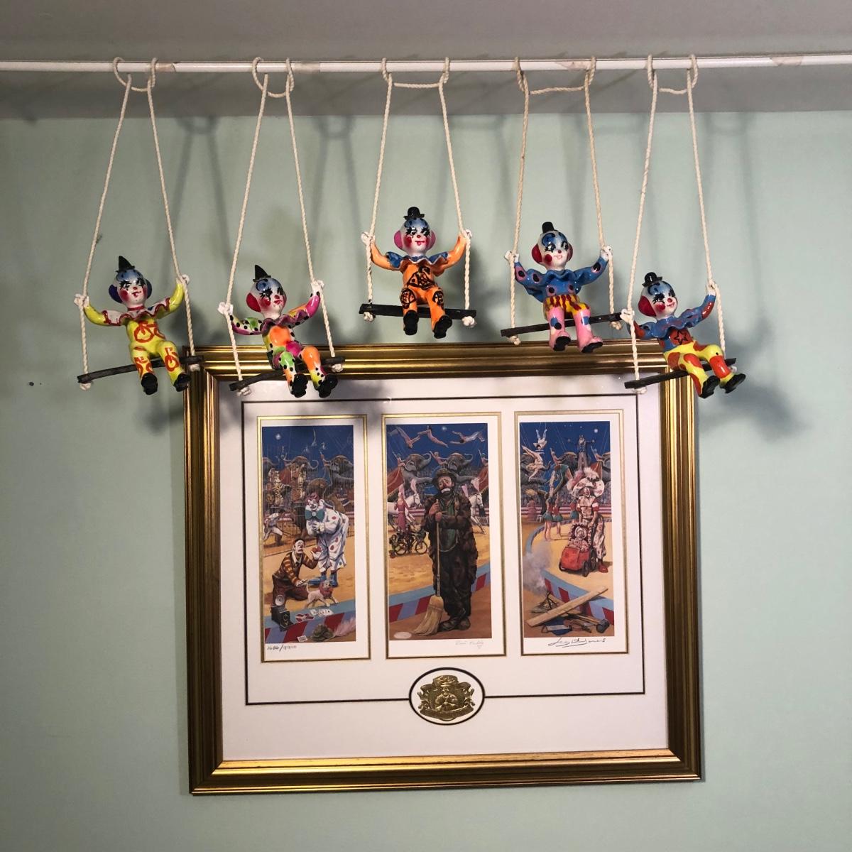 LOT 294B: Vintage Signed Emmett Kelley "In the Spotlight" Lithograph w/ Five Swinging Ceramic Clowns