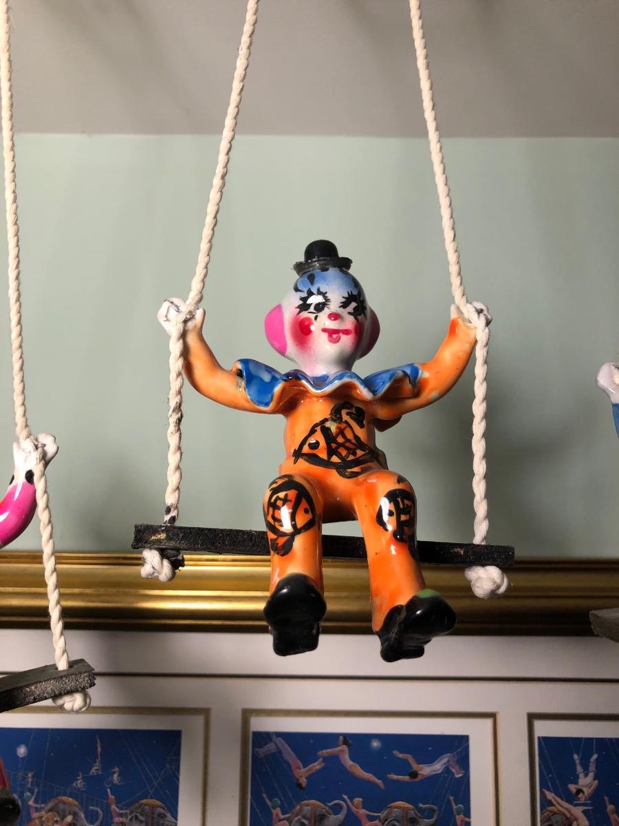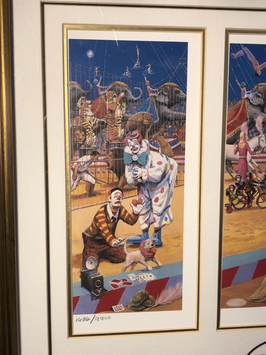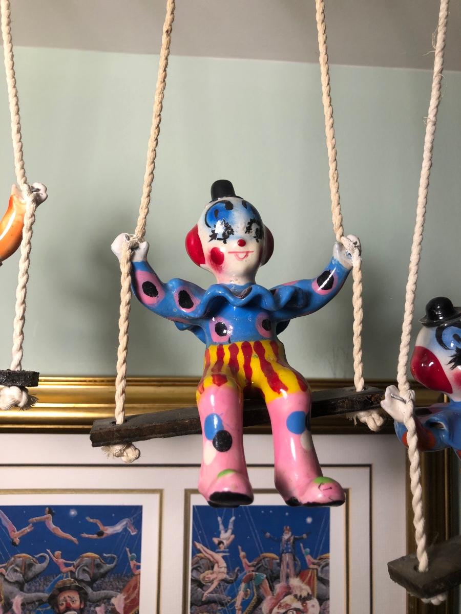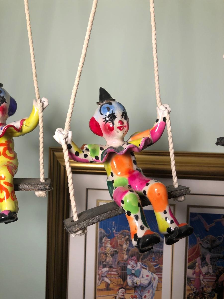 LOT 294B: Vintage Signed Emmett Kelley "In the Spotlight" Lithograph w/ Five Swinging Ceramic Clowns