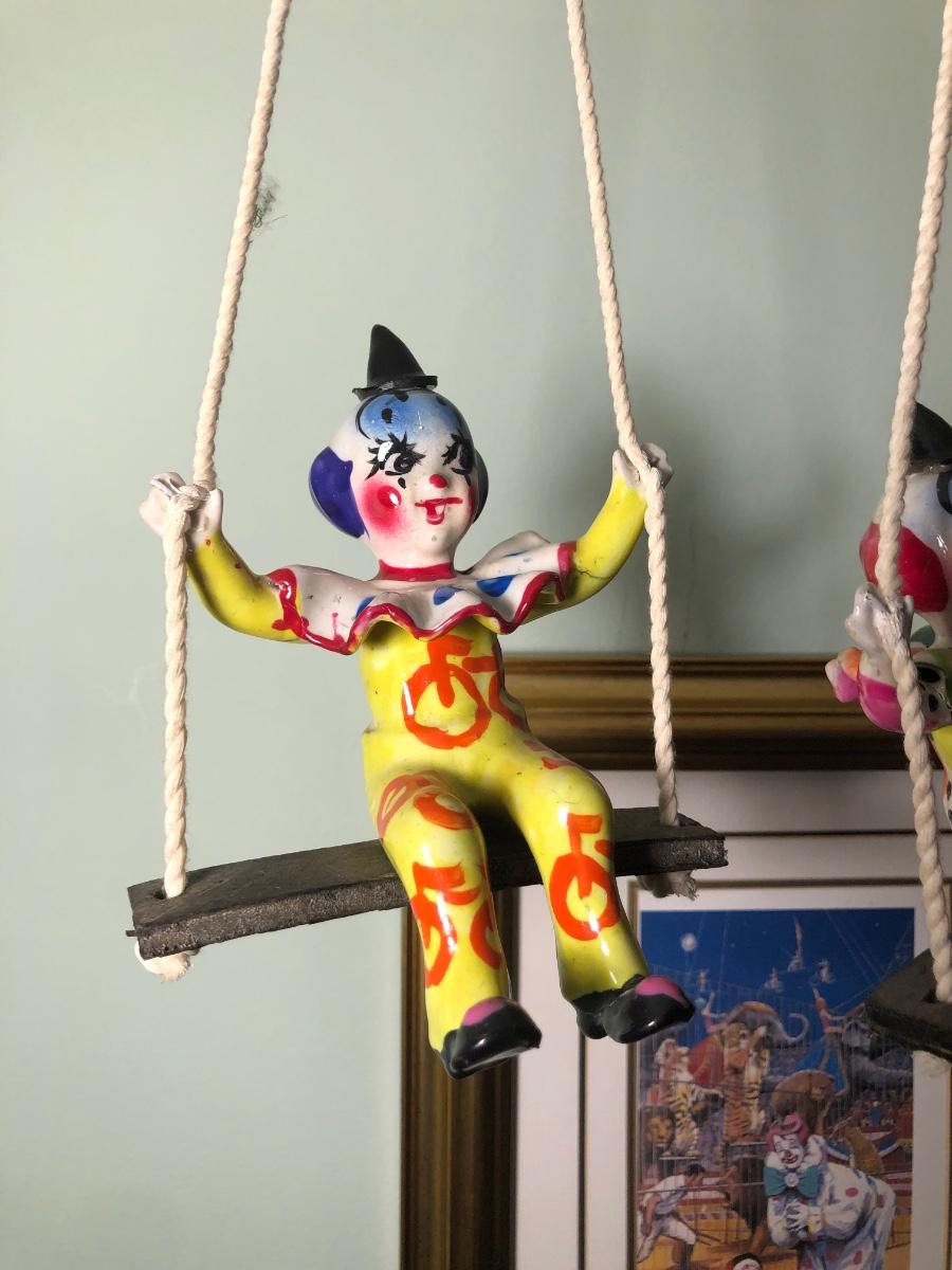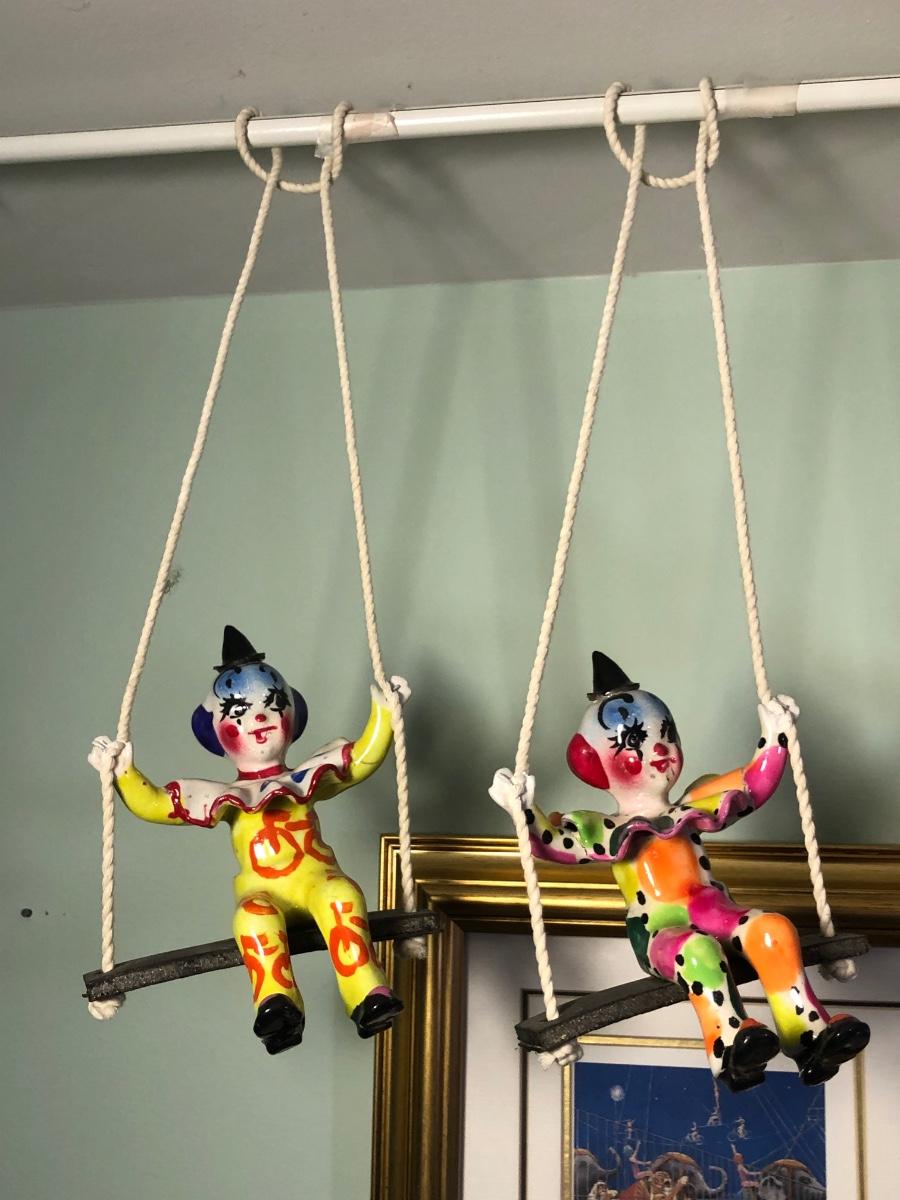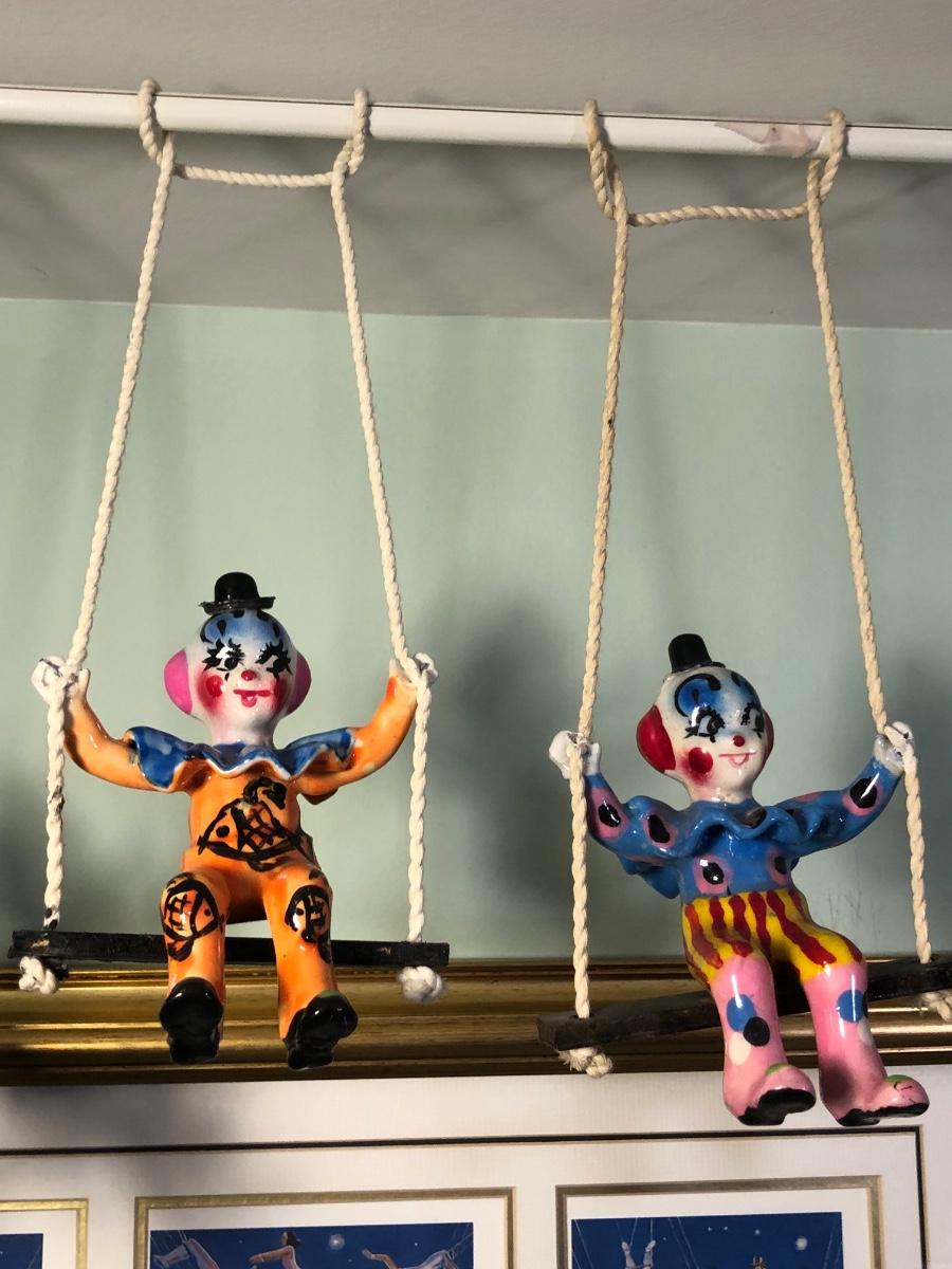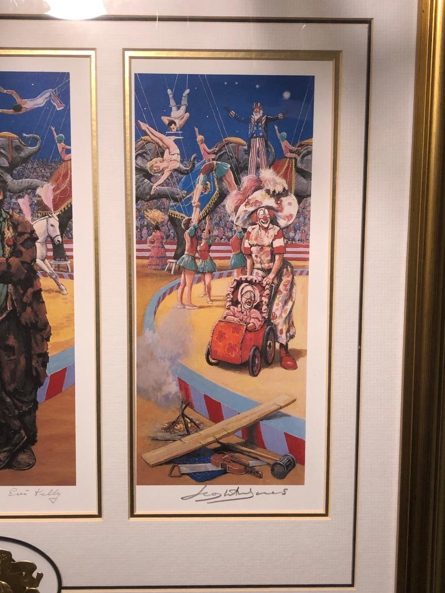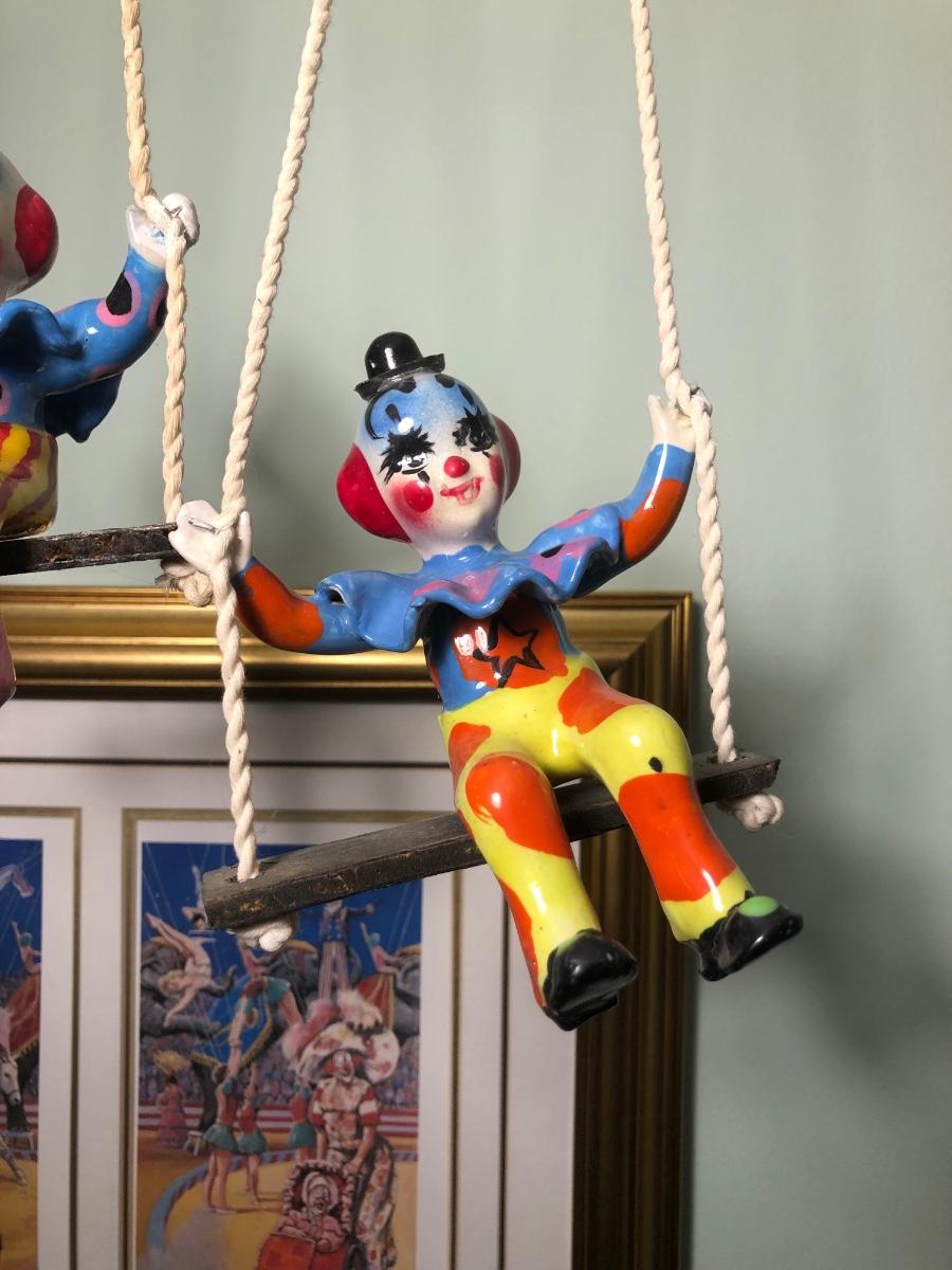 LOT 294B: Vintage Signed Emmett Kelley "In the Spotlight" Lithograph w/ Five Swinging Ceramic Clowns