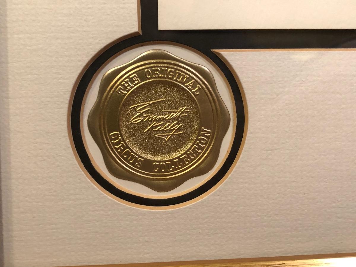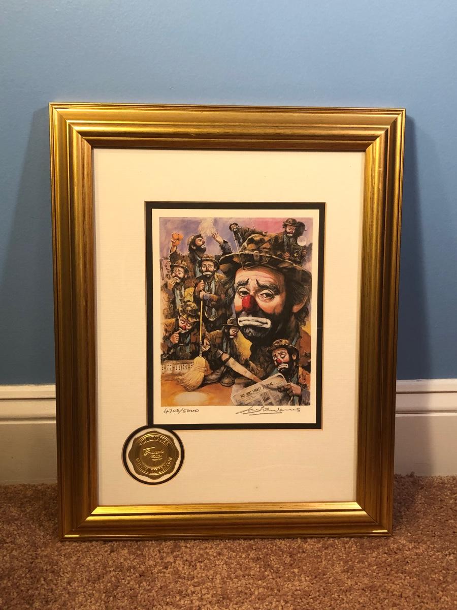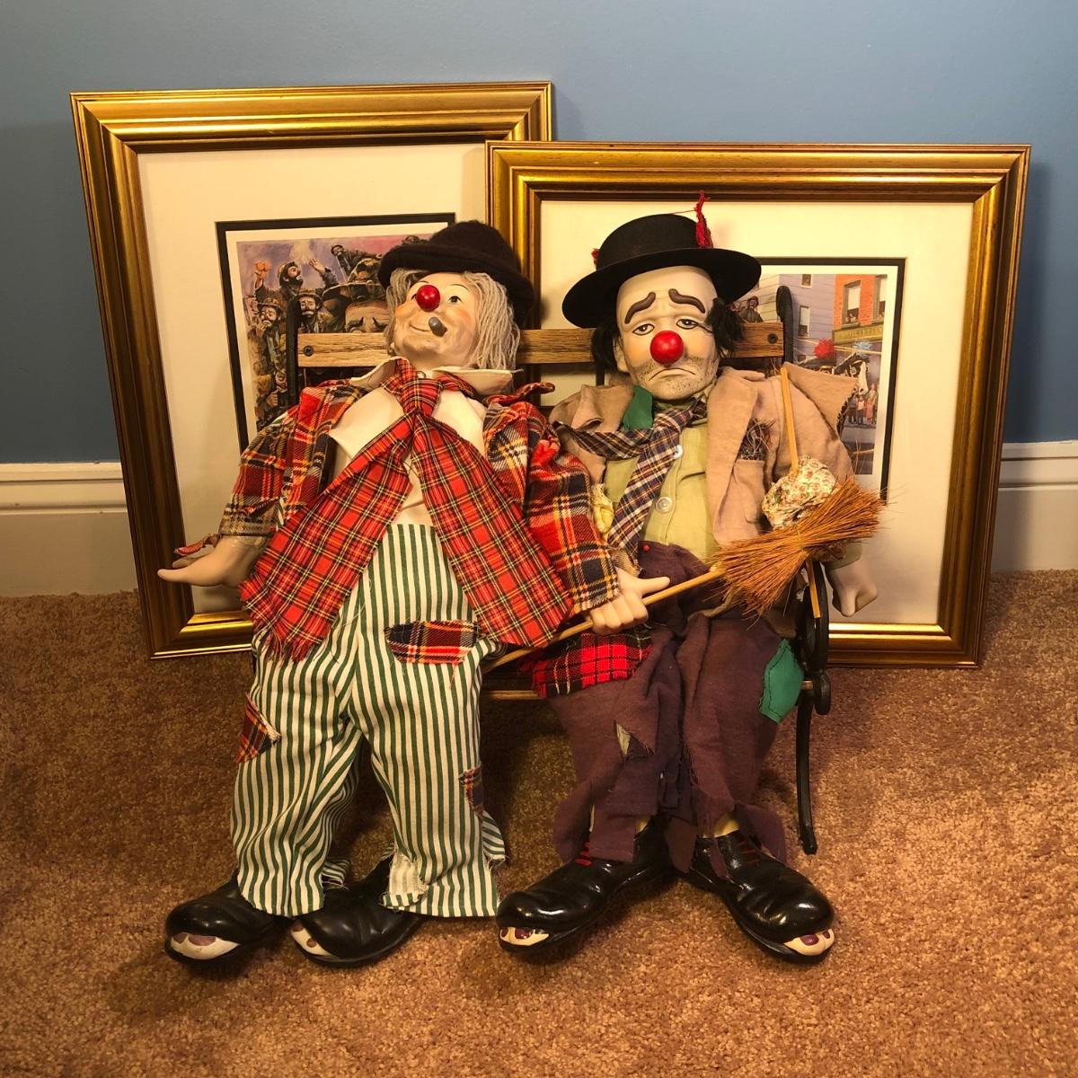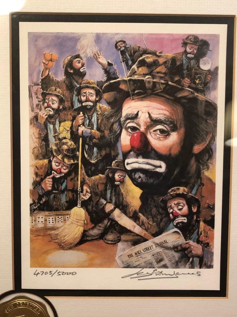 LOT 297B: Framed Signed Emmett Kelly Original Circus Collection Leighton Jones Lithographs & Ceramic / Cloth Clowns on Miniature Bench
