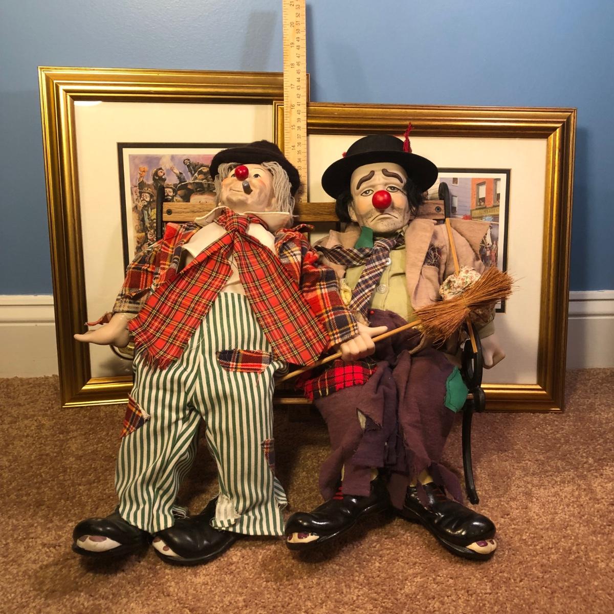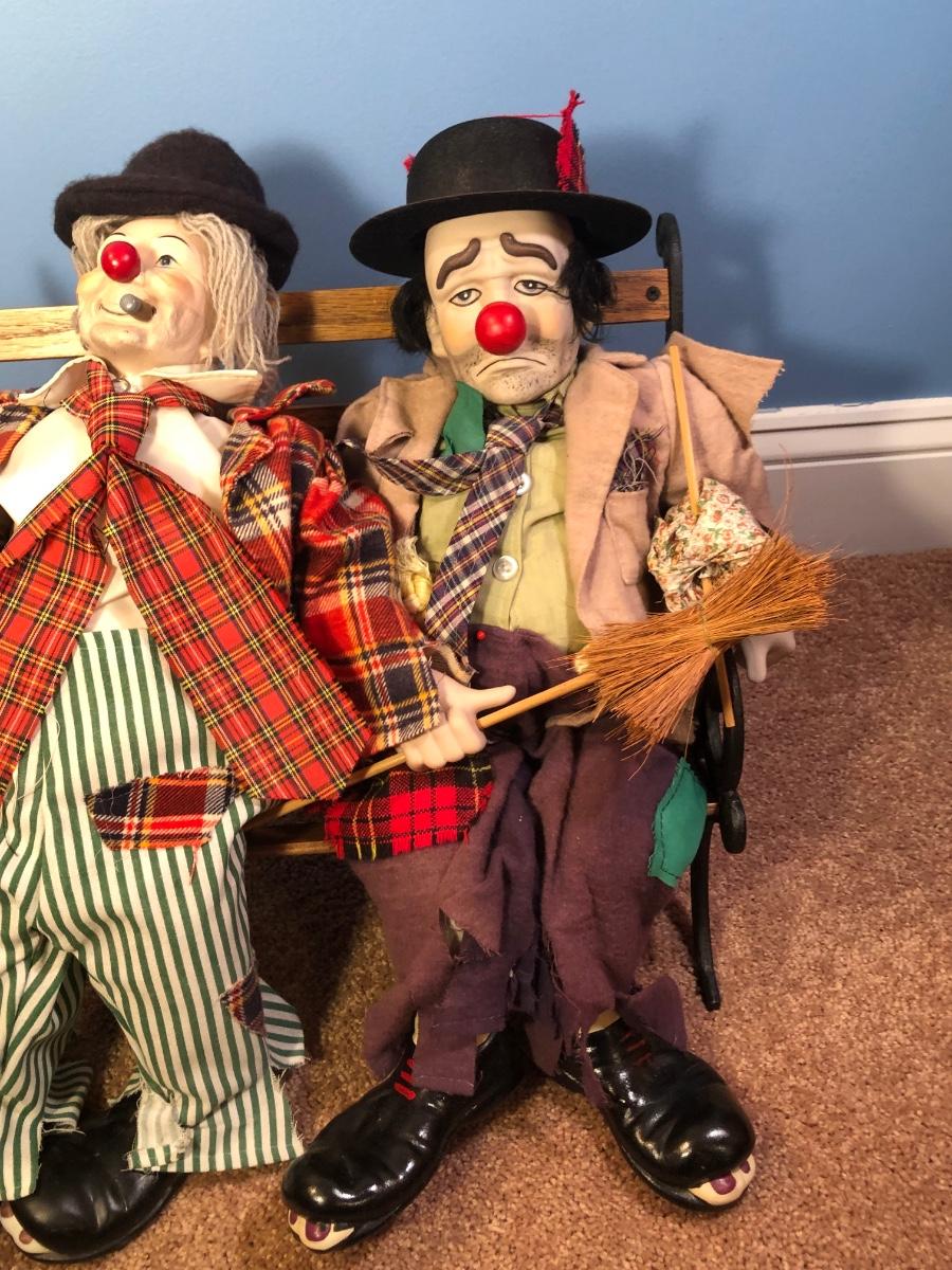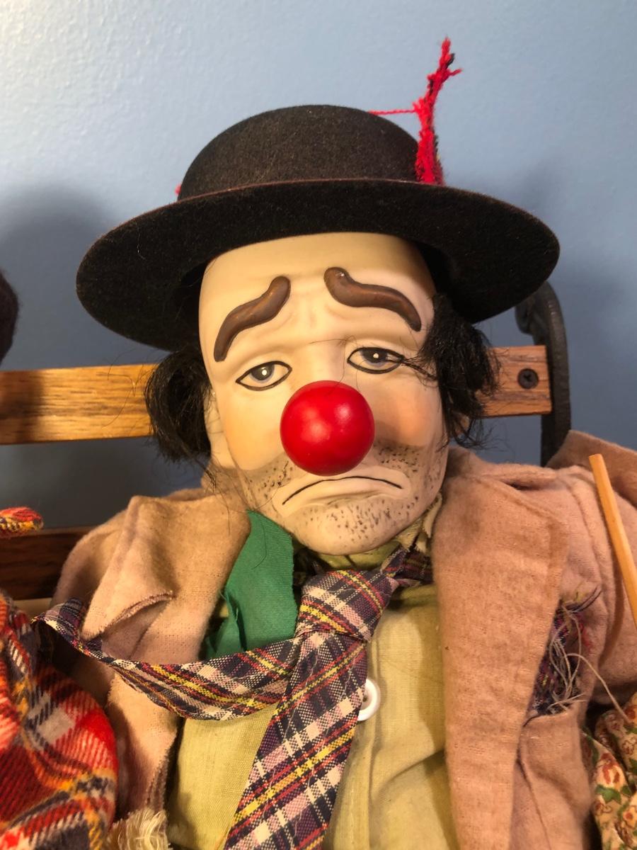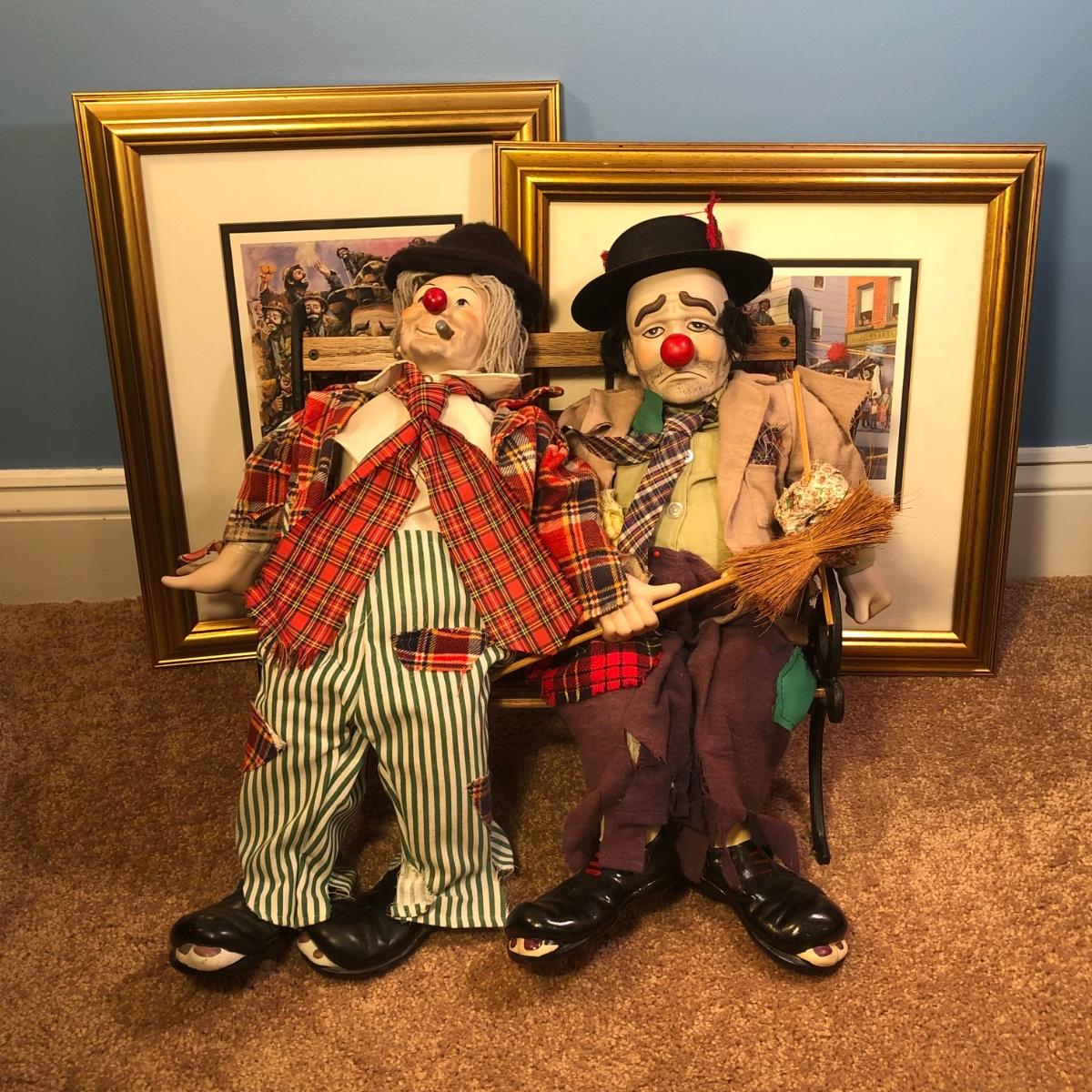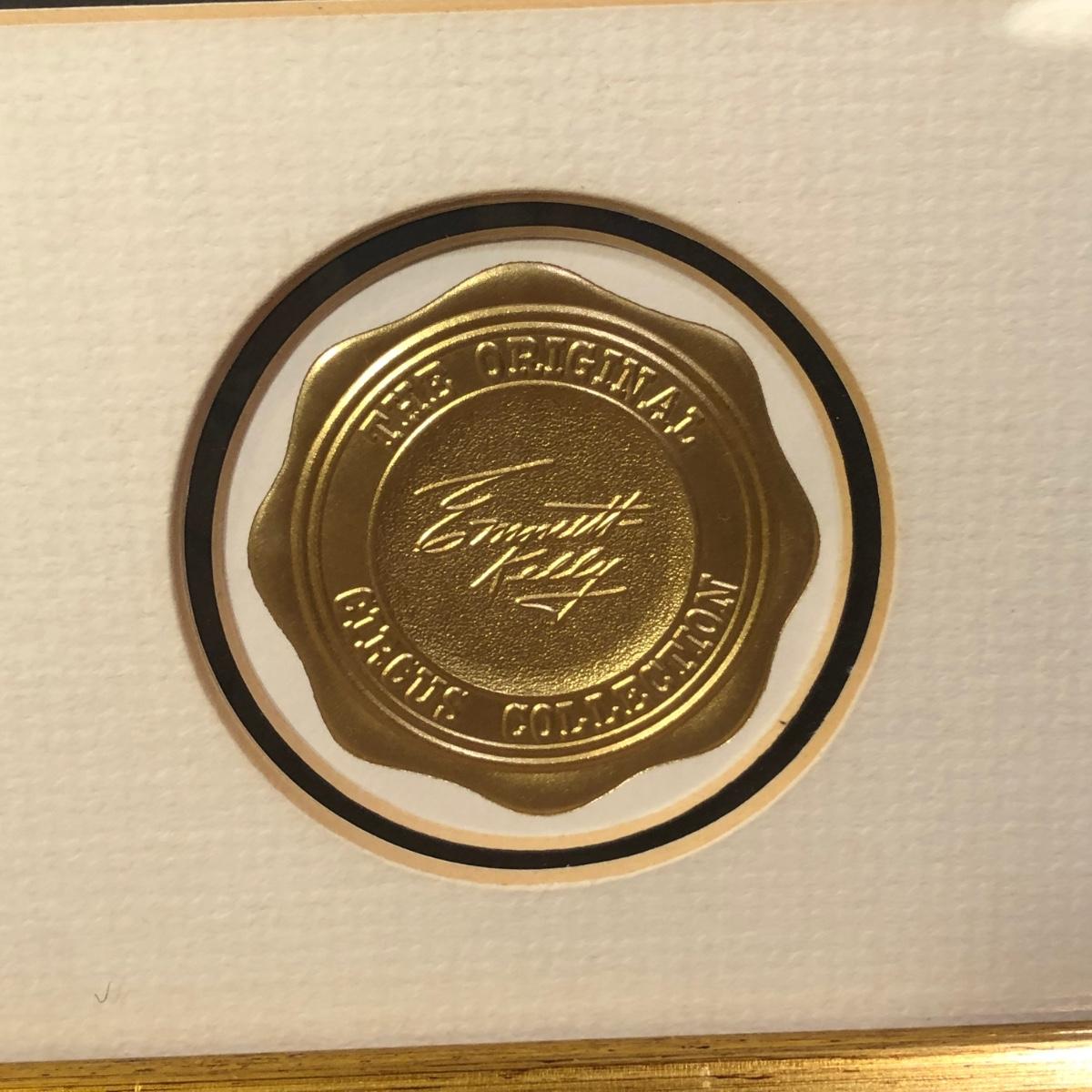 LOT 297B: Framed Signed Emmett Kelly Original Circus Collection Leighton Jones Lithographs & Ceramic / Cloth Clowns on Miniature Bench