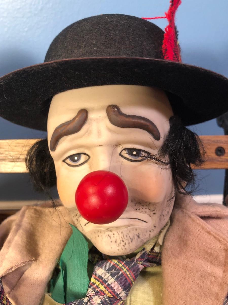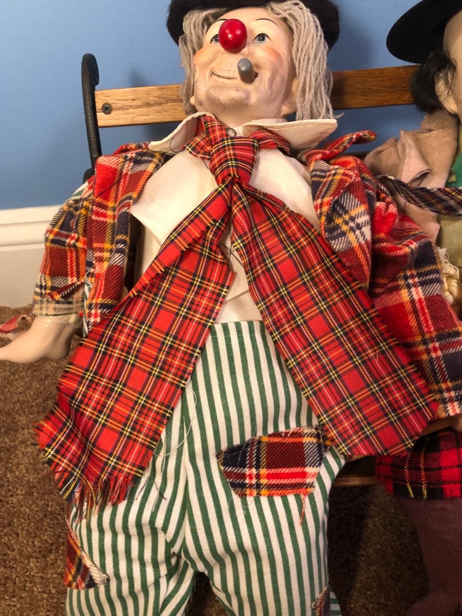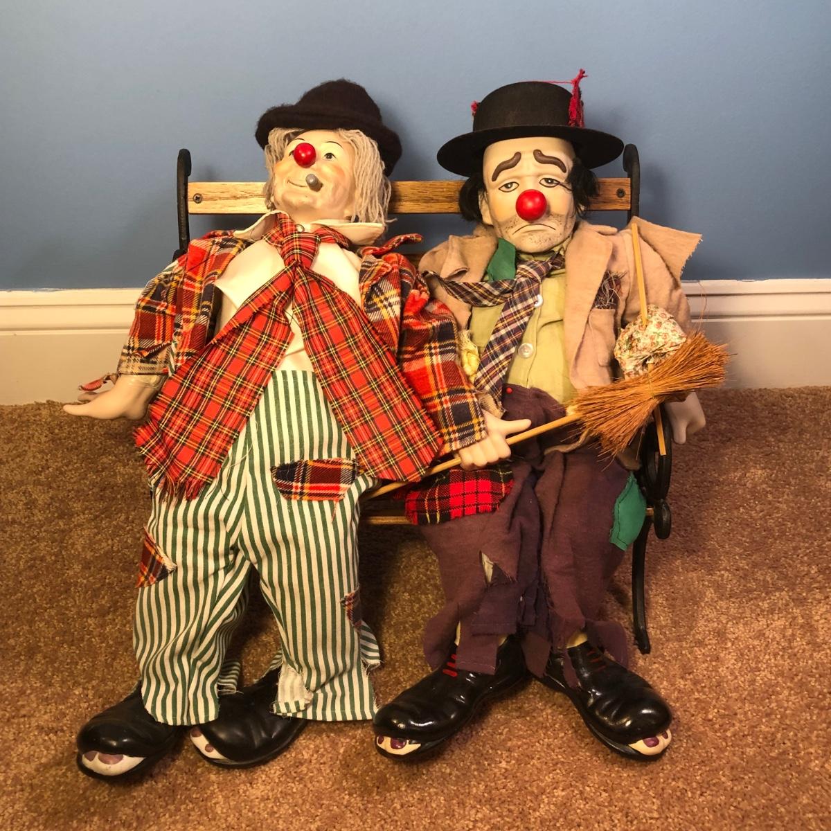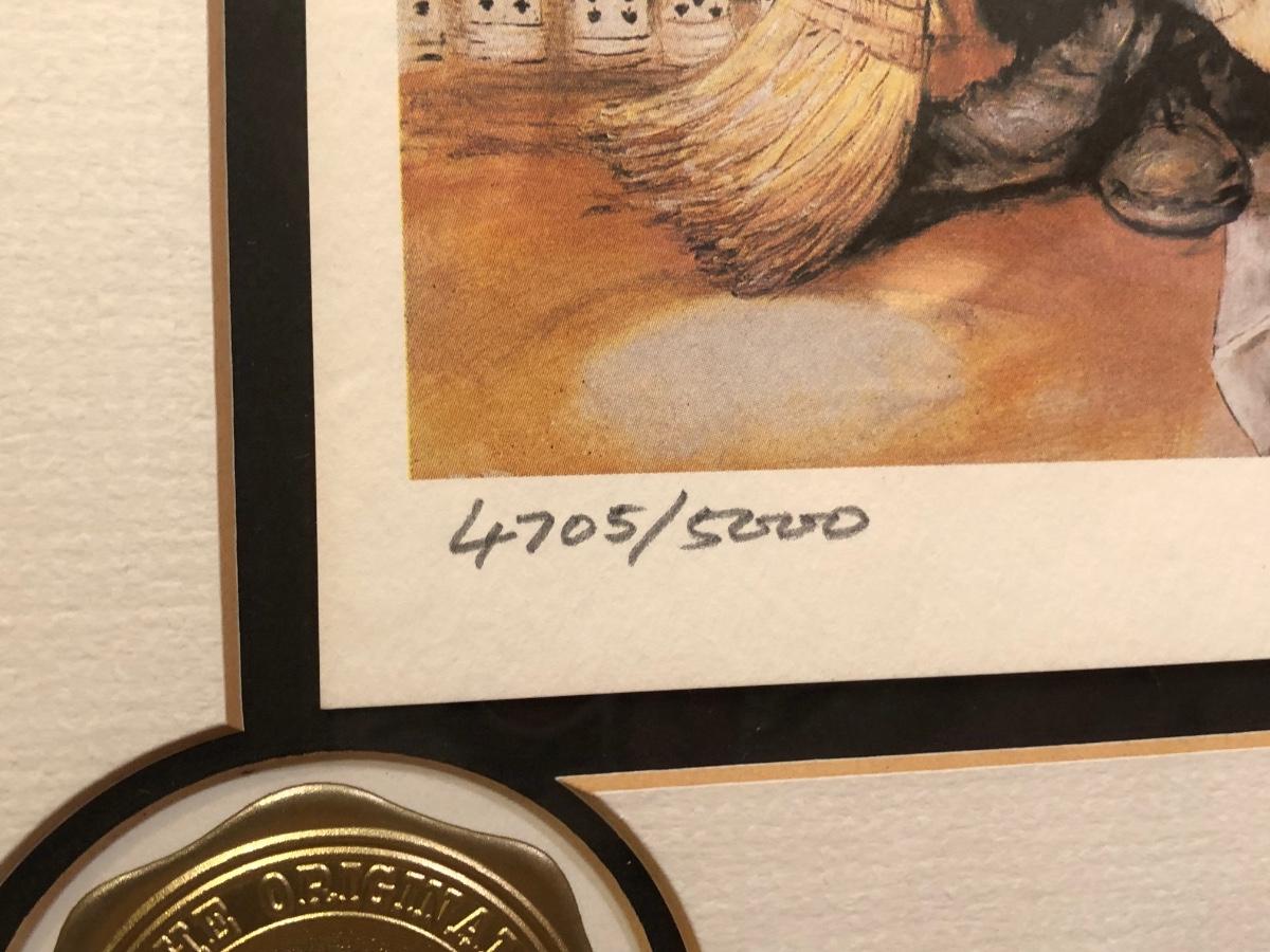 LOT 297B: Framed Signed Emmett Kelly Original Circus Collection Leighton Jones Lithographs & Ceramic / Cloth Clowns on Miniature Bench
