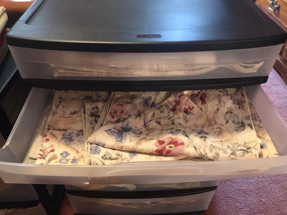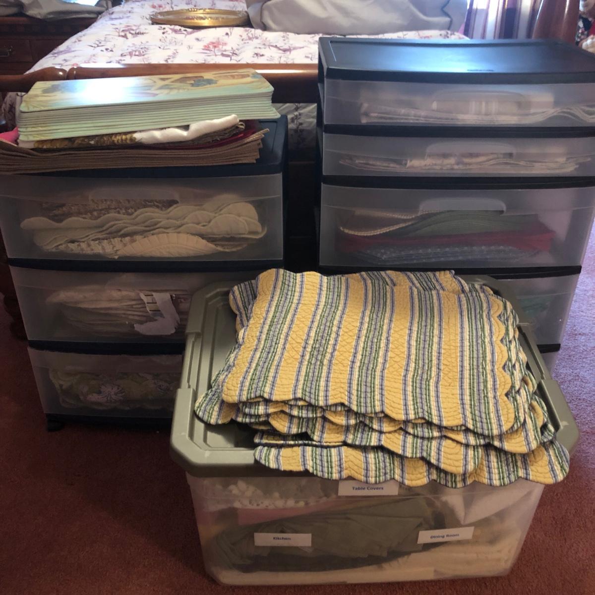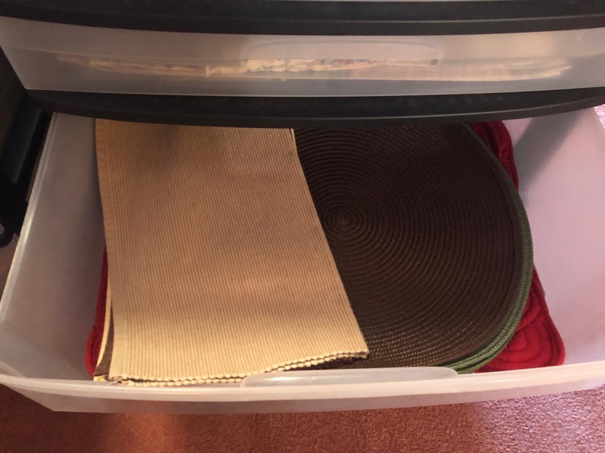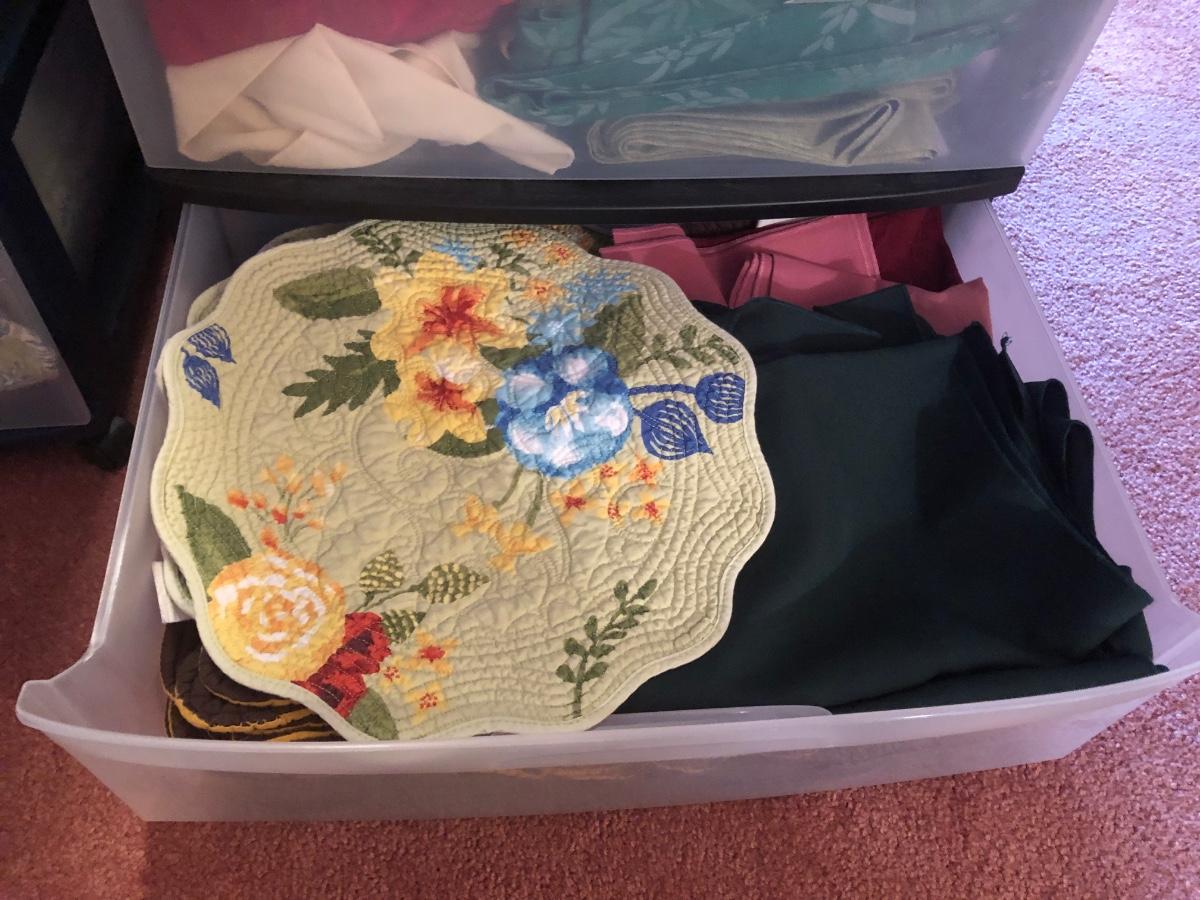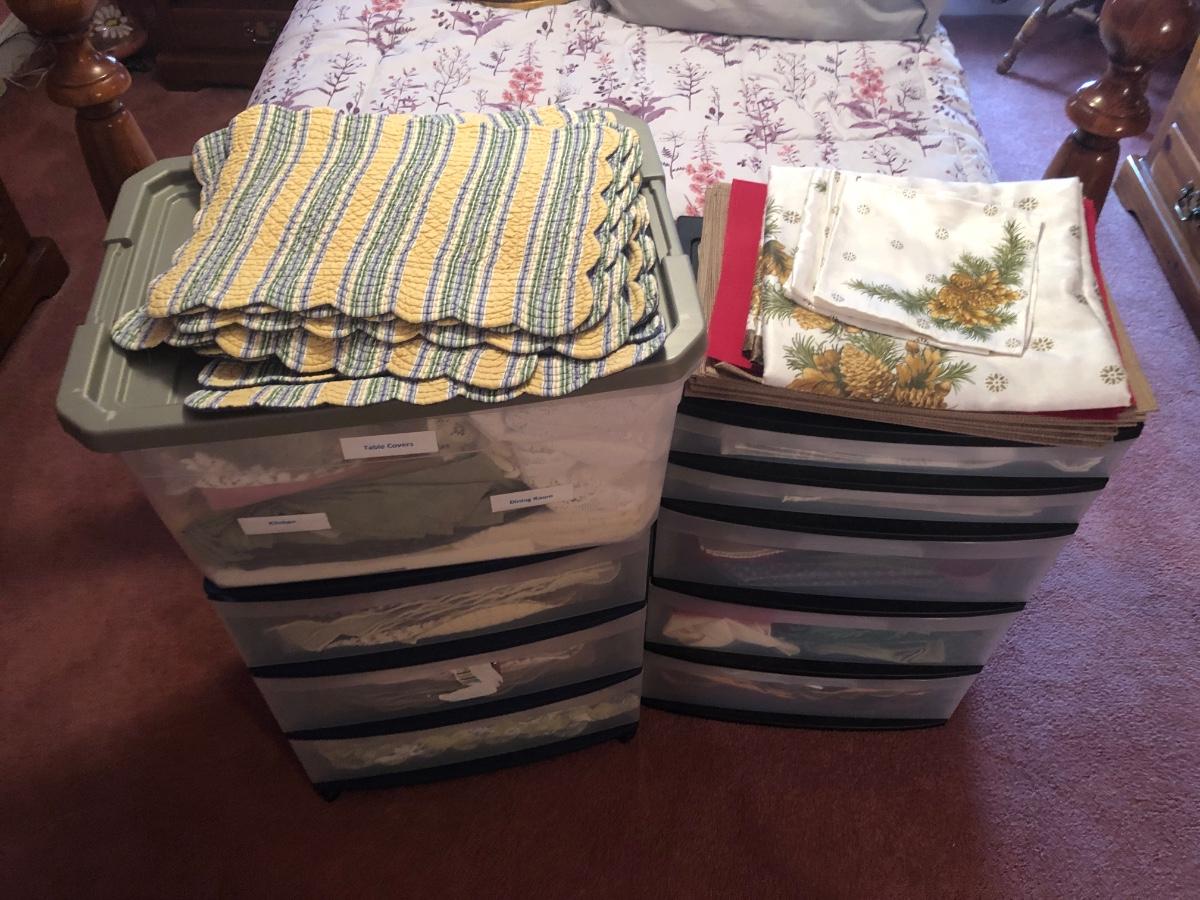 LOT 311PB: Steralite Plastic Drawers & Bin FULL of Kitchen & Dining Linens - Placemats, Runners, Tablecloths & More