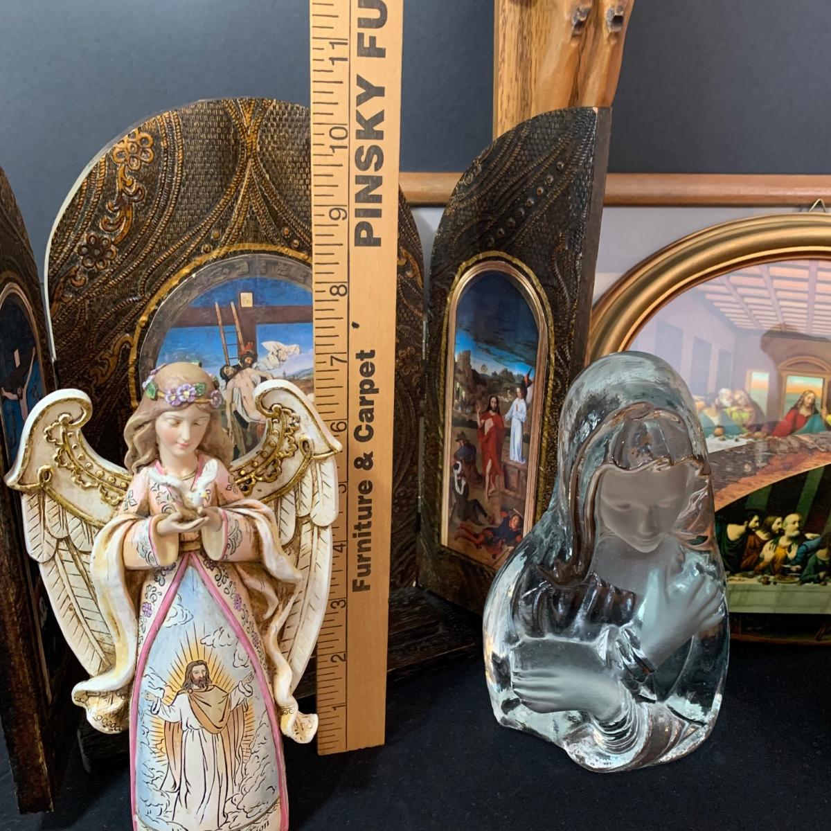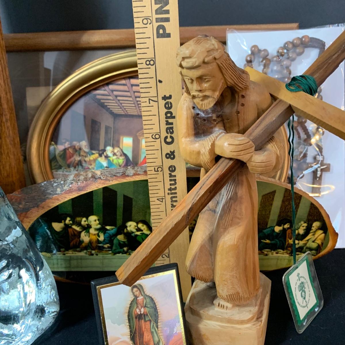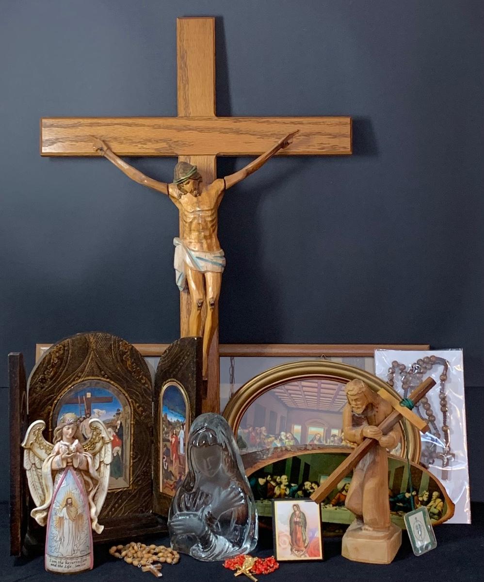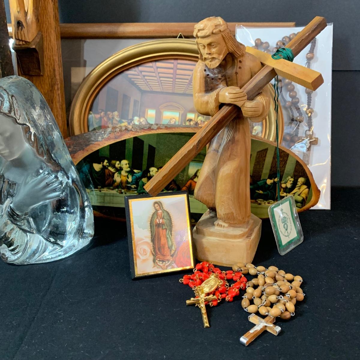 LOT 329K: Religious Collection: Large Wooden Jointed Crucifix, Rosaries, Last Supper Prints, Carved Wooden Sculpture & More