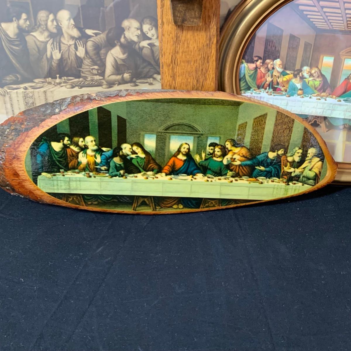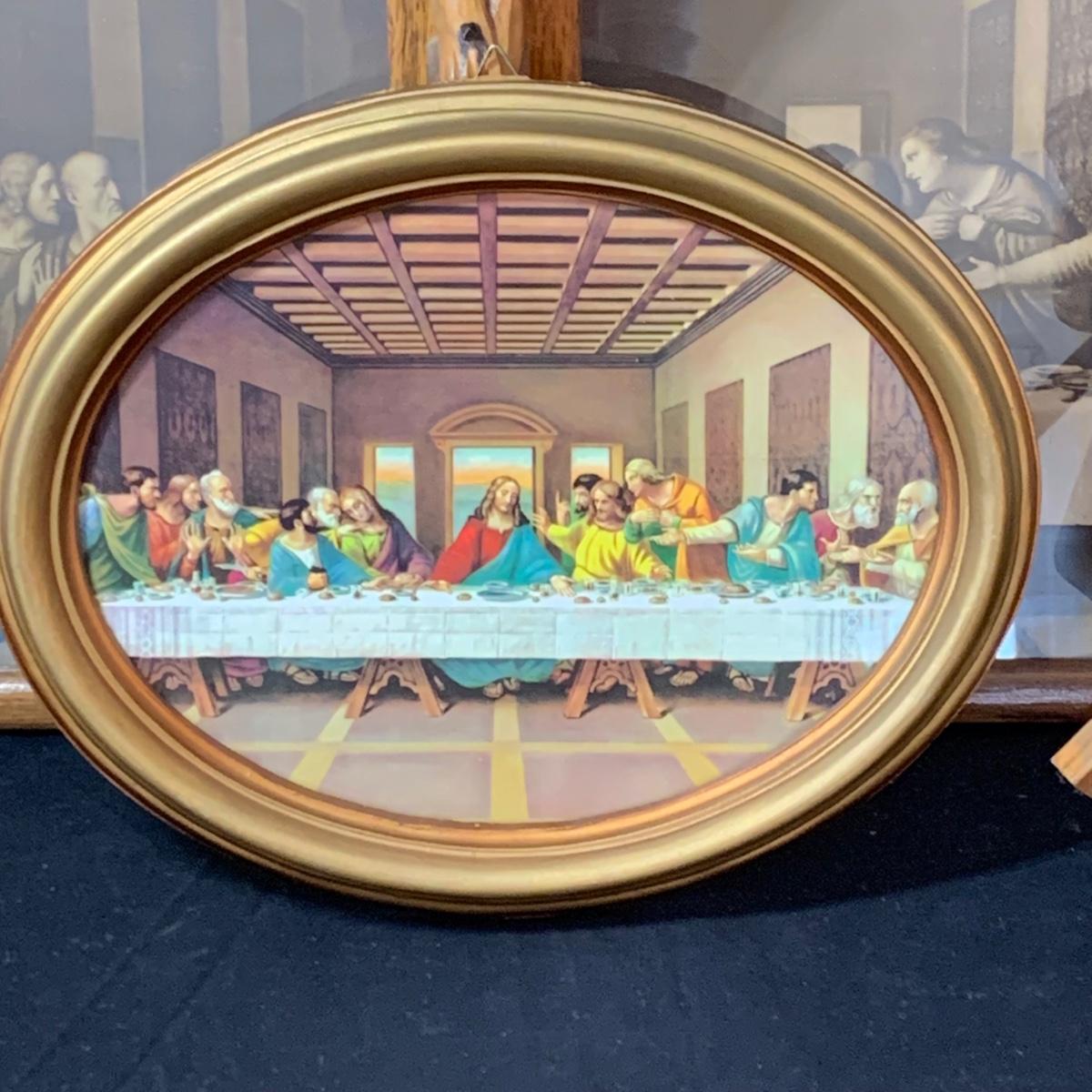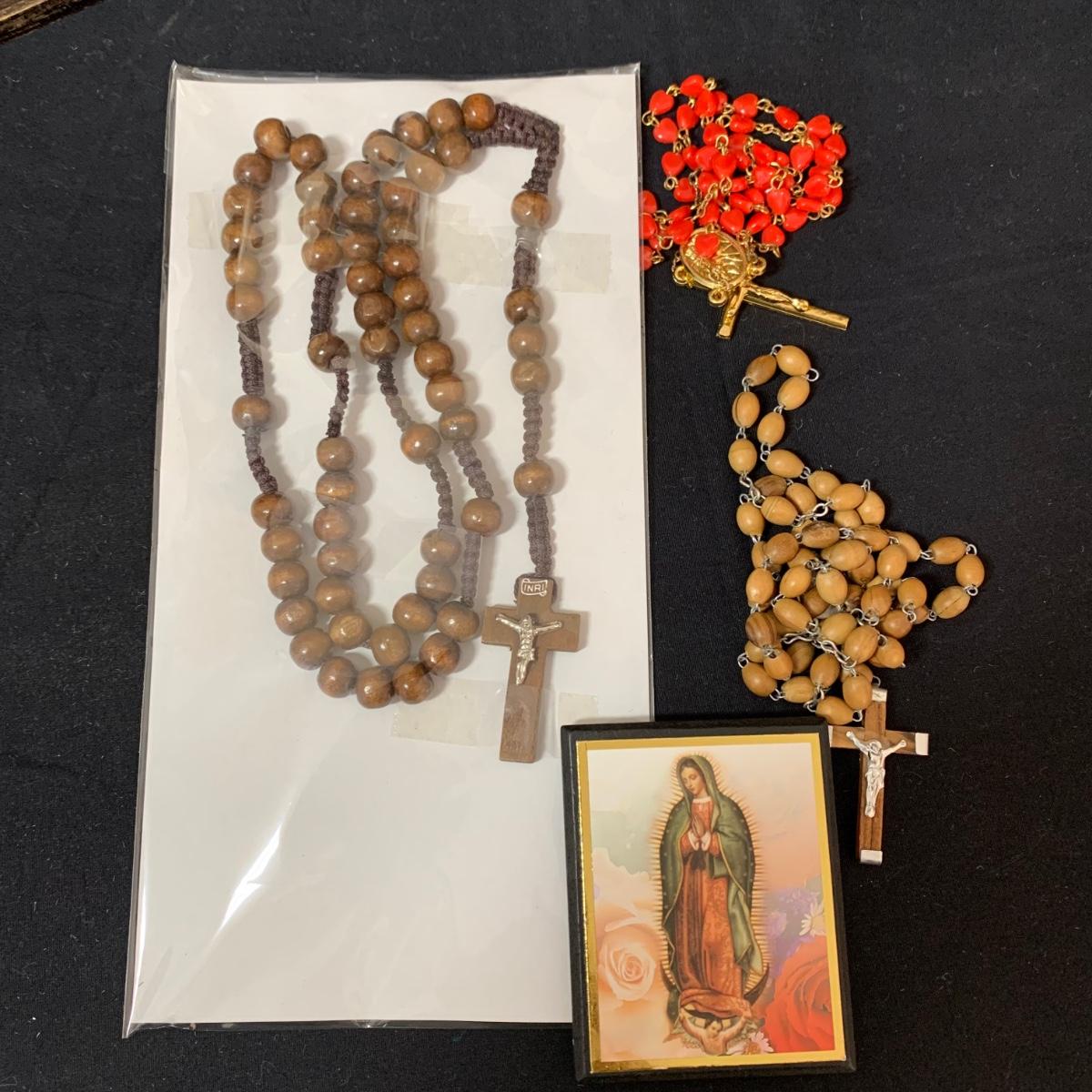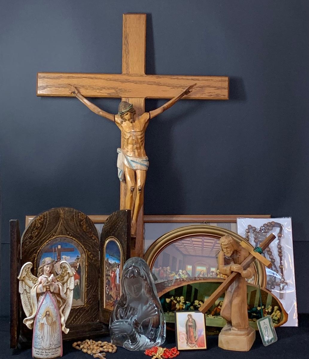 LOT 329K: Religious Collection: Large Wooden Jointed Crucifix, Rosaries, Last Supper Prints, Carved Wooden Sculpture & More
