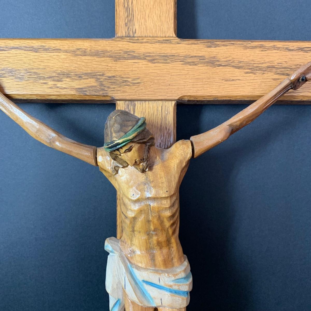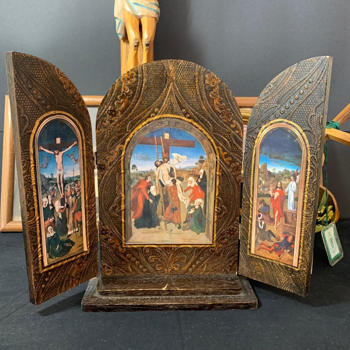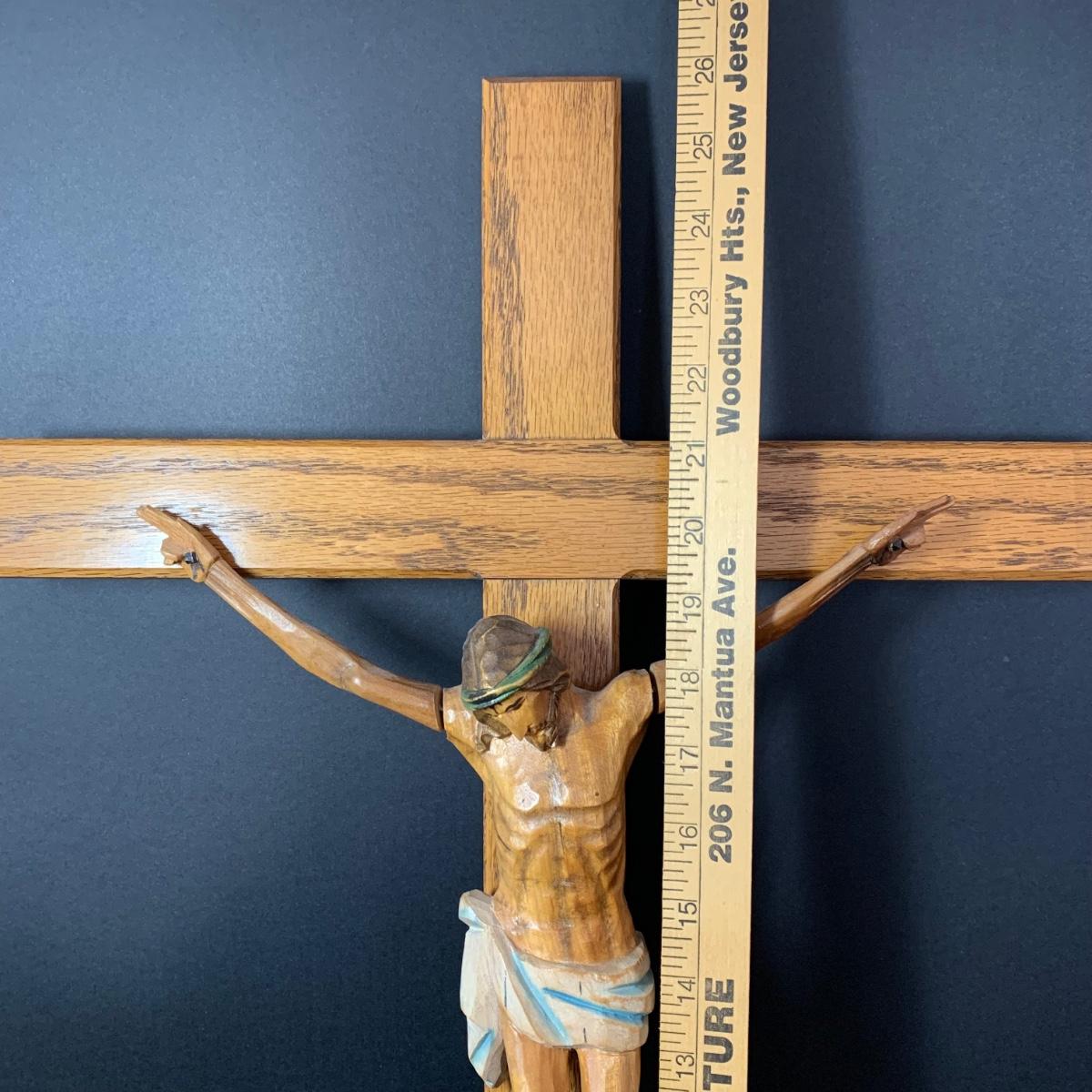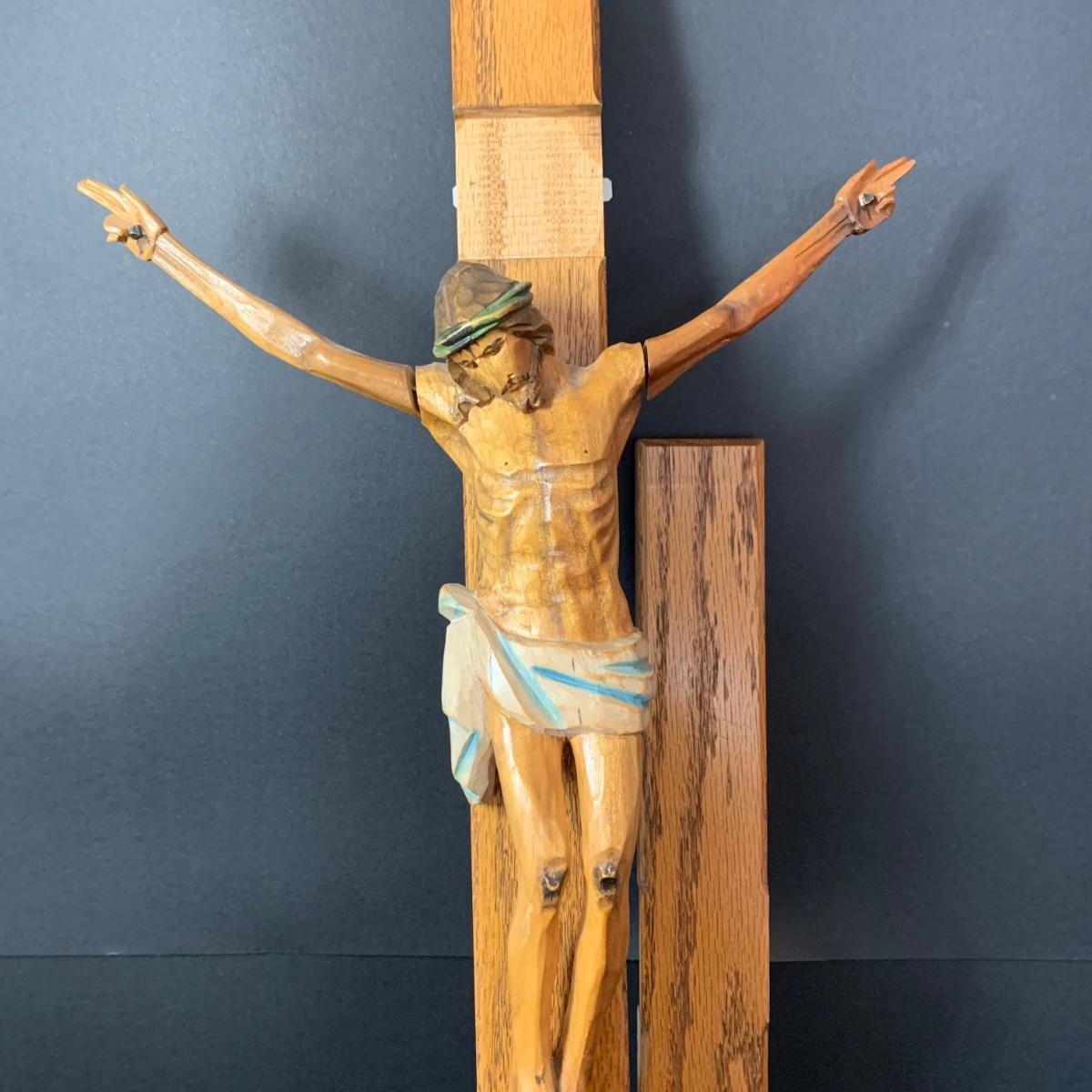 LOT 329K: Religious Collection: Large Wooden Jointed Crucifix, Rosaries, Last Supper Prints, Carved Wooden Sculpture & More