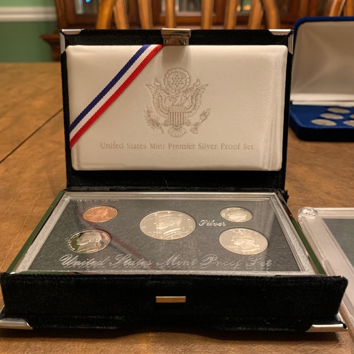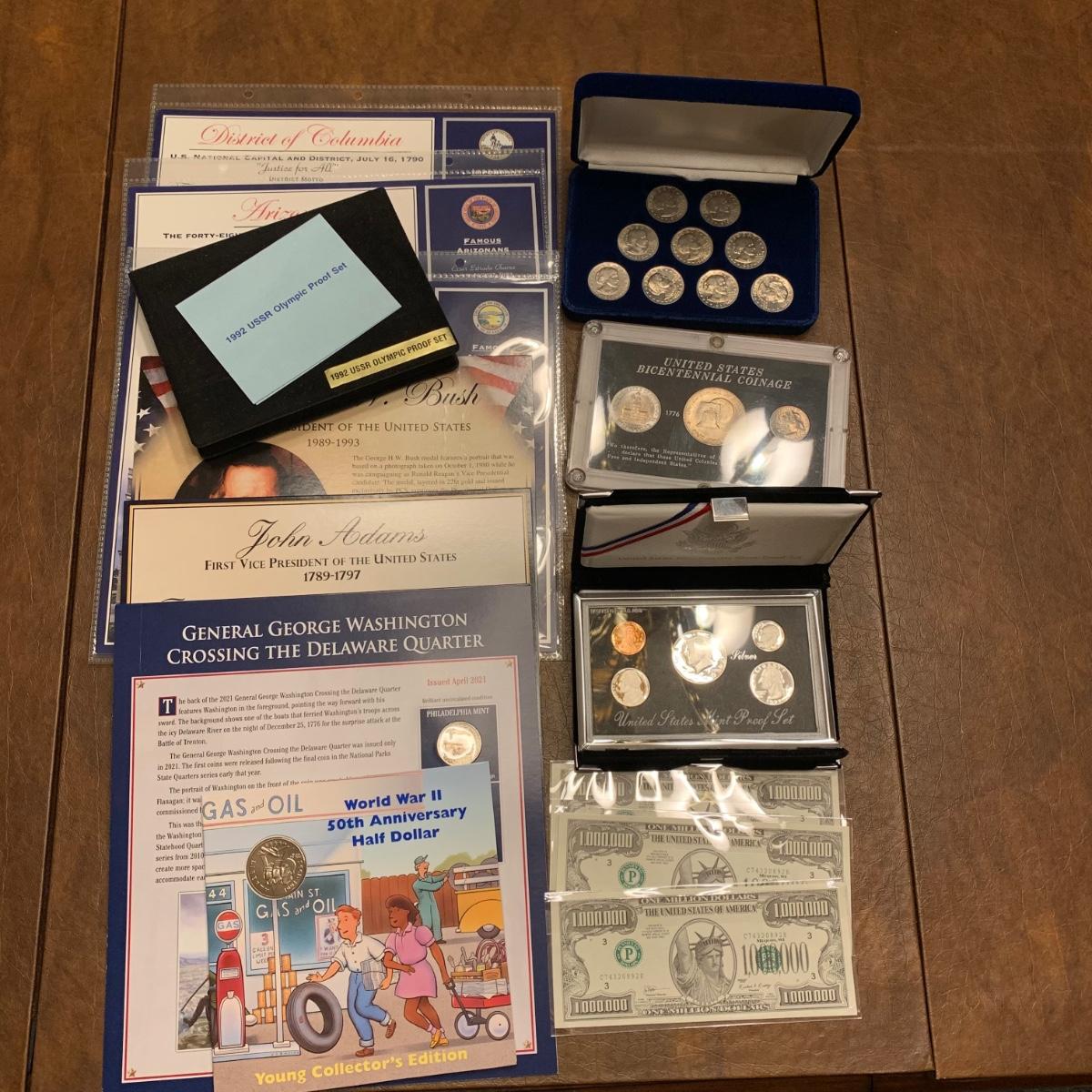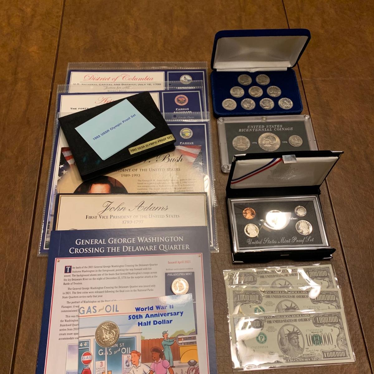 LOT 350L: COINS: US Mint Premier Silver Proof Set, US Bicentennial Coinage Set, Susan B Anthony 9 Coin Set, 1992 USSR Olympic Proof Set, Presidential & State Coins, WWII 50th Anniversary Half Dollar