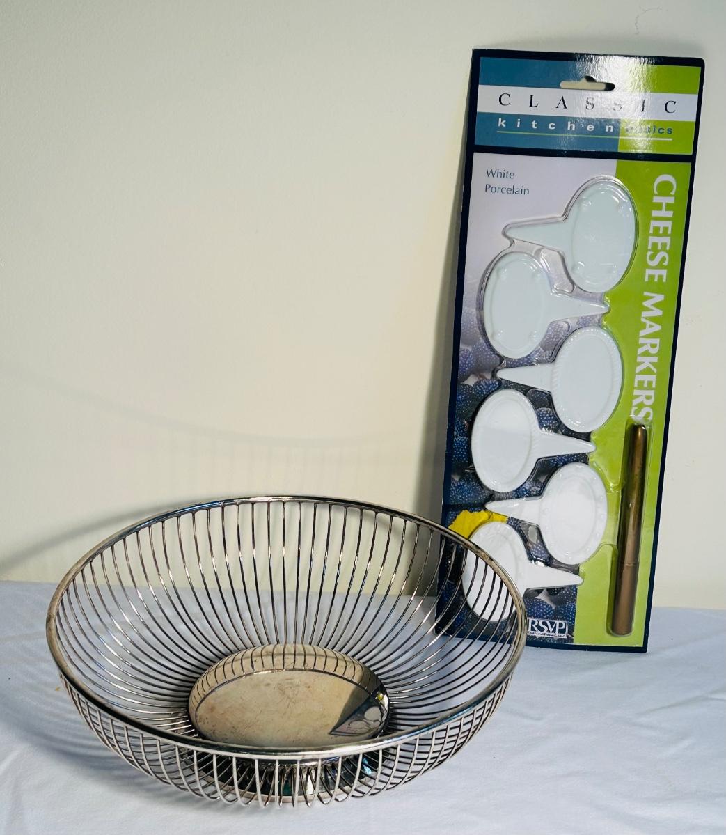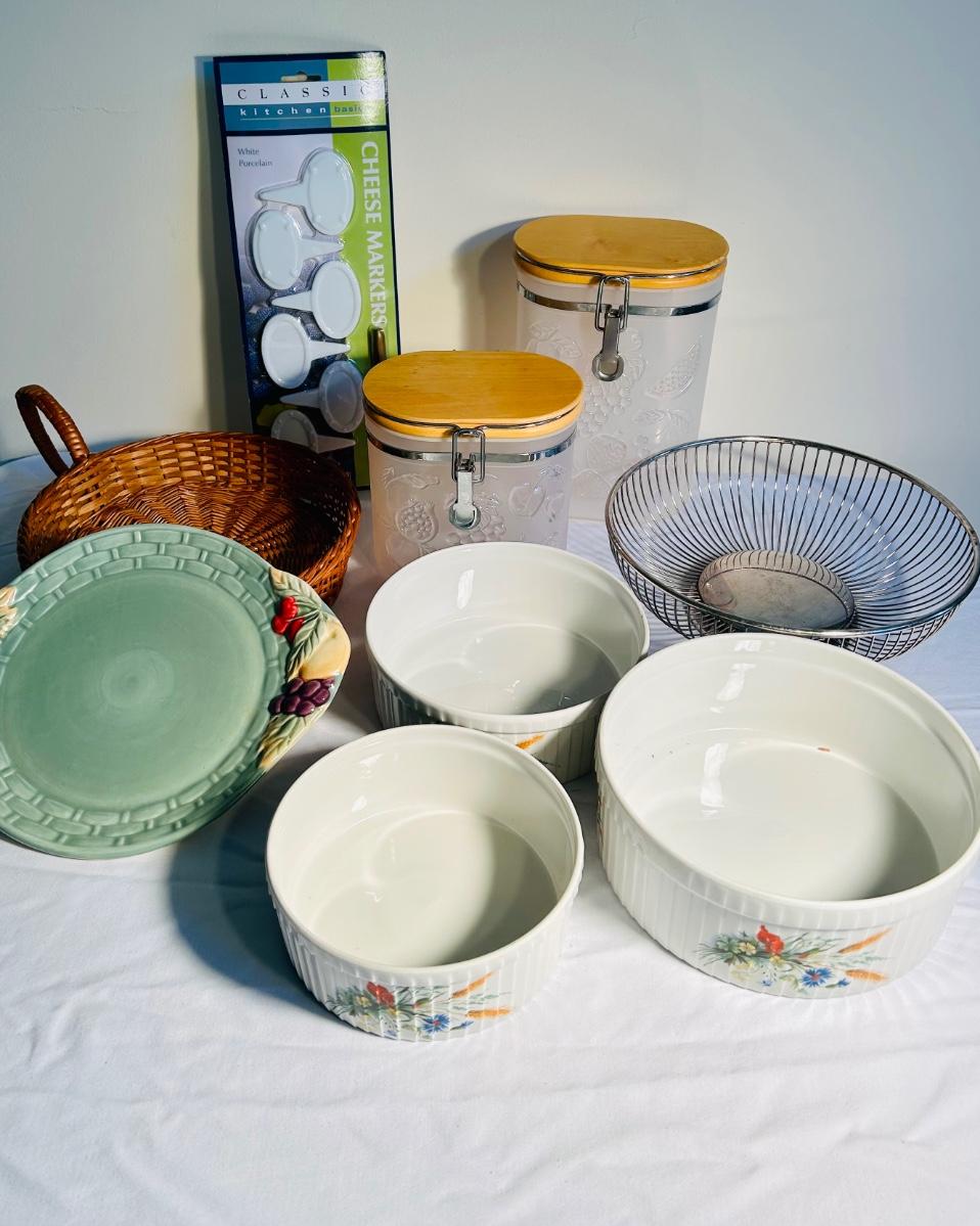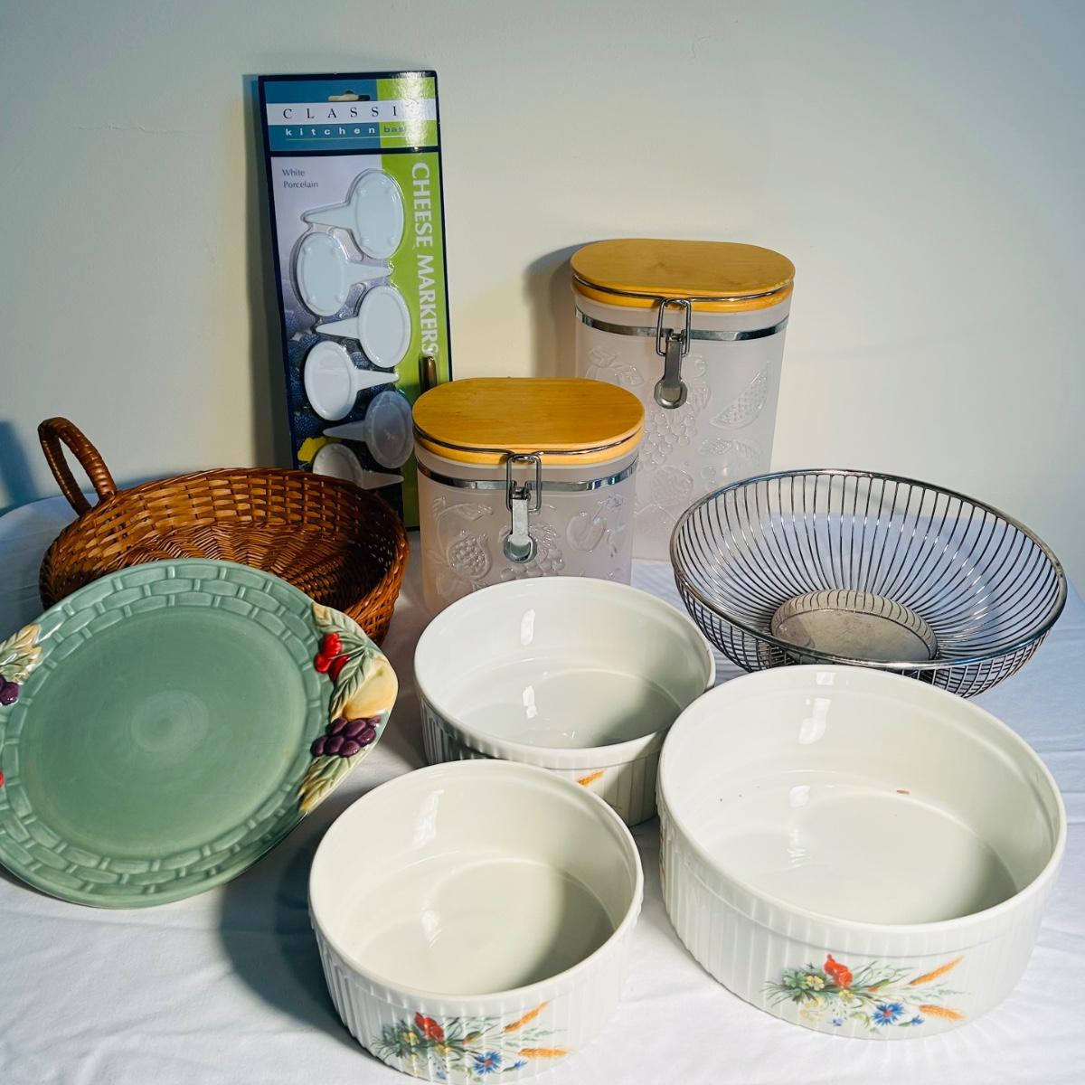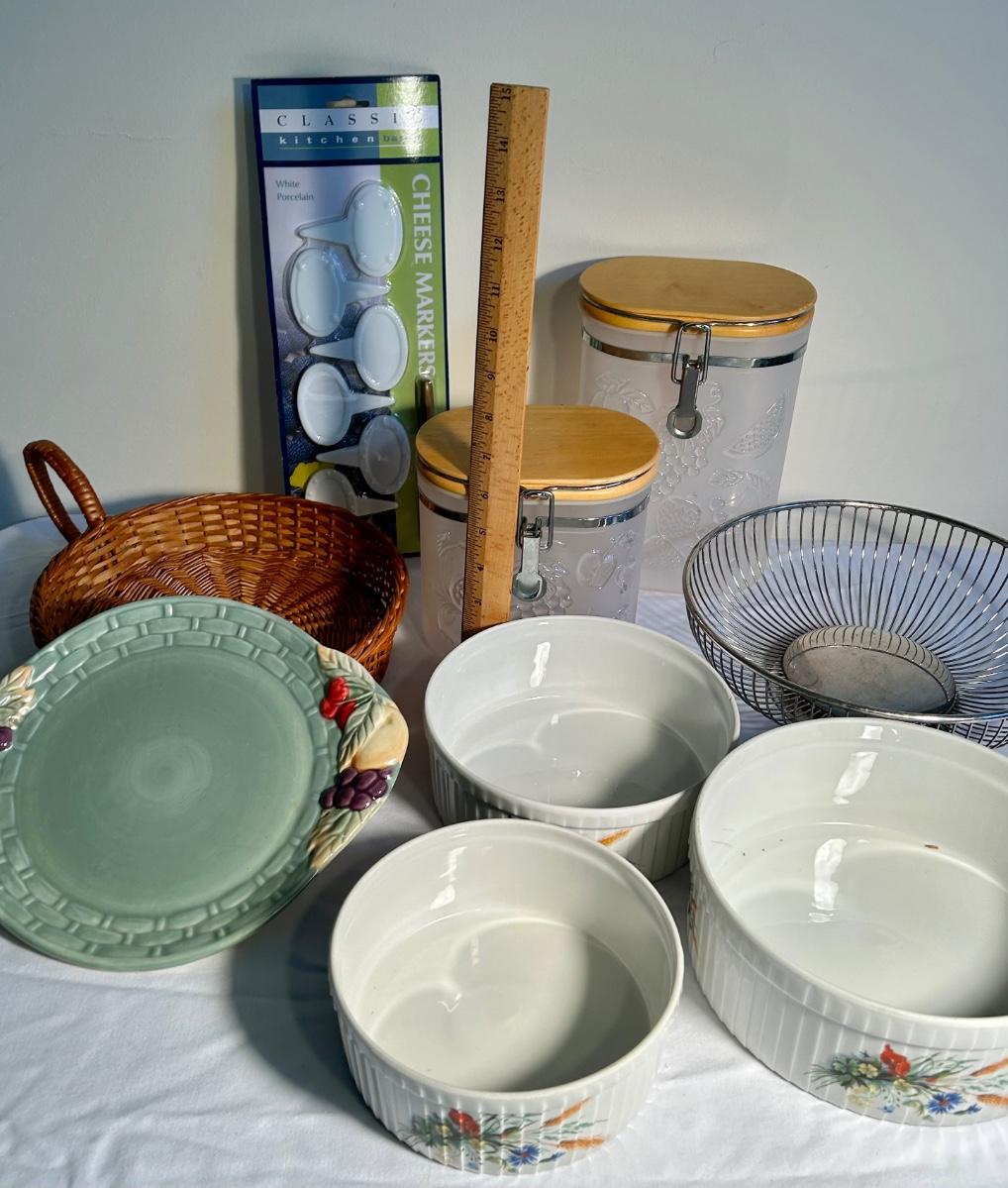 LOT 51K: Kitchenware - Canisters, Metal Bread Basket, Cheese Markers And More