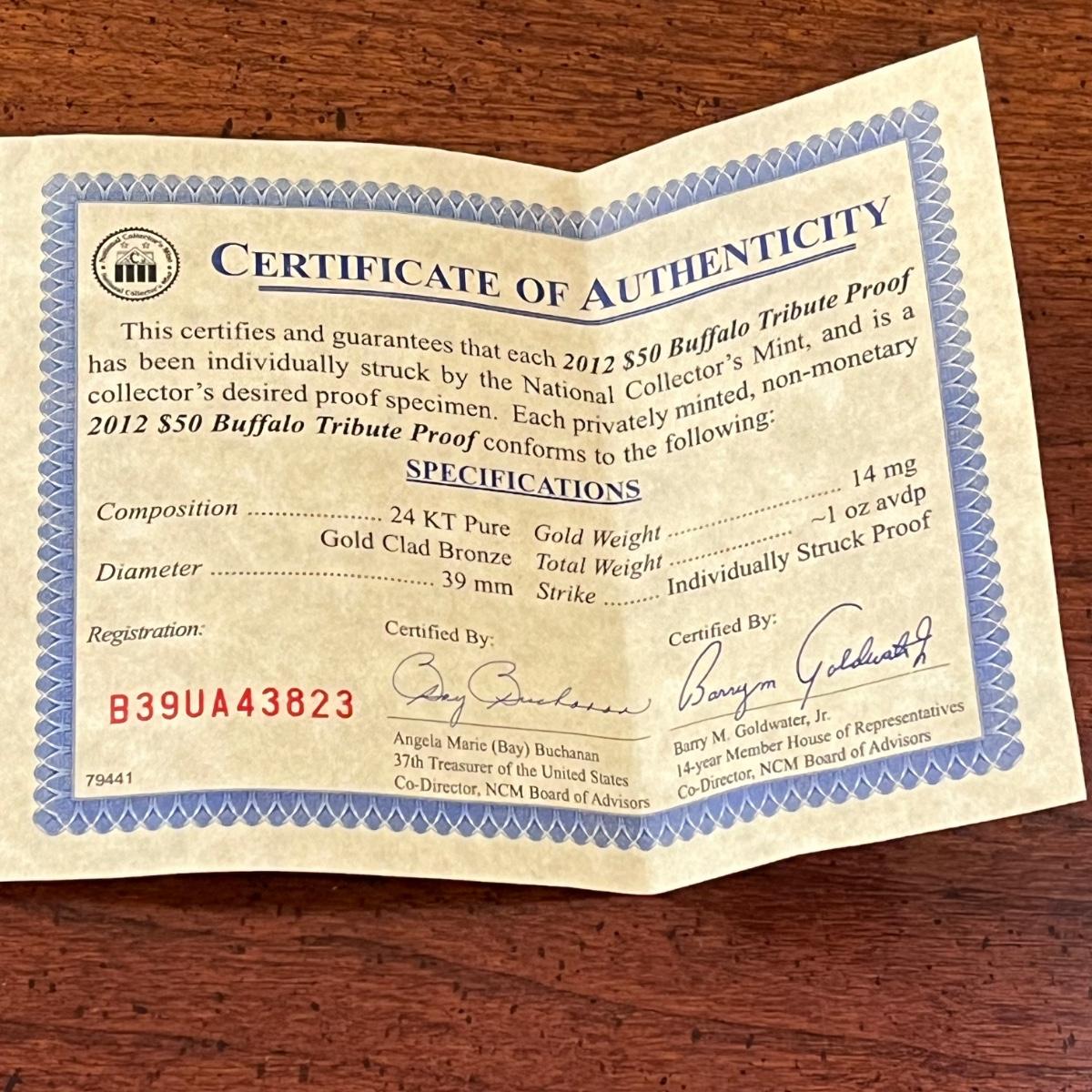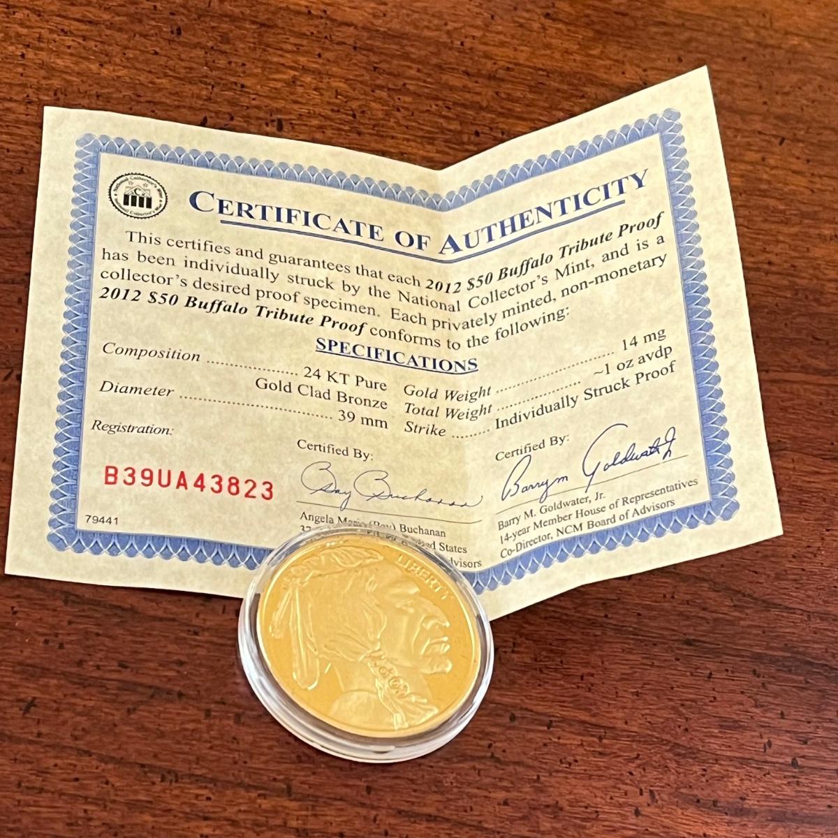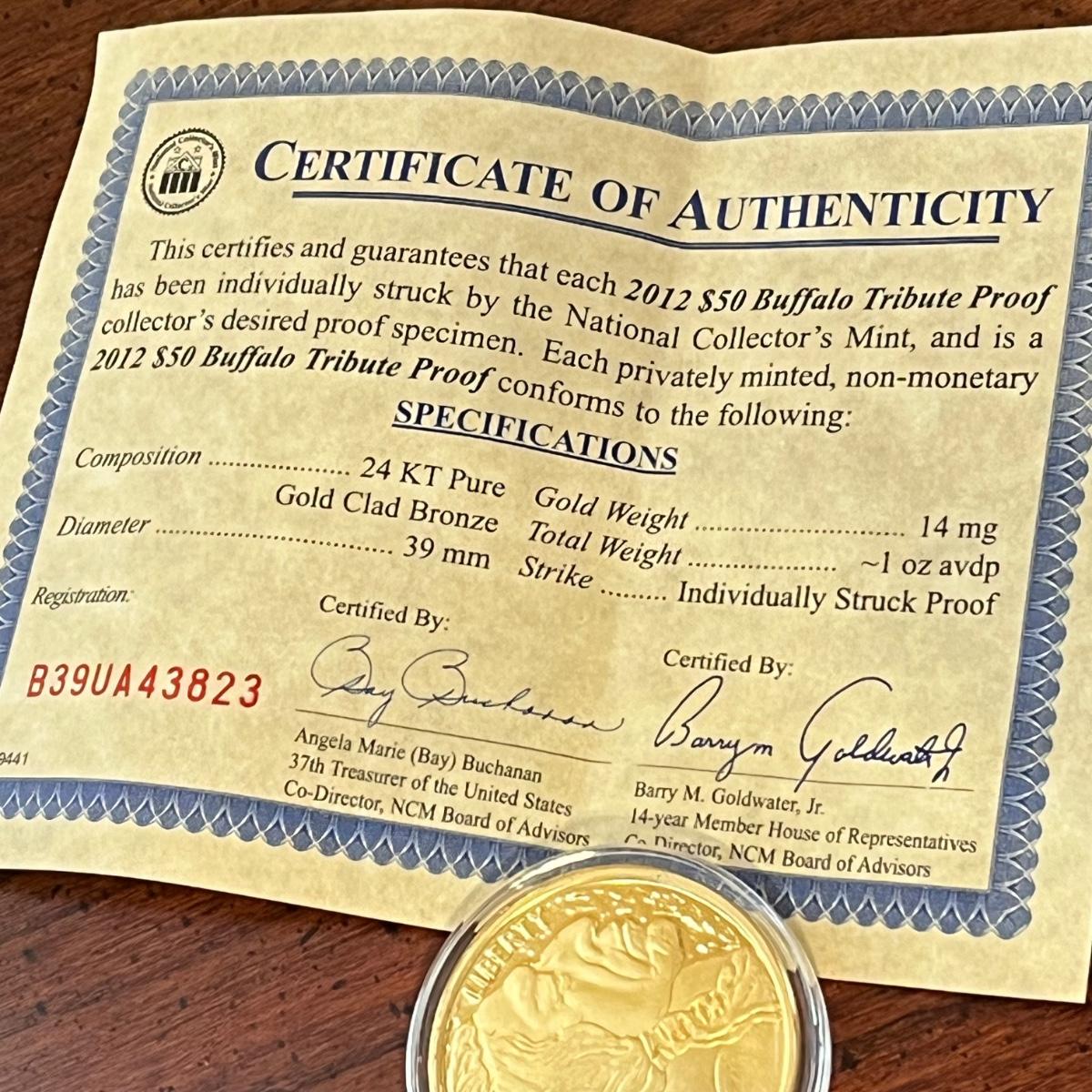 LOT 83L: 24K Gold Clad 2012 $50 Buffalo Tribute Proof from National Collector's Mint w/ COA and More
