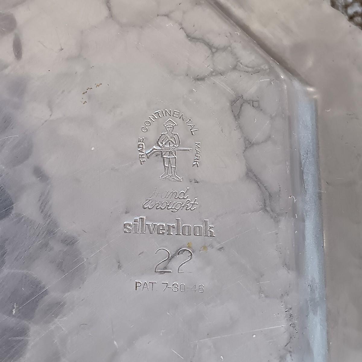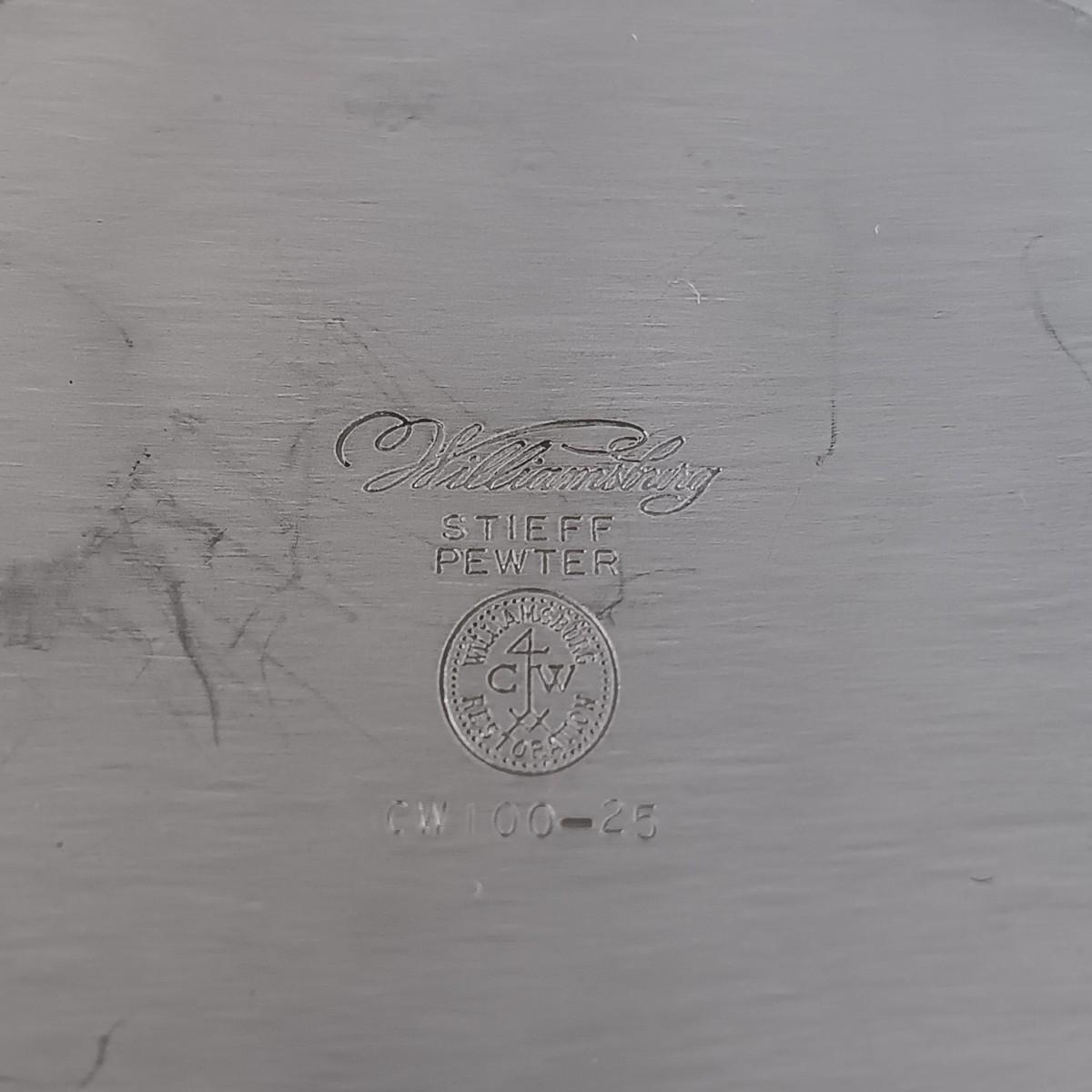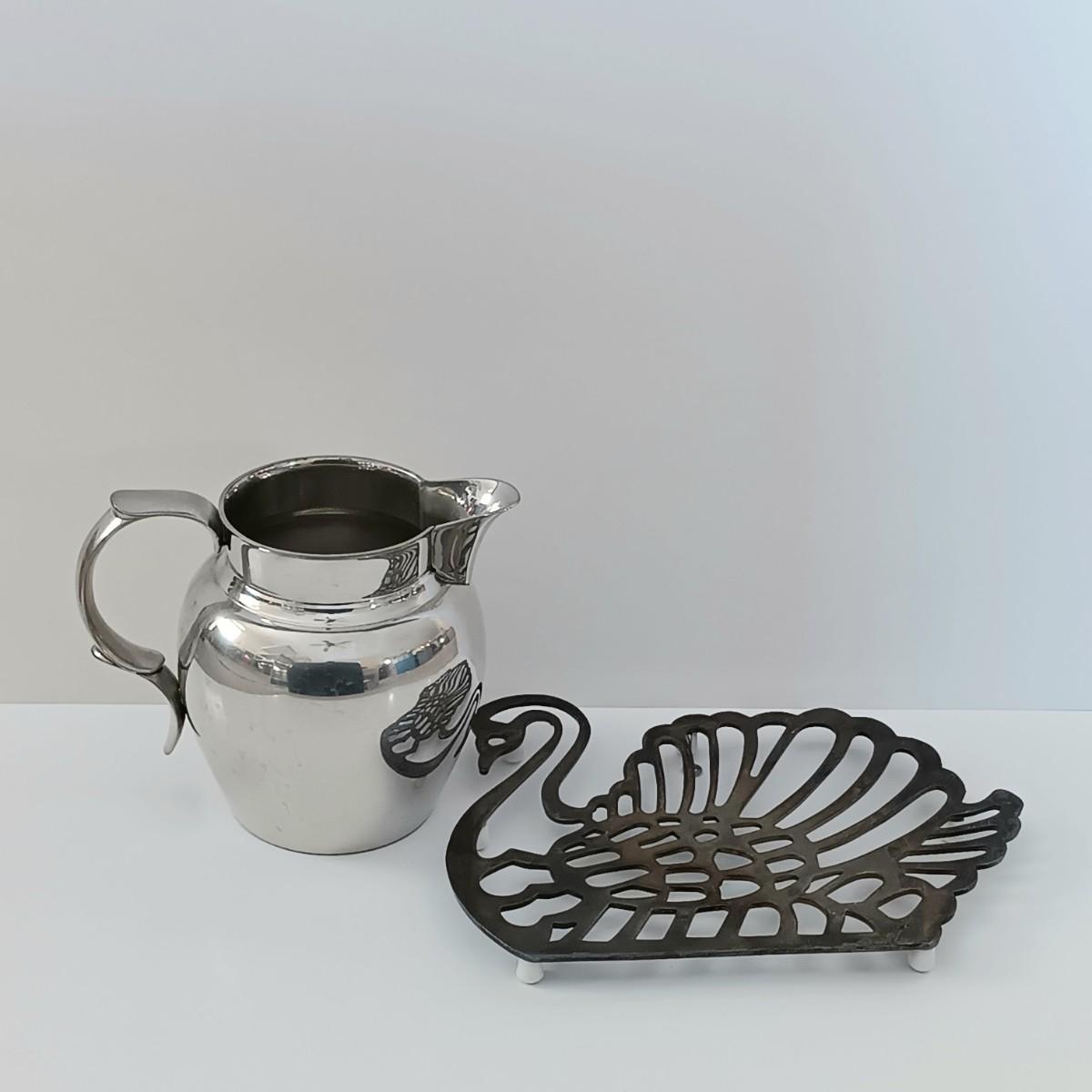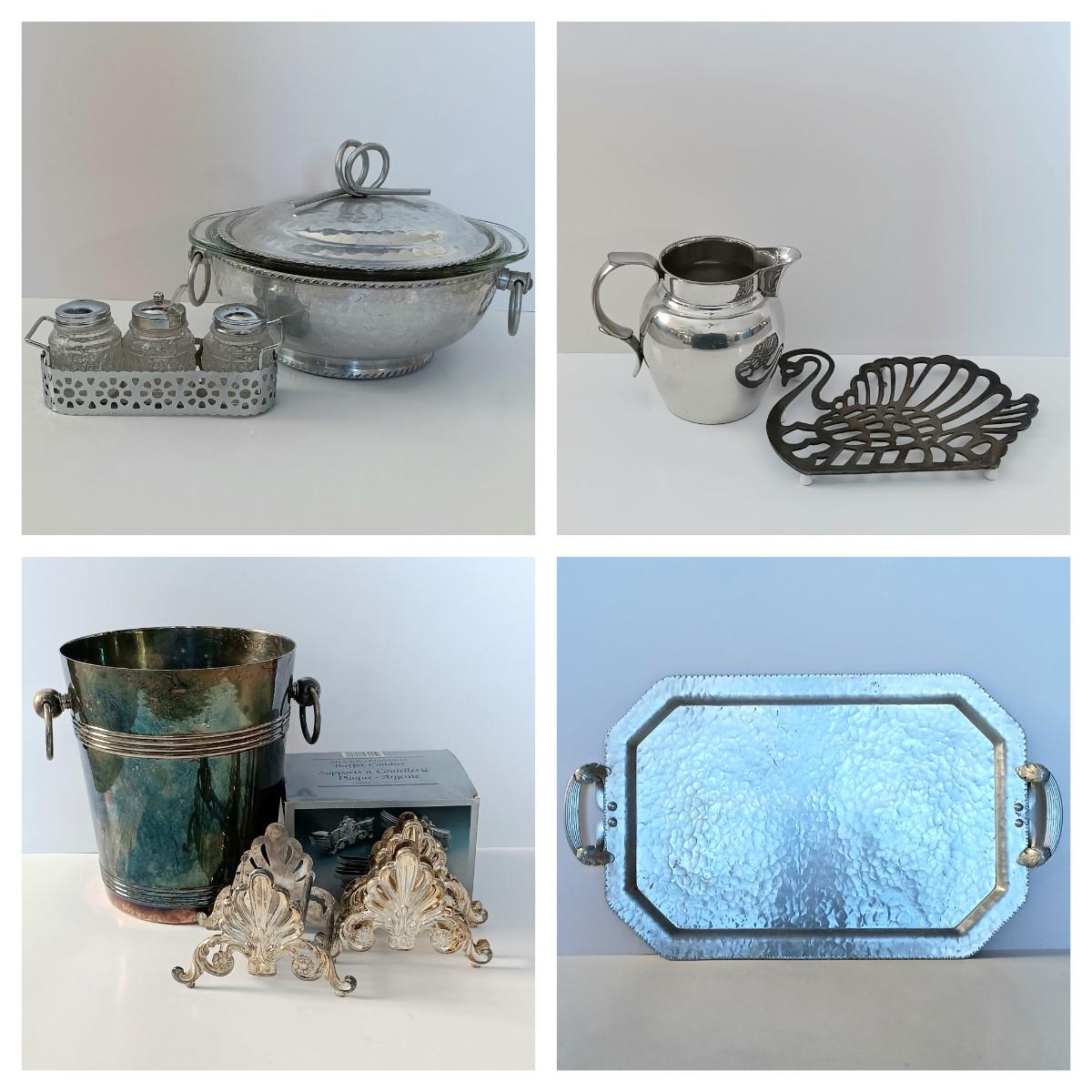 LOT 8L: F.B. Rogers Silverplated Swan Trivet, Trade Continental Handwrought Tray, Williamsburg Stieff Pewter Pitcher & More