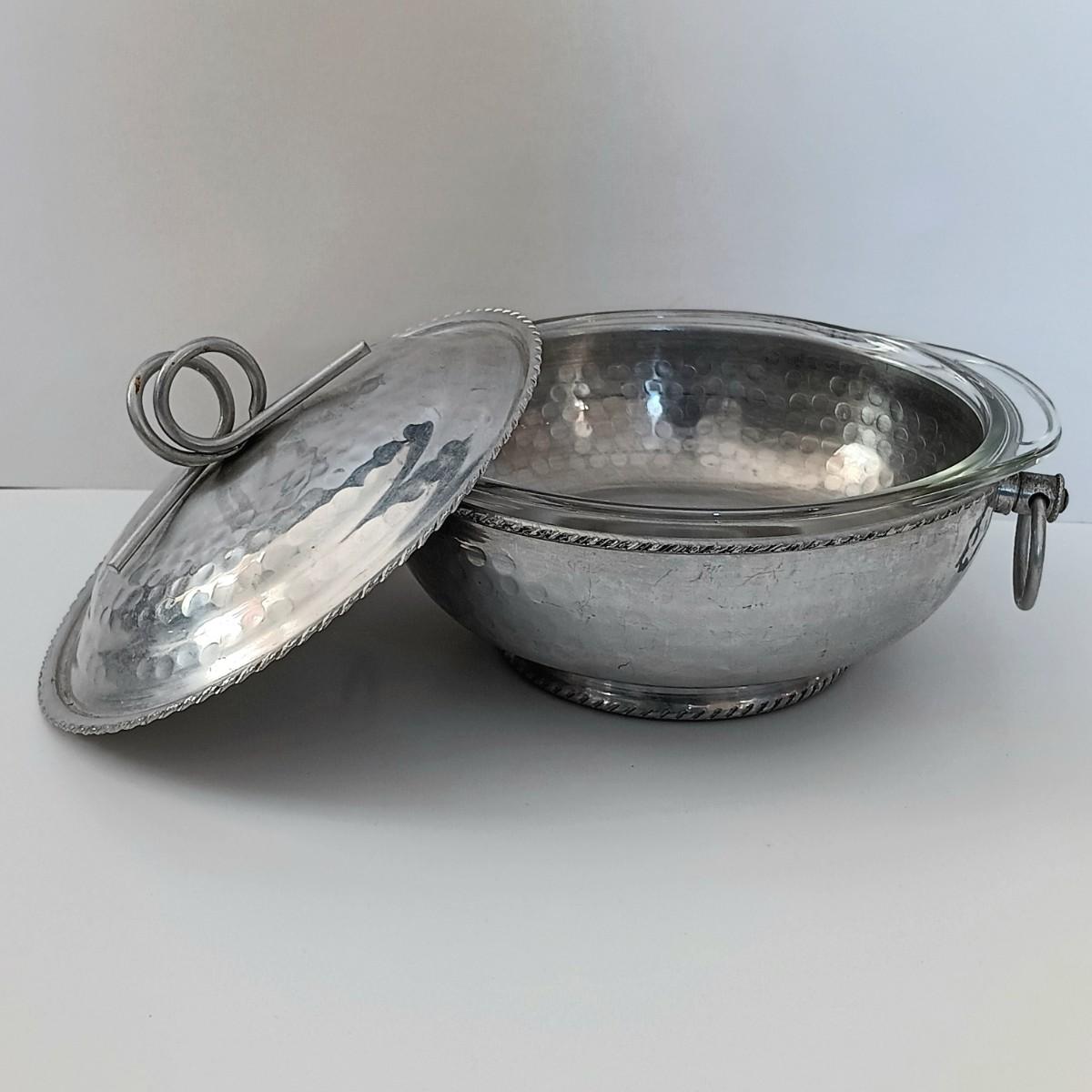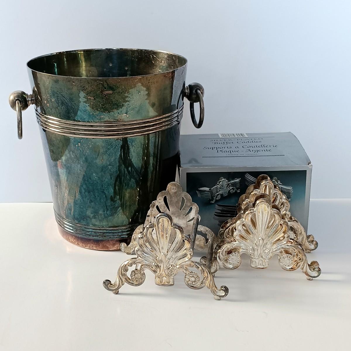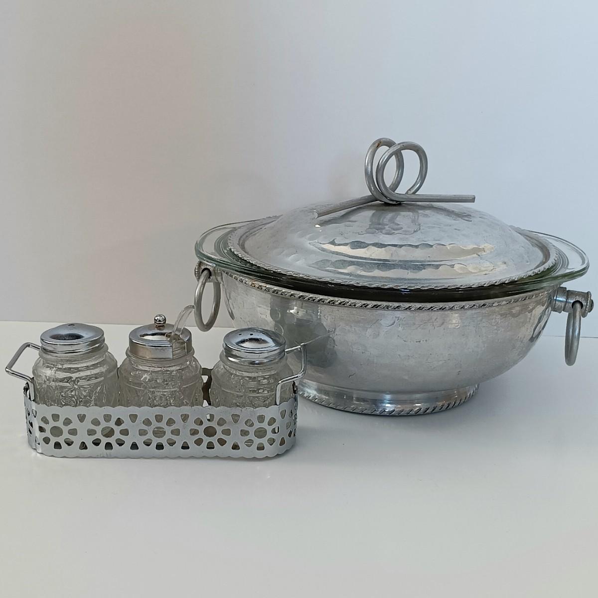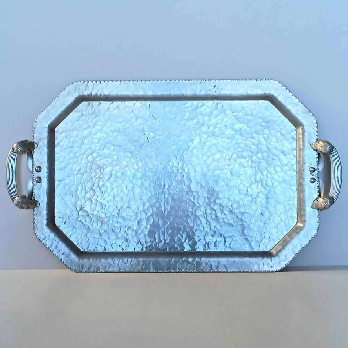 LOT 8L: F.B. Rogers Silverplated Swan Trivet, Trade Continental Handwrought Tray, Williamsburg Stieff Pewter Pitcher & More