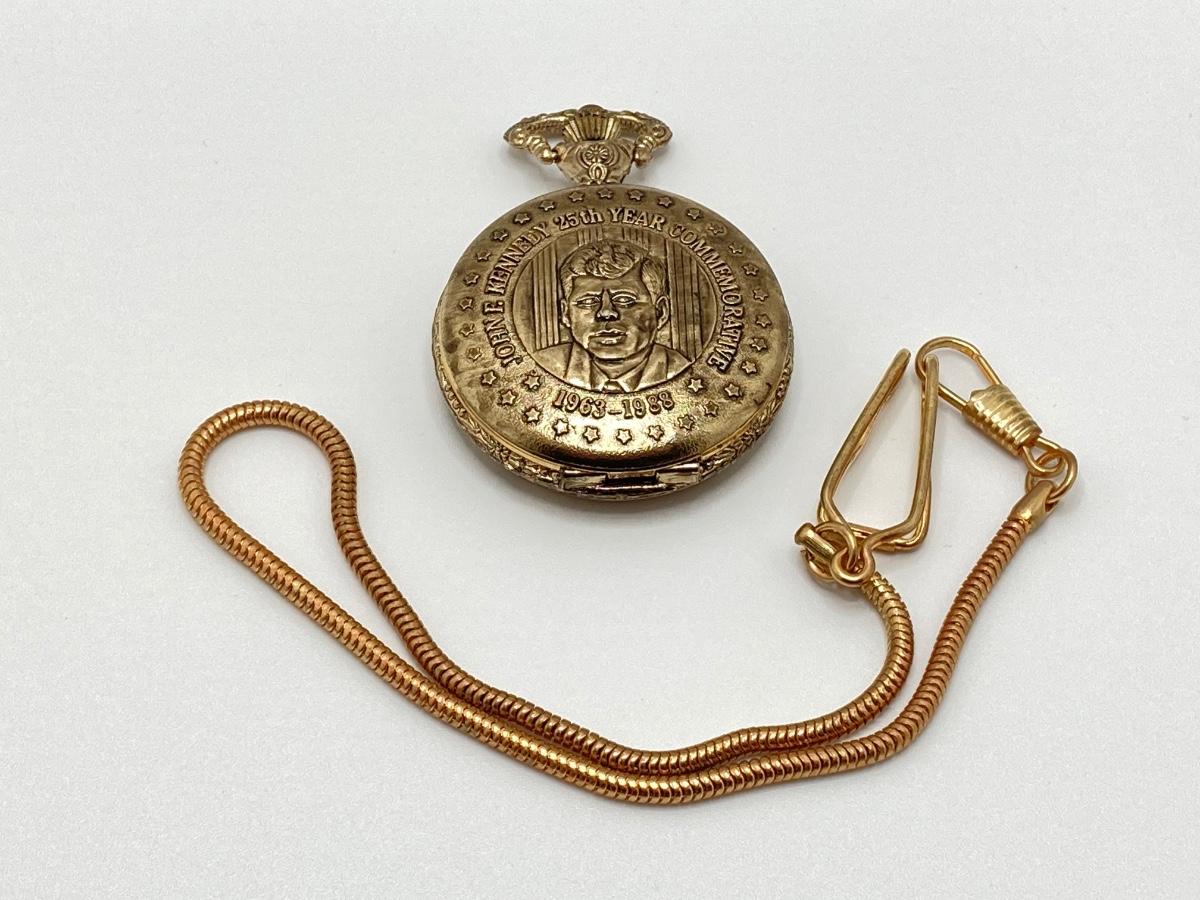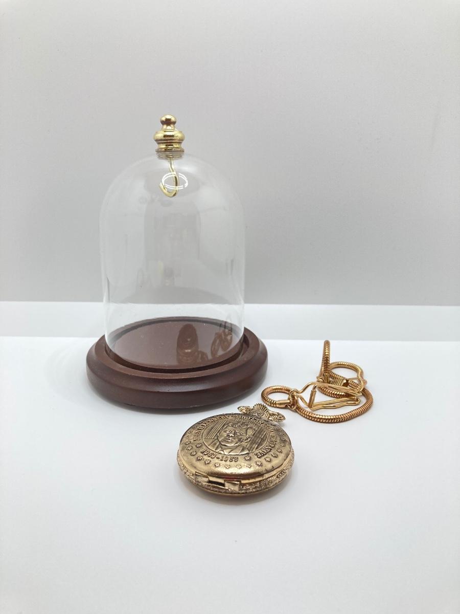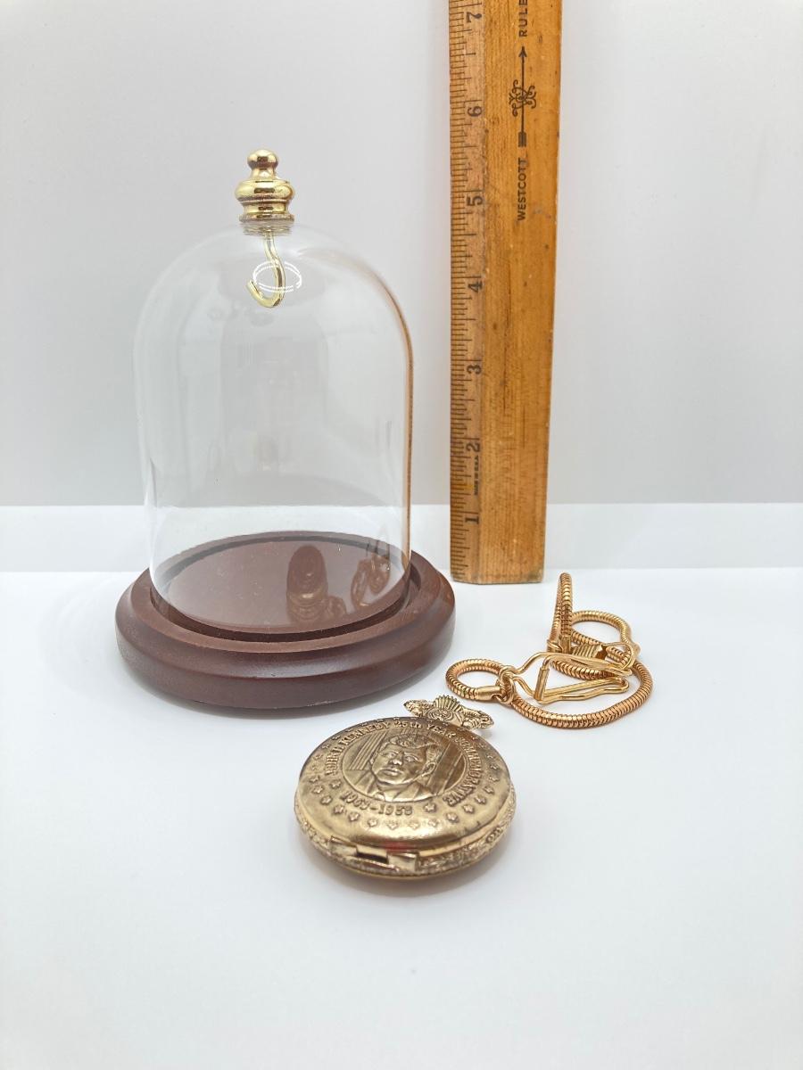 LOT 48J: John F. Kennedy 25th Year Commemorative Pocket Watch with Glass Dome Display Cloche